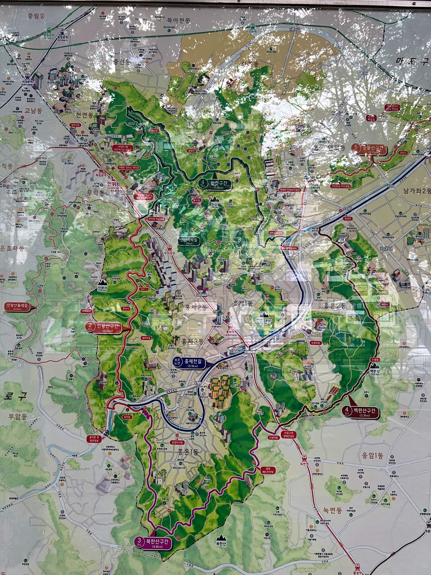 안내표지판에 큰 지도를 보면 안산자락길을 비롯해 인왕산구간의 길과 북한산구간, 백련산구간, 인왕산둘레길 등 넓게 펼쳐진 둘레길을 볼 수 있습니다. 그 중 제가 올라갔던 구간은 안산구간에 있는 안산자락길과 봉수대였습니다. 다음엔 저 다양한 구간의 길들을 찾아가볼까 해요.