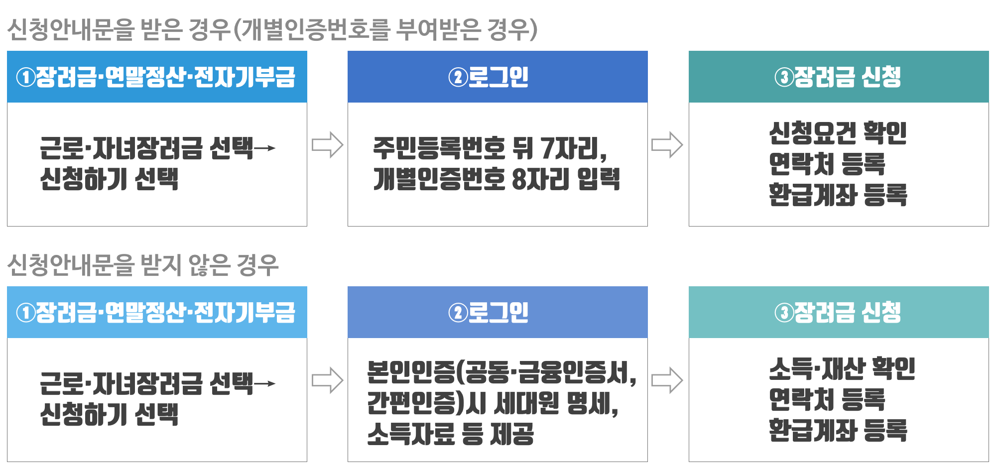 *신청안내문을 받지 않은 경우 로그인 → 장려금 · 연말정산 · 전자기부금 → 근로장려금 정기/반기 신청 → 직접입력신청에서도 신청가능