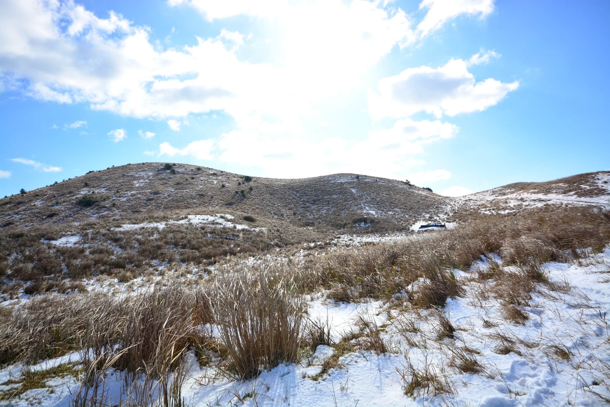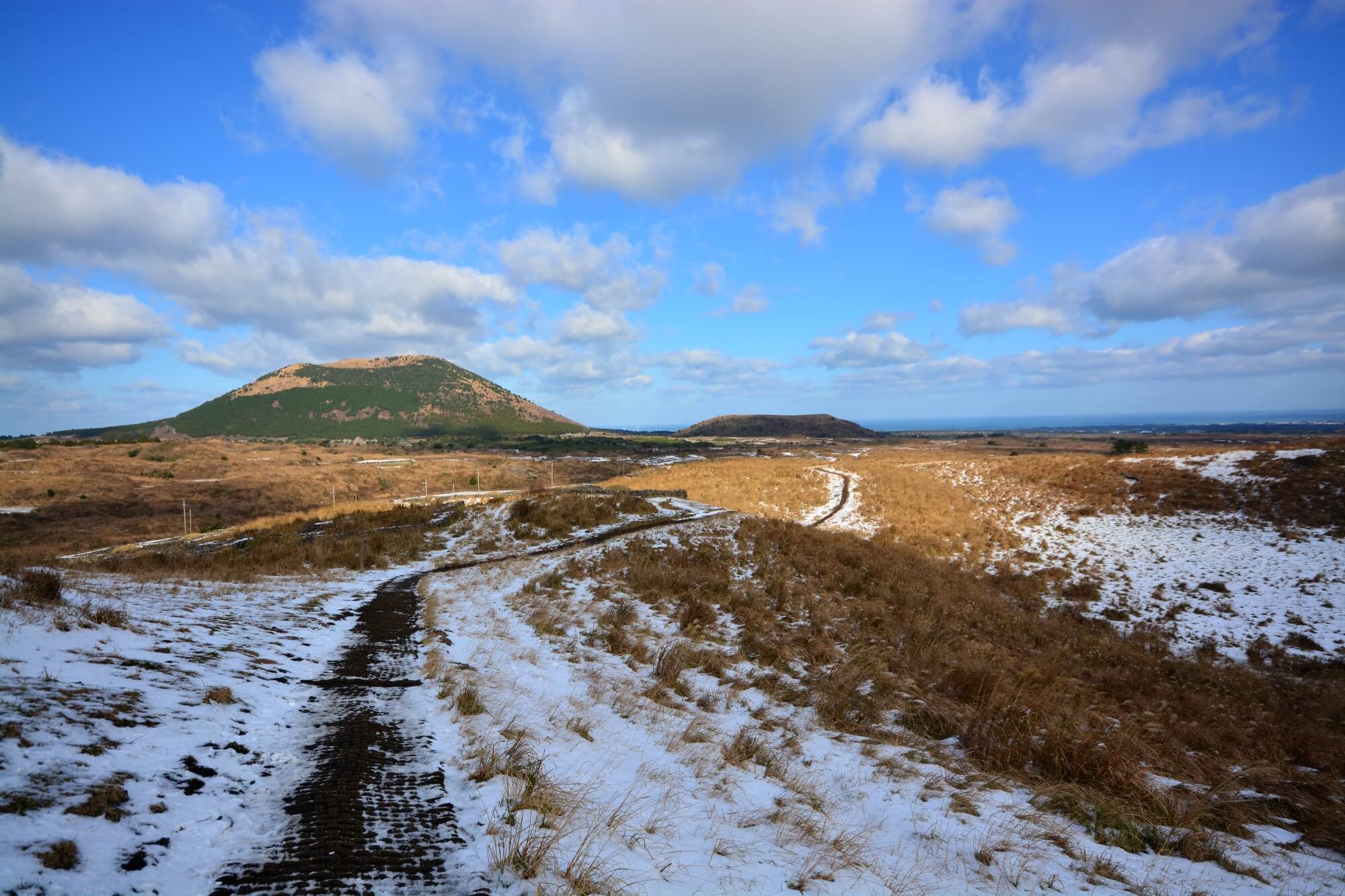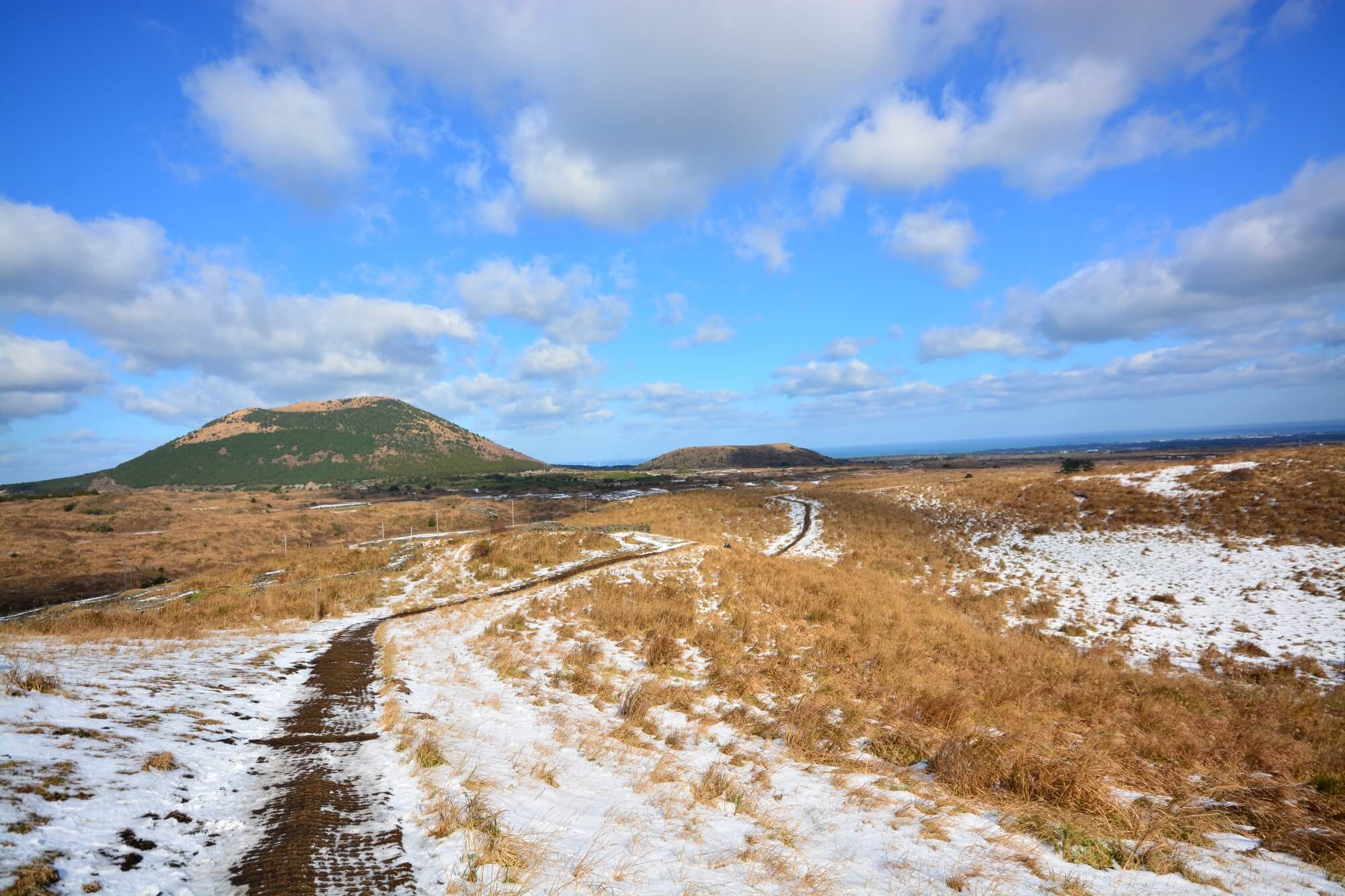 용눈이 오름에 눈이 내리면 희끗희끗한 새치처럼 듬성듬성 하얀눈을 볼 수 있습니다. 눈이 엄청 내려야 새하얗게 덮인 모습을 볼 수 있을텐데 그런 날이라면 차로 움직이기에도 어려운 날씨일테지요. 제주에 눈이 내리면 우선 교통이 마비되는 일이 많습니다. 제설작업이 턱없이 부족해 거북이운전을 하다 못해 차를 내버리고 가는 사람도 많기 때문이죠. 초보운전자들의 관광객들이 많아 대로변도 눈이 쌓이면 거의 멈춤상태가 되곤 합니다.