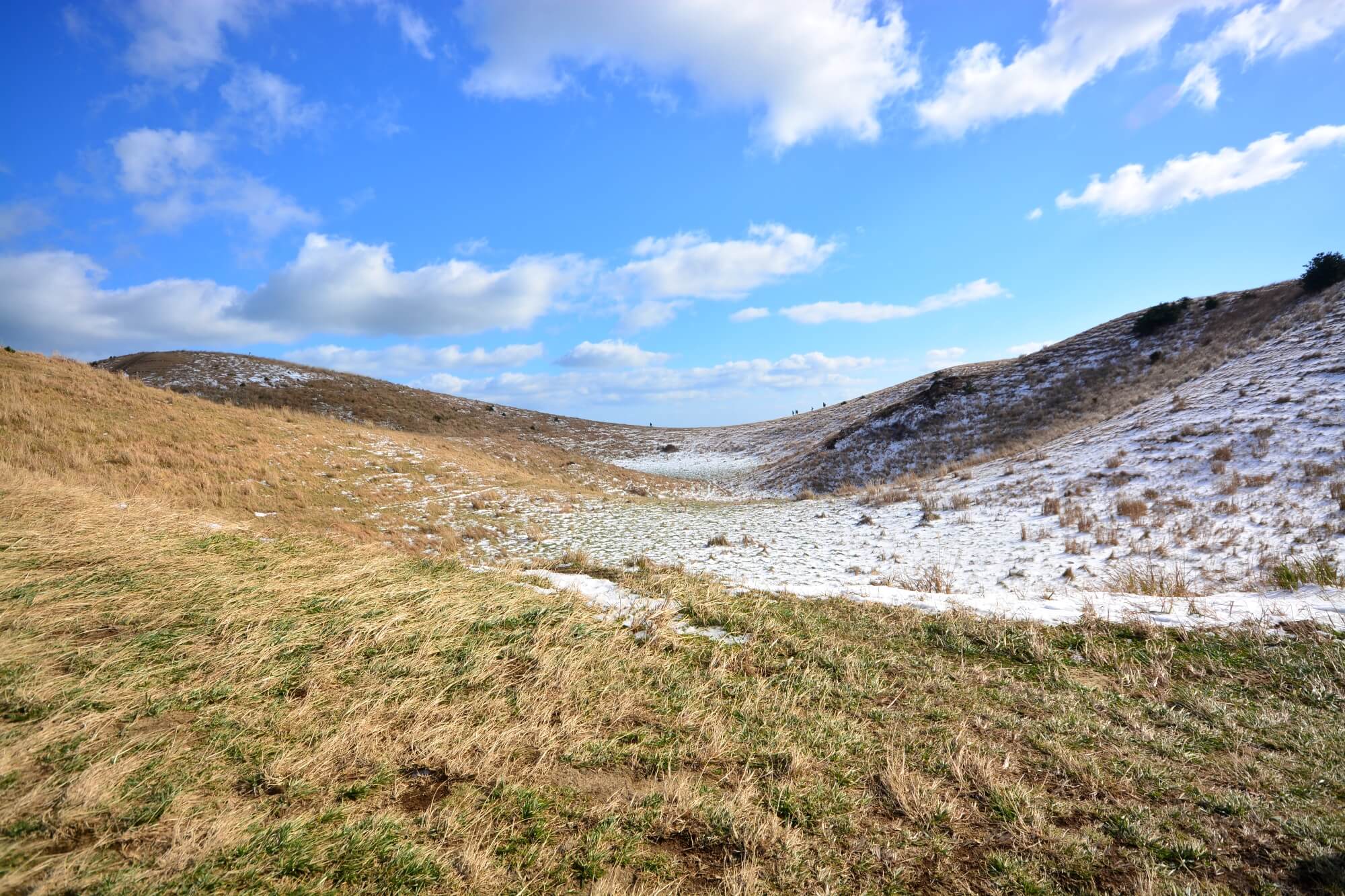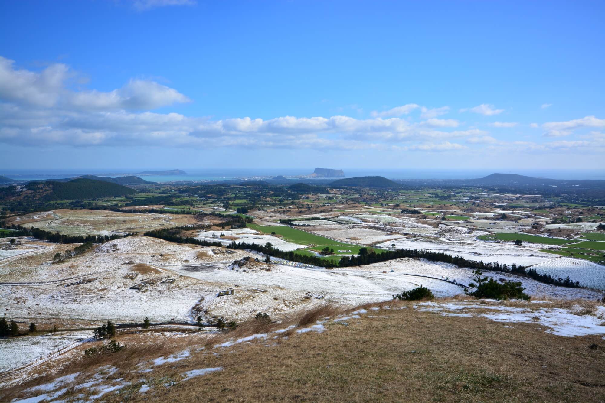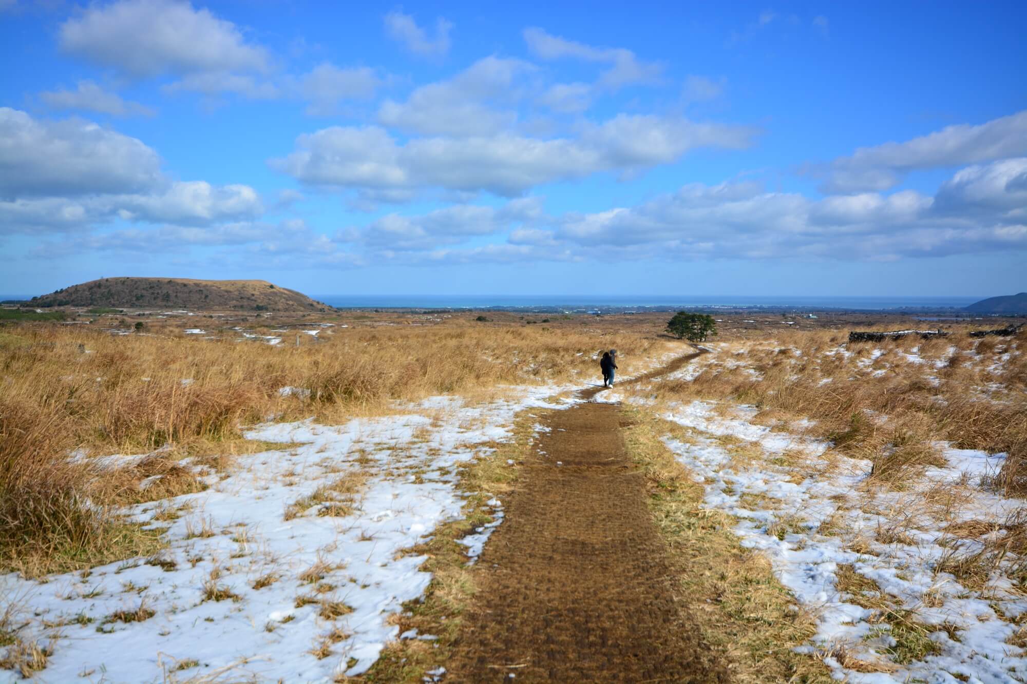 용눈이 오름에 눈이 내리면 희끗희끗한 새치처럼 듬성듬성 하얀눈을 볼 수 있습니다. 눈이 엄청 내려야 새하얗게 덮인 모습을 볼 수 있을텐데 그런 날이라면 차로 움직이기에도 어려운 날씨일테지요. 제주에 눈이 내리면 우선 교통이 마비되는 일이 많습니다. 제설작업이 턱없이 부족해 거북이운전을 하다 못해 차를 내버리고 가는 사람도 많기 때문이죠. 초보운전자들의 관광객들이 많아 대로변도 눈이 쌓이면 거의 멈춤상태가 되곤 합니다.