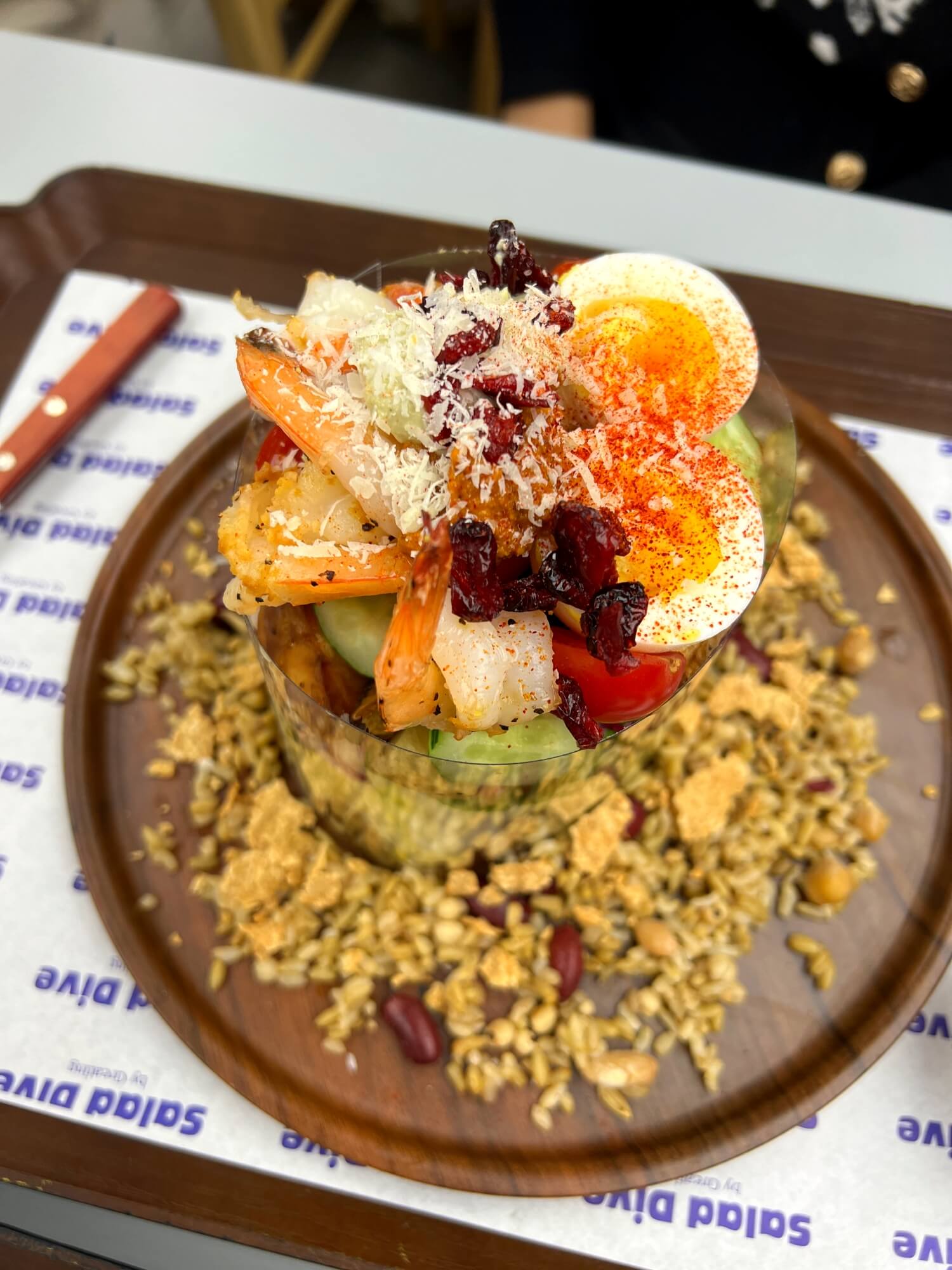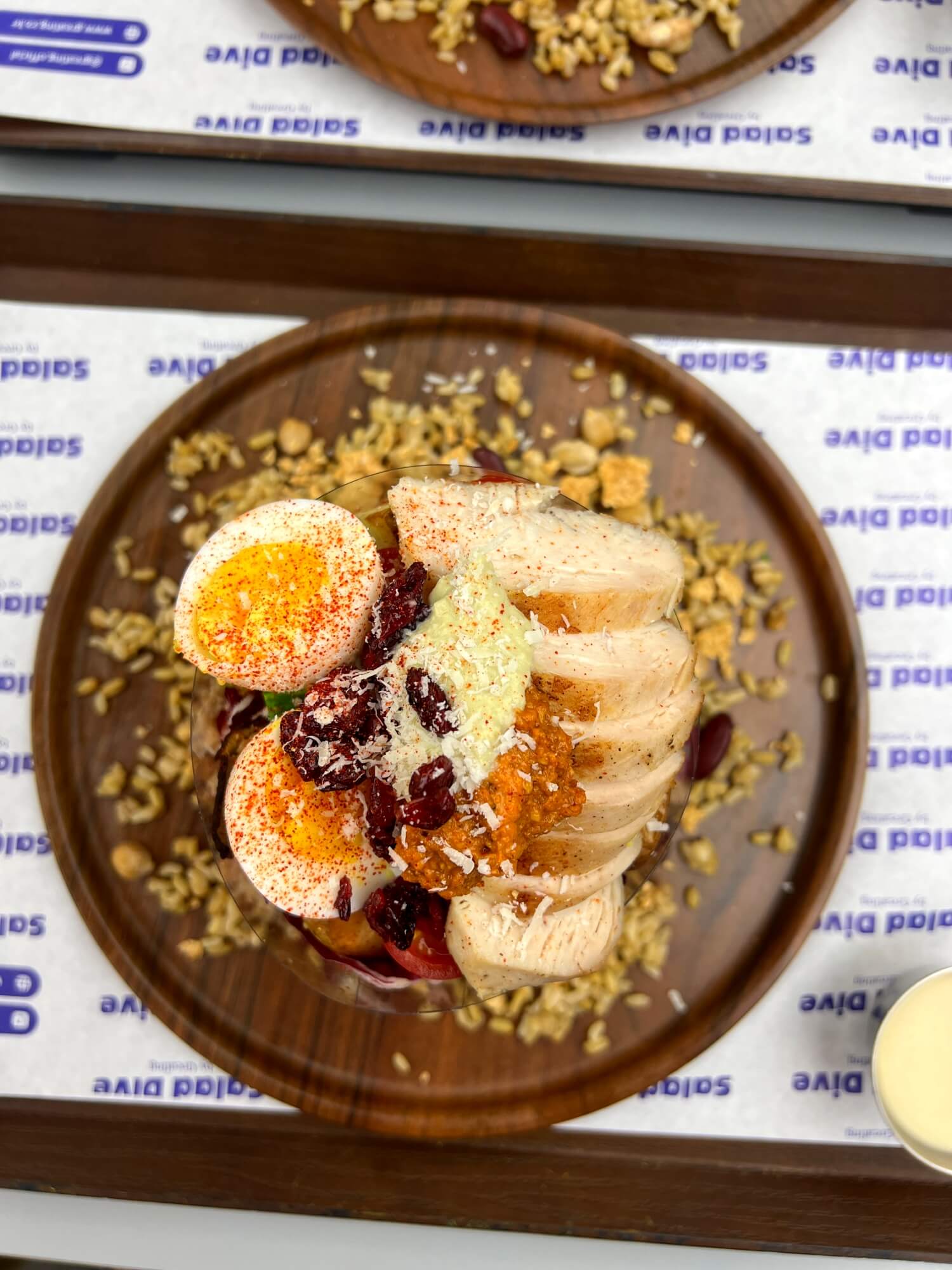 주문을 하고 한참을 후에 음식을 받으러 갔습니다. 샐러드다이브의 샐러드비주얼은 이렇듯 케익을 감싼 모양으로 나옵니다. 야채가 한가득 깔려있고 그 위로 계란, 과일 감자, 메인토핑 등으로 예쁘게 쌓아올려준다는 점입니다. 보기만해도 맛깔스러운 모습이에요. 접시에는 잡곡과 콘푸레이크등이 펼쳐져 있습니다.