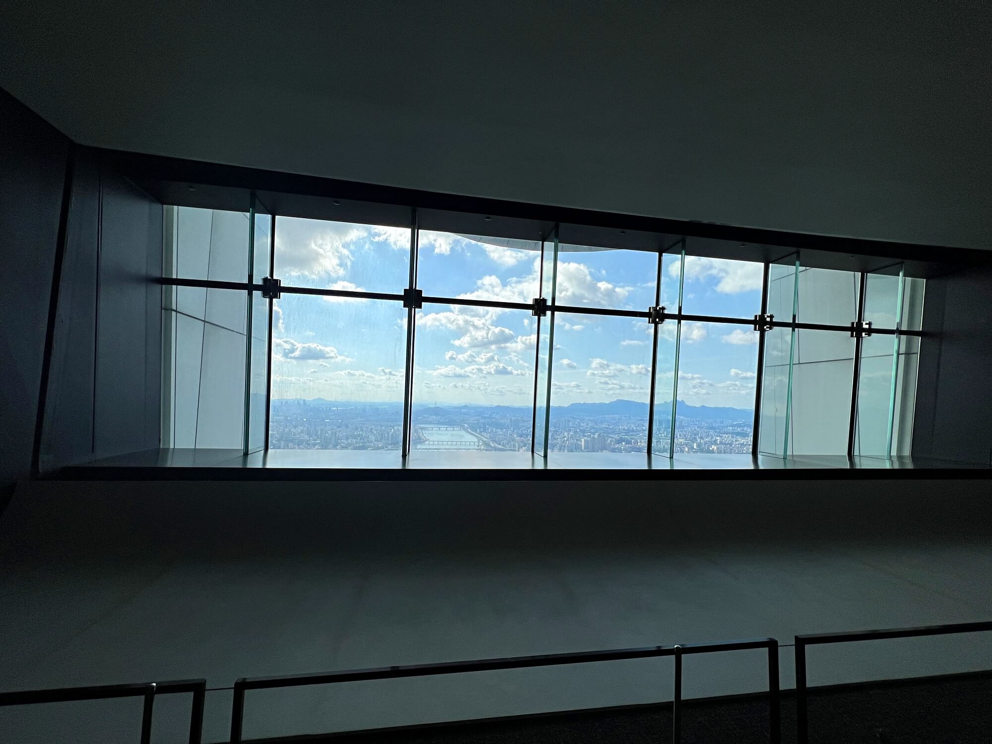 117층부터 121층까지가 관람층입니다. 엘리베이터를 타고 고속으로 올라가 117층에 내립니다. 내리면 영화상영관처럼 잠시 영상을 관람하게 해주는데 위 화면이 영상화면이에요. 대략 3~5분 정도 영상이 나온 후 상영관이 어둠에 쌓이는데 그때 스크린이 위로 올라가면서 서울의 전망이 펼쳐집니다.