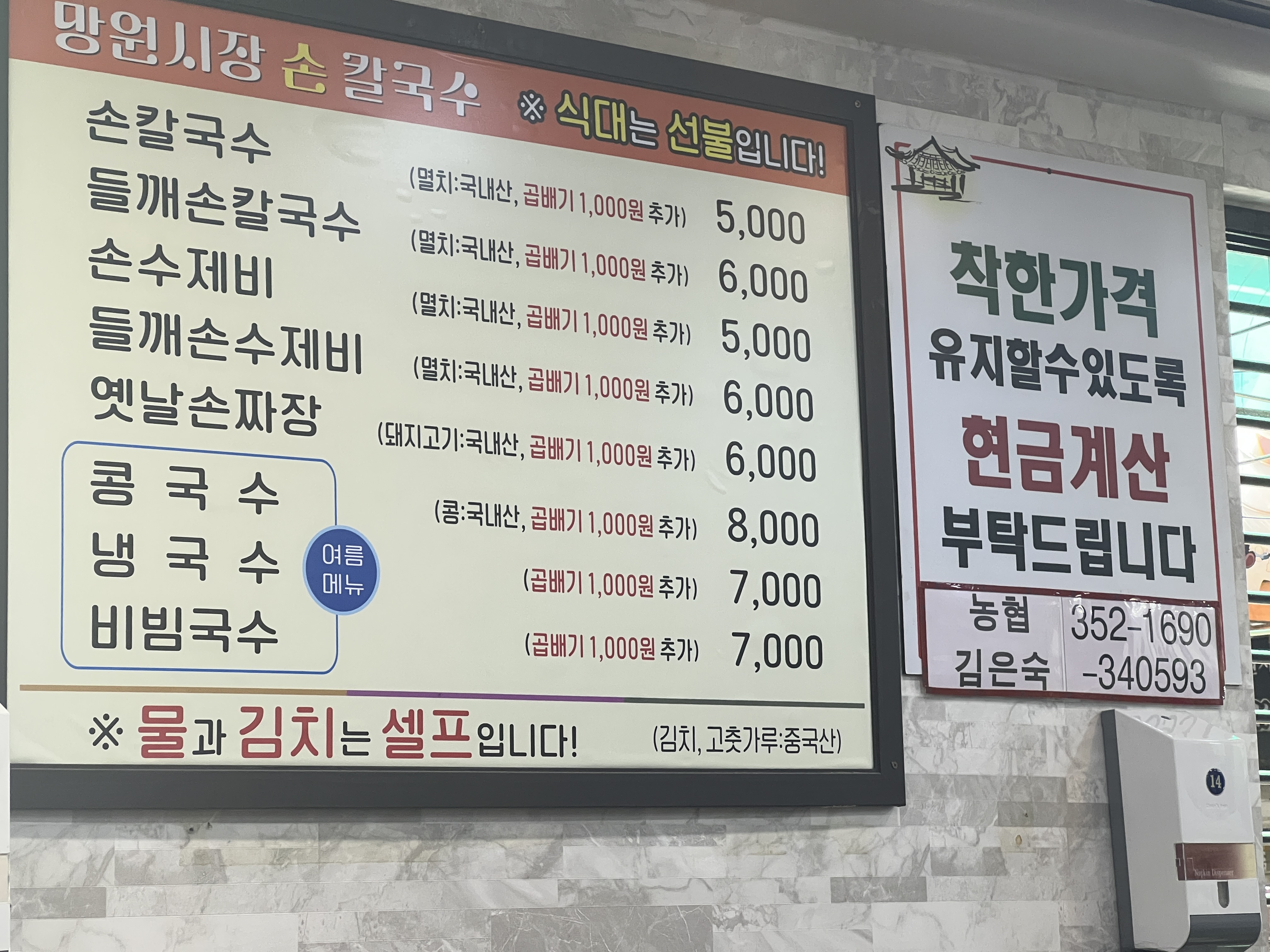 가격대를 둘러보니 이런 놀라운 가격이? 손칼국수가 한그릇에 5,000원이랍니다. 수제비도 그렇구요. 손칼국수와 손수제비를 주문했습니다. 육수는 항상 준비되있으니 칼국수는 주문이 들어오면 바로 끓여내는 것 같았어요. 양이 좀 적을 것 같다 싶으신 분들은 곱배기 추가해도 1,000원만 더 지불하시면 됩니다. 여름이라 냉콩국수도 많이들 드시는 것 같았습니다. 메뉴판을 자세히 들여다보니 옛날손짜장도 있네요. 짜장면이 생각날때 와도 될 것 같네요.