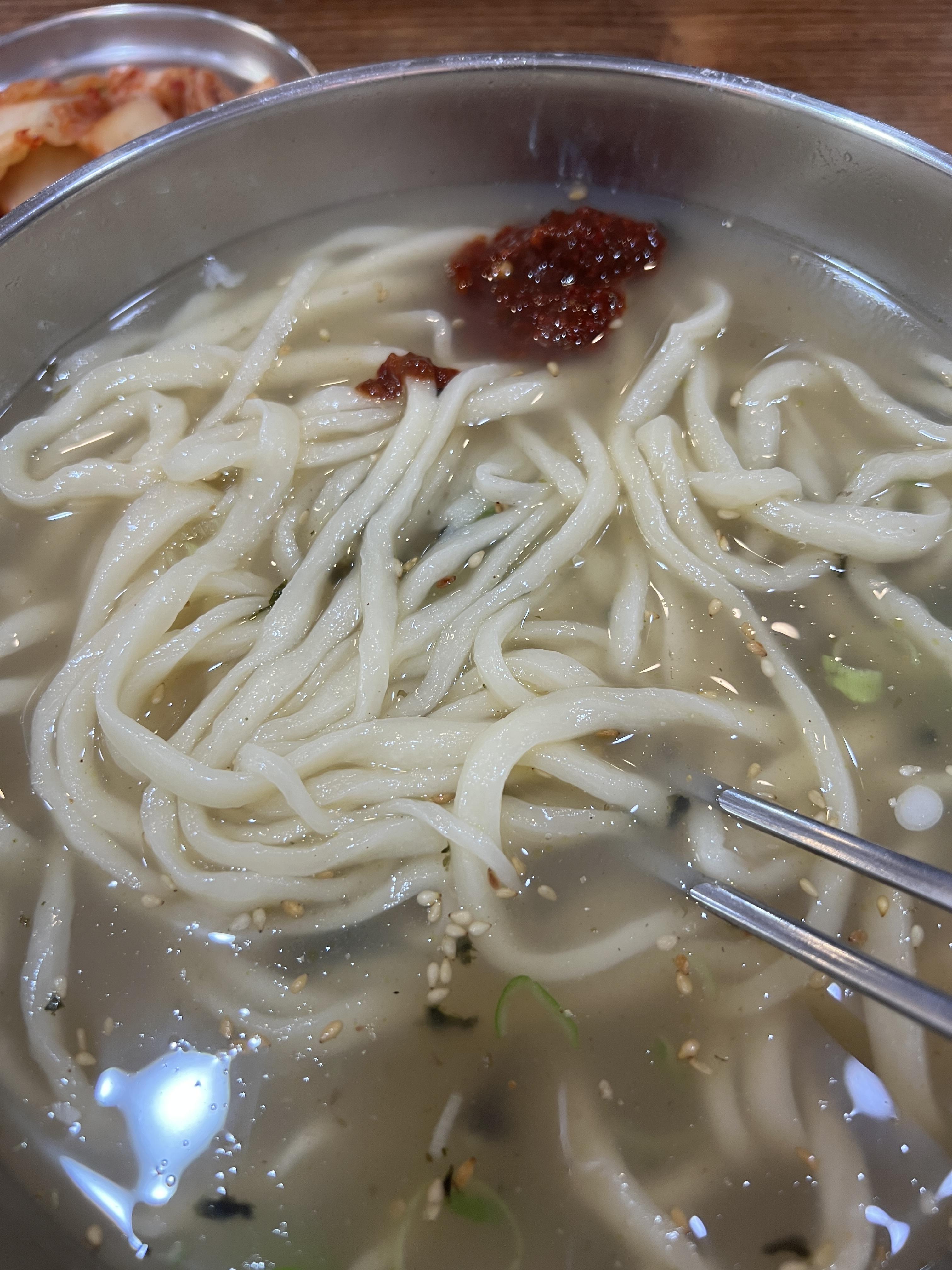 드디어 주문한 손칼국수와 손수제비가 나왔습니다. 저는 칼국수를 시켰는데 수제비도 정말 맛있어 보였어요. 어렸을 적 할머니에 해주시던 수제비가 생각났습니다. 다음엔 꼭 수제비를 먹어보려고 합니다. 멸치육수향이 가득한 것이 진정 멸치를 아끼지 않고 우려냈구나 싶었습니다. 엠에스지가 없는 맑고 투명한 맛이었어요. 저는 할머니가 집에서 칼국수나 수제비를 해주실 때도 고추장을 좀 넣어서 먹었던 기억이 있는데요, 다데기가 있어서 조금 더 칼칼하게 먹었습니다. 면발이 쫀득하고 집에서 직접 만들어 먹는 식감이라 옛날 생각도 나고 기분까지 맛있어지는 시간이었습니다. 소식하는 저에게 저 칼국수를 남길 수가 없어 국물은 포기하고 면을 다 먹어버렸습니다. 정말 가성비 맛집이라고 하지 않을 수가 없네요. 줄서서 먹어야만 하는 이유를 진정 알게됐습니다.