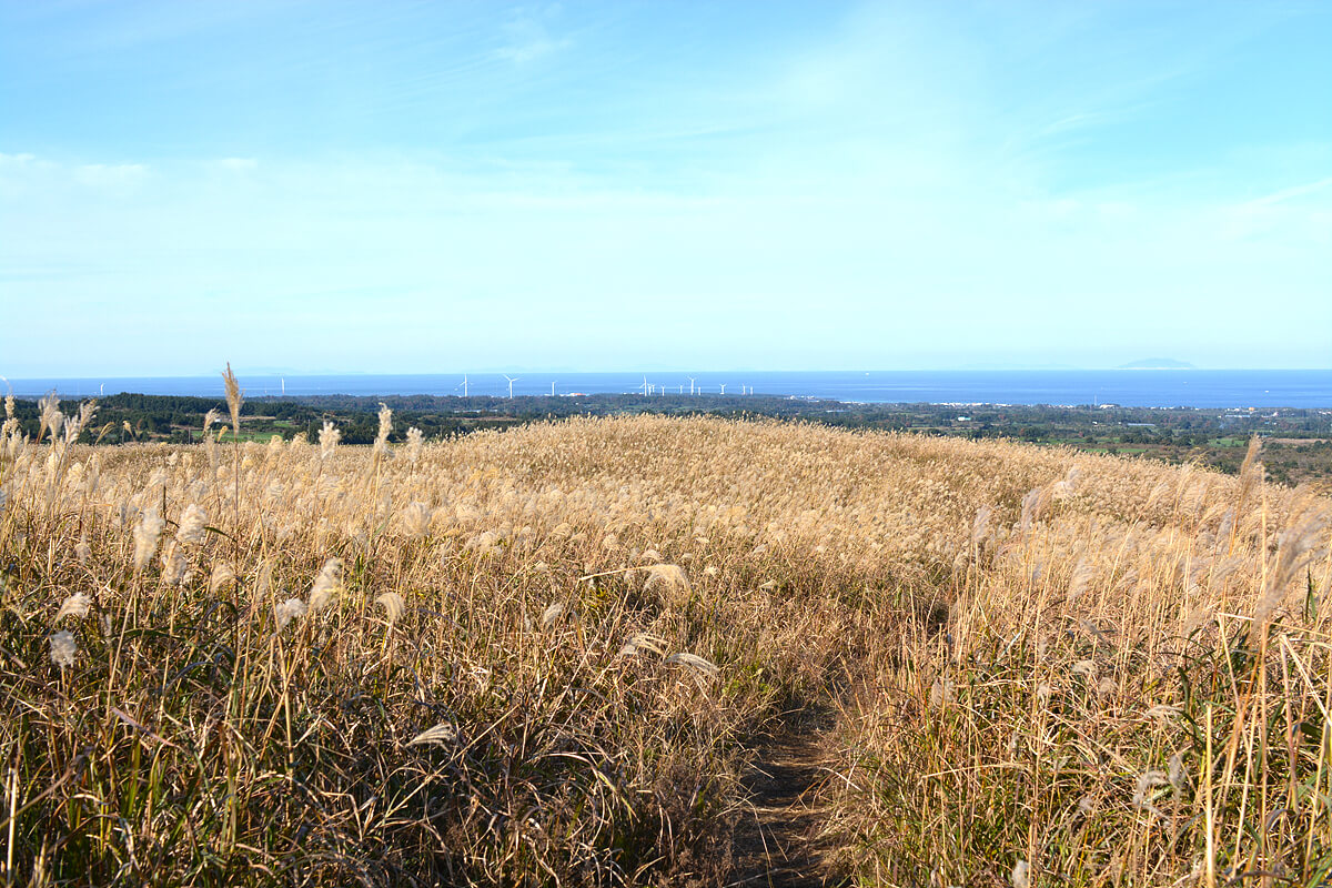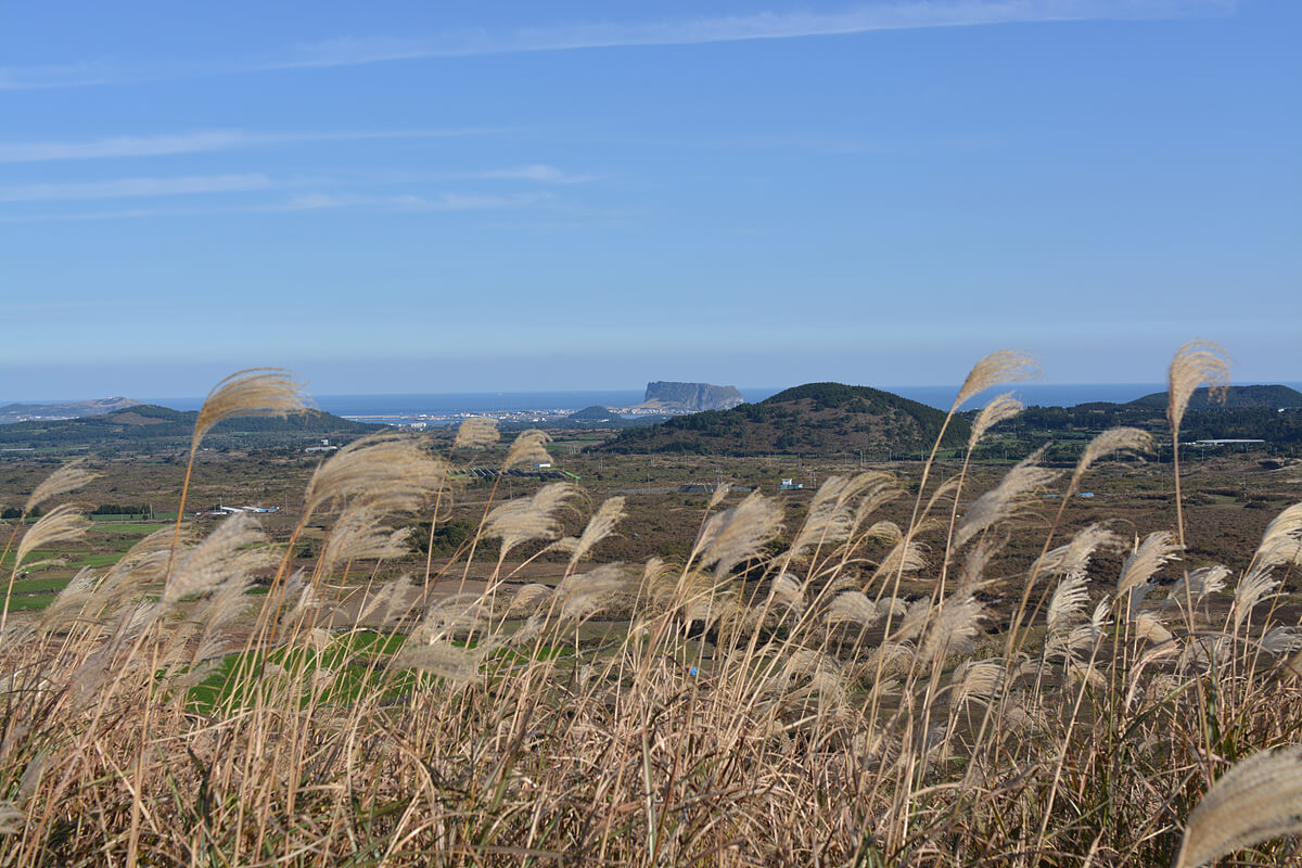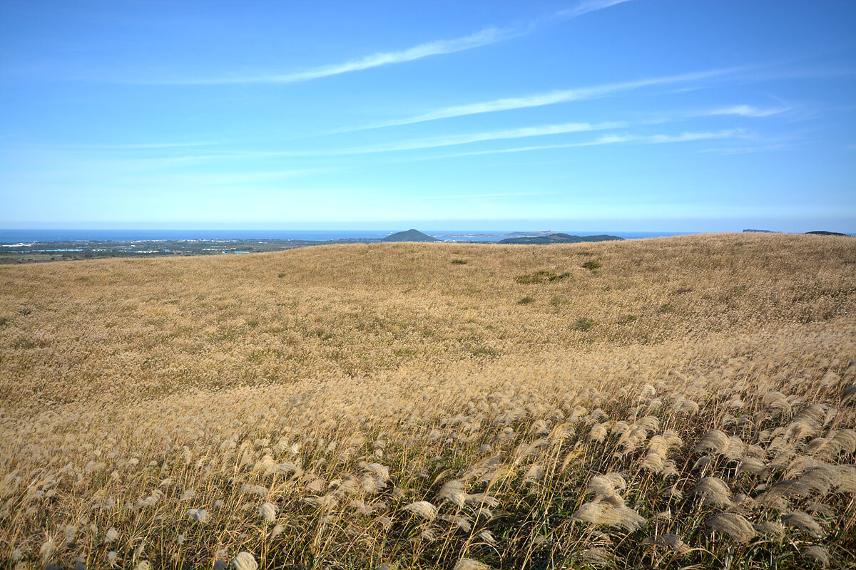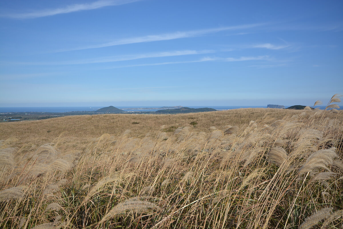 어디를 둘러봐도 온통 억새와 바다 뿐입니다. 그리고 주변에 오름들을 만나실 수 있어요.