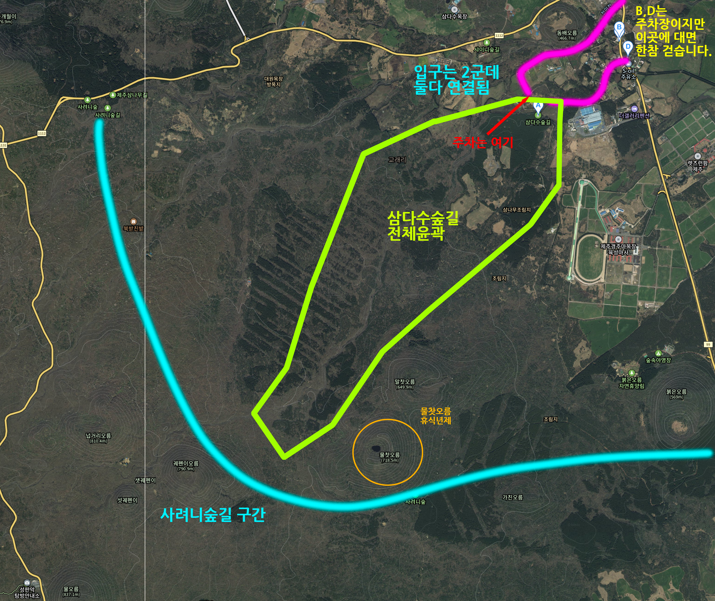 삼다수숲길을 다녀온 후 전체적인 윤곽을 살펴봤습니다. 삼다수숲길 3코스 끝쪽까지 가면 물찾오름 가까이 갈 수 있는데 사려니숲길에서도 물찾오름을 만날 수 있습니다. 자연휴식년제를 갖고 있기 때문에 오름을 오를 수는 없지만 물찾오름을 기준으로 사려니숲과 거의 붙어 있는 숲이라는 걸 알게 됐습니다. 사려니숲길과 비슷한 느낌도 많이 납니다.