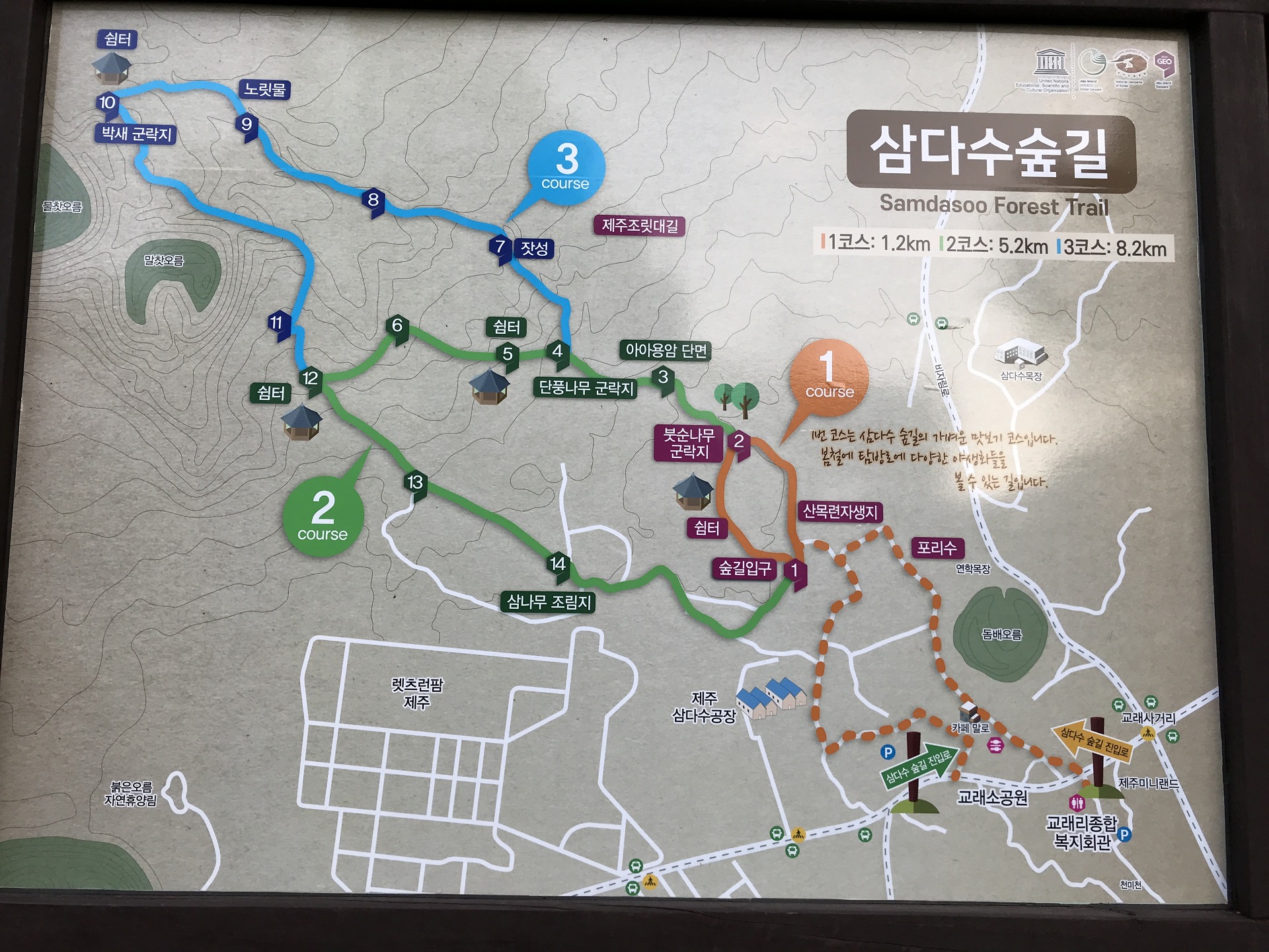 삼다수숲길은 1코스(1.2km), 2코스(5.2km), 3코스(8.2km)로 나뉩니다. 아주 짧게 둘러보고 싶을 때는 1코스가 짧고 좋지만 구간이 너무 짧기 때문에 최소 2코스 정도를 권장합니다. 3코스까지 가시려면 시간을 충분히 가져야 될 것 같구요. 1km당 15분정도 계산하시면 대략 시간을 알 수 있습니다. 저희는 어제 한라산 등반 후 다리를 좀 풀기위해 2코스 정도만 걷다 오려고 갔습니다. 걷다보니 2코스도 짧게 느껴지긴 했습니다. 하지만 갑작스레 쏟아지는 비가 멈추지 않으면서 갈림길에서 그냥 2코스로 결정하고 돌아서 나왔습니다.