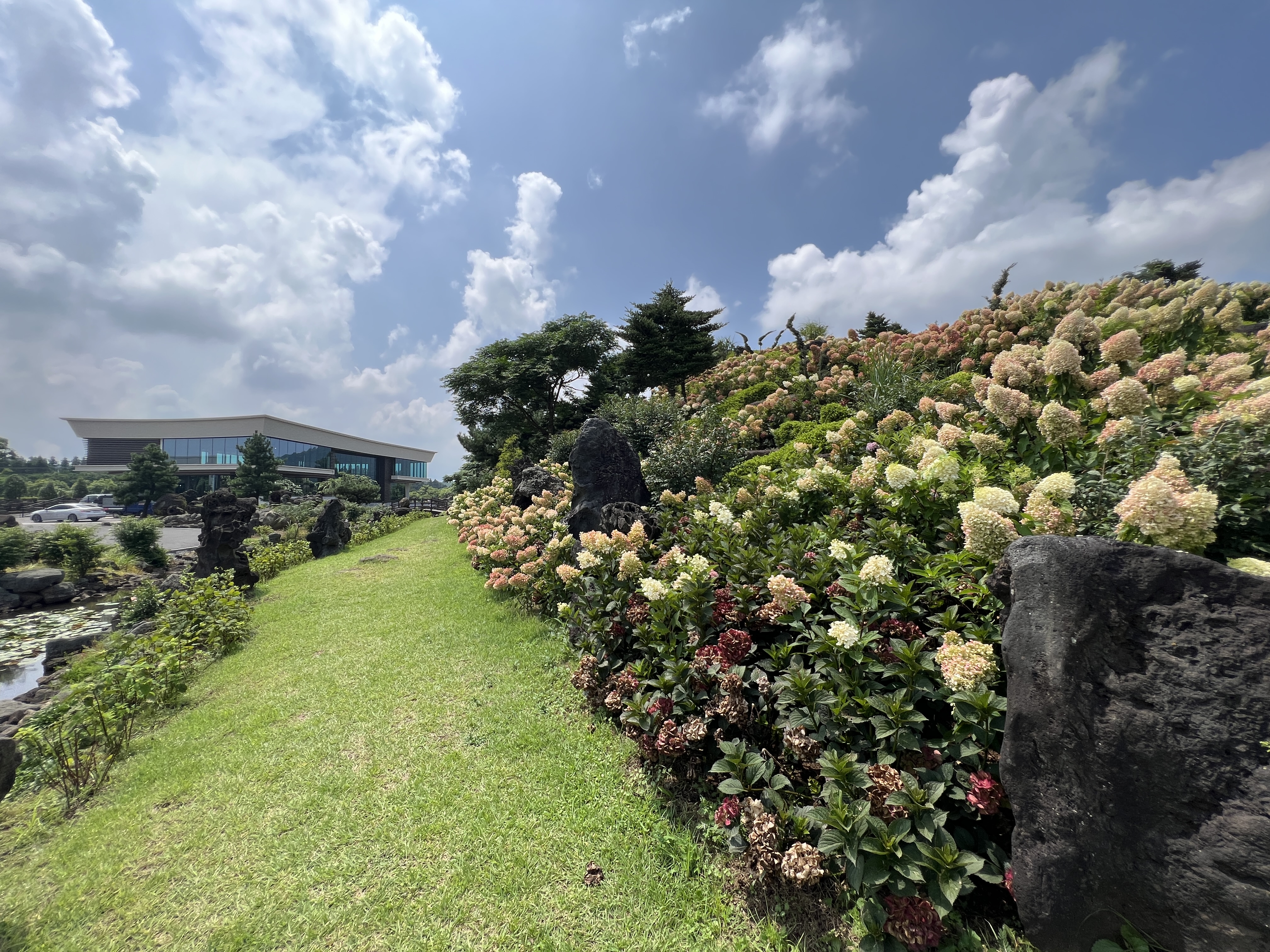 건물이 있는 쪽으로 걸어들어가다보면 바로 꽃들이 보이는데 꽃이 평지에 심어져 있는 모습이 아니라 높게 피어 있는 모습을 볼 수 있었습니다. 또한 주변에는 큰 원형의 모습을 한 연못도 함께 자리하고 있었습니다. 꽃을 좋아해서 수목원다니는 걸 좋아했었는데 수목원 느낌의 넓은 정원처럼 느껴졌습니다. 높게 쌓은 바위 사이사이로 꽃들이 가득하고 꽃 또한 올해 처음 알게 된 유럽수국이라는 예쁜 꽃들로 빼곡히 들어 선 모습은 눈이 부실정도로 아름다웠습니다.