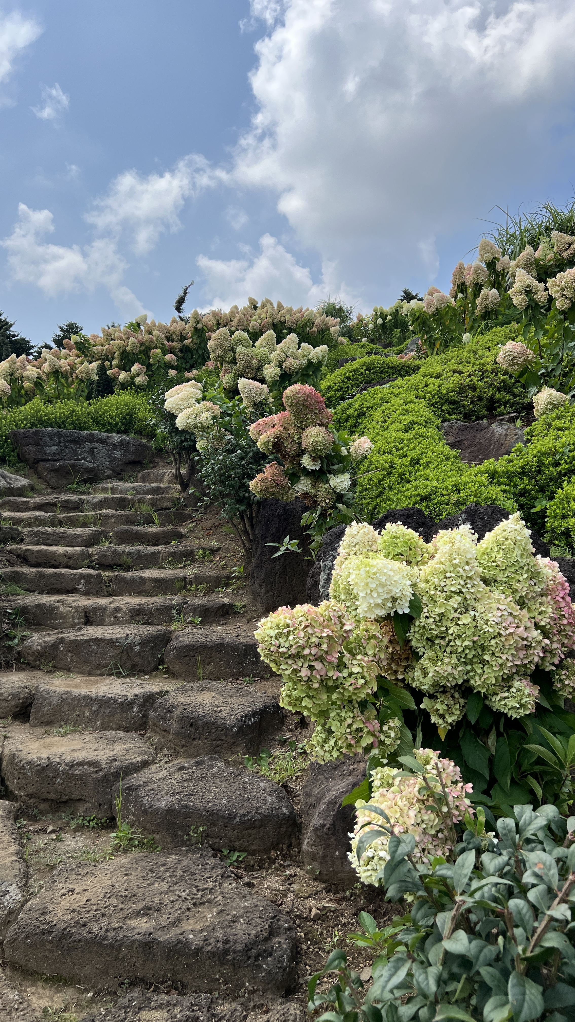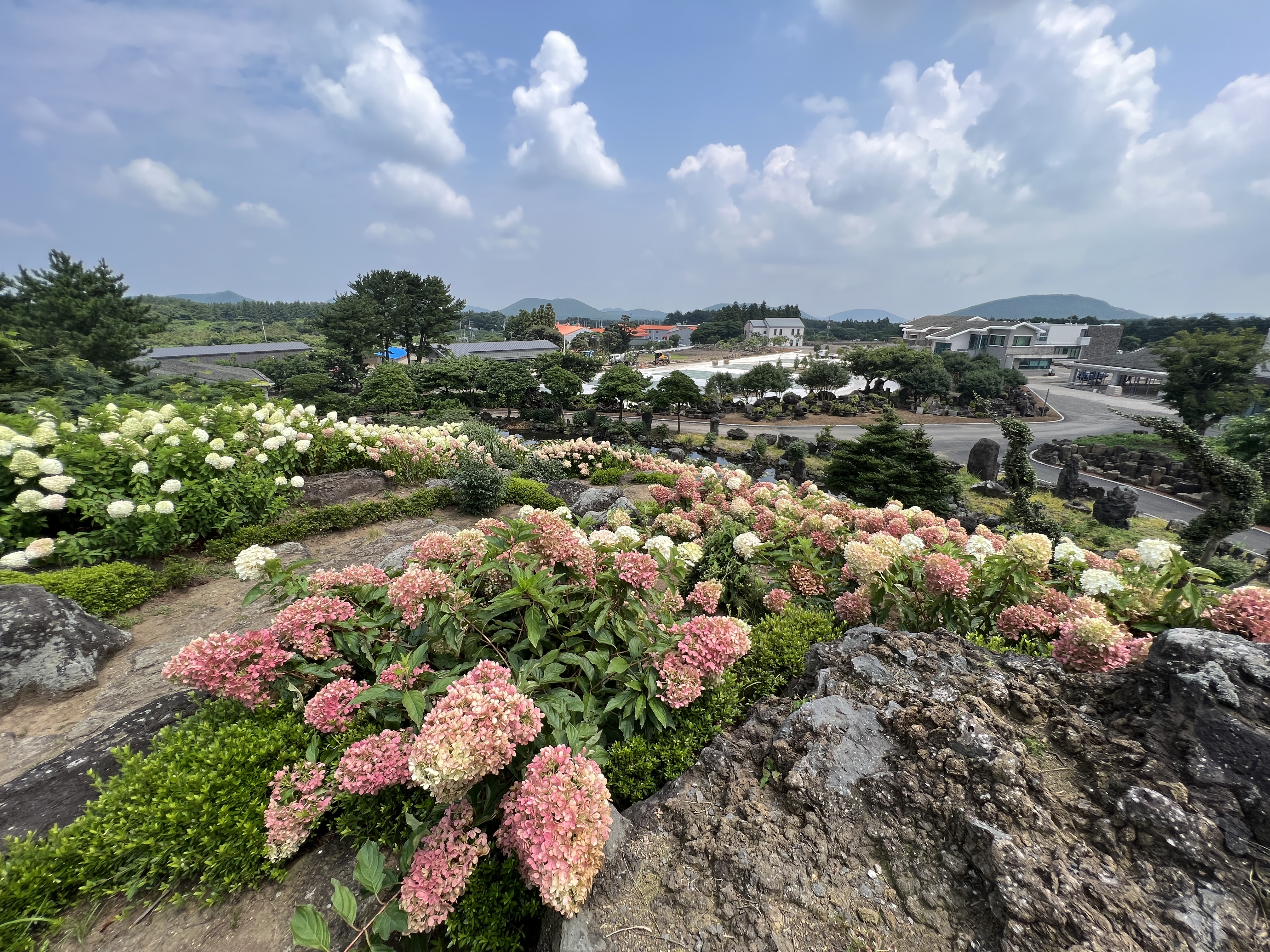 꽃 색깔은 흰색과 핑크색이 어우러지는 파스텔톤의 은은한 컬러가 대부분이었고 초록의 잎들과 함께 어우러져 정말 동화속에 들어 온 것만 같은 느낌이었습니다. 너무 황홀했고 예뻐서 꽃을 보며 자리를 떠날 수가 없었답니다. 독특한 돌들도 볼 수 있고 작은 동굴도 있었습니다. 꽃들이 가득한 계단을 밟고 올라가면 멀리 아름다운 오름도 볼 수 있고 주변의 경관도 만나볼 수 있었습니다.