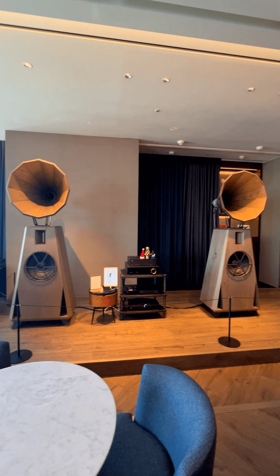 무대가 한쪽에 마련되어 있는데 스피커가 꽤 좋아보입니다. 소규모 음악공연할 수도 있는 것 같습니다.
