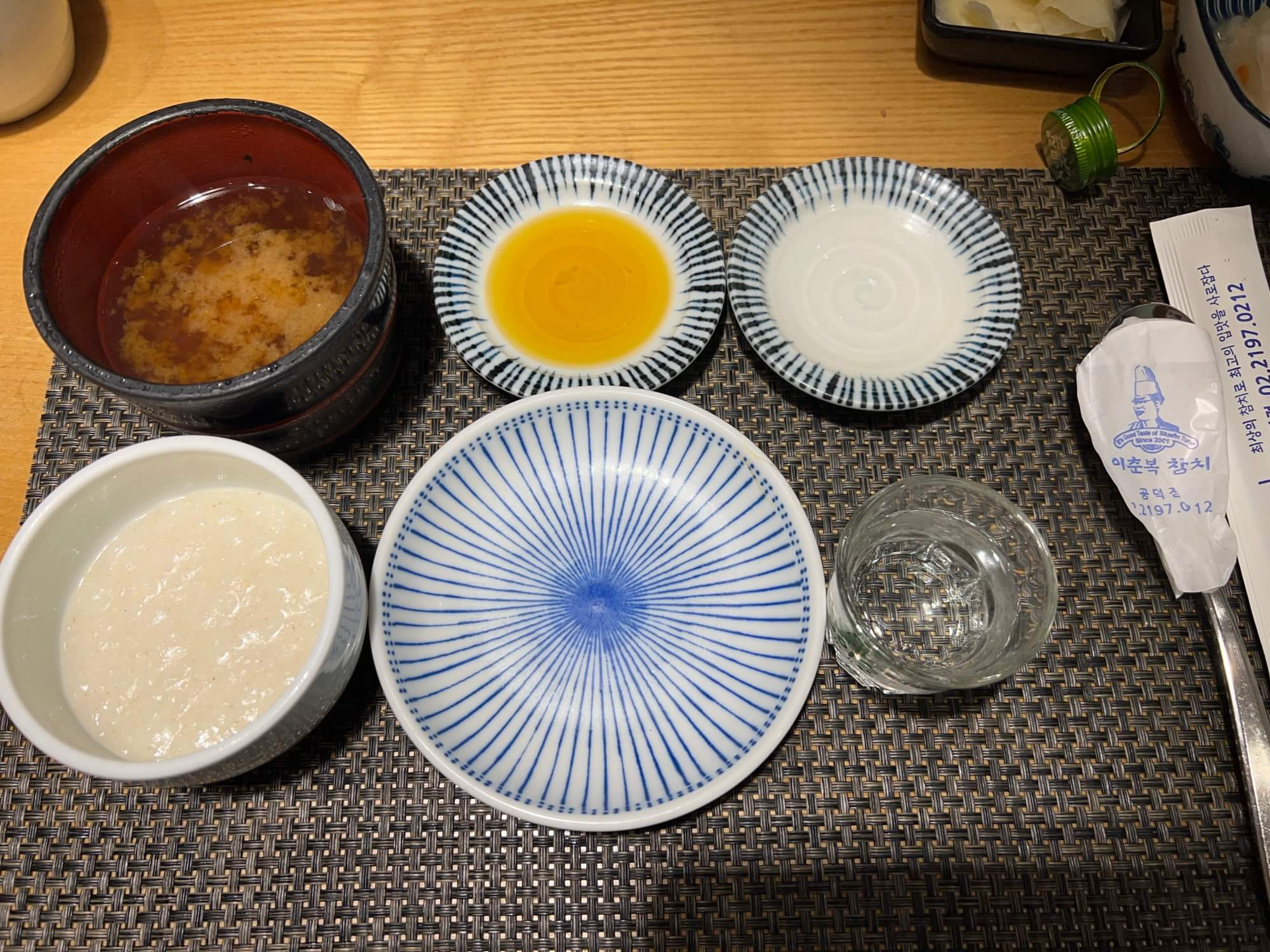 기본 세팅으로 죽과 미소된장국이 나옵니다. 죽을 먹으면 배가 부를 것 같아 한수저만 살짝 맛봤습니다.