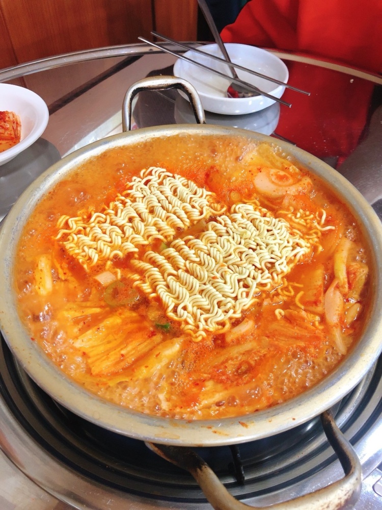 김치찌개/부대찌개 라면사리 넣고 끓이면서 먹는 집. 가성비 좋고 빨리 먹고 나오기 좋음.