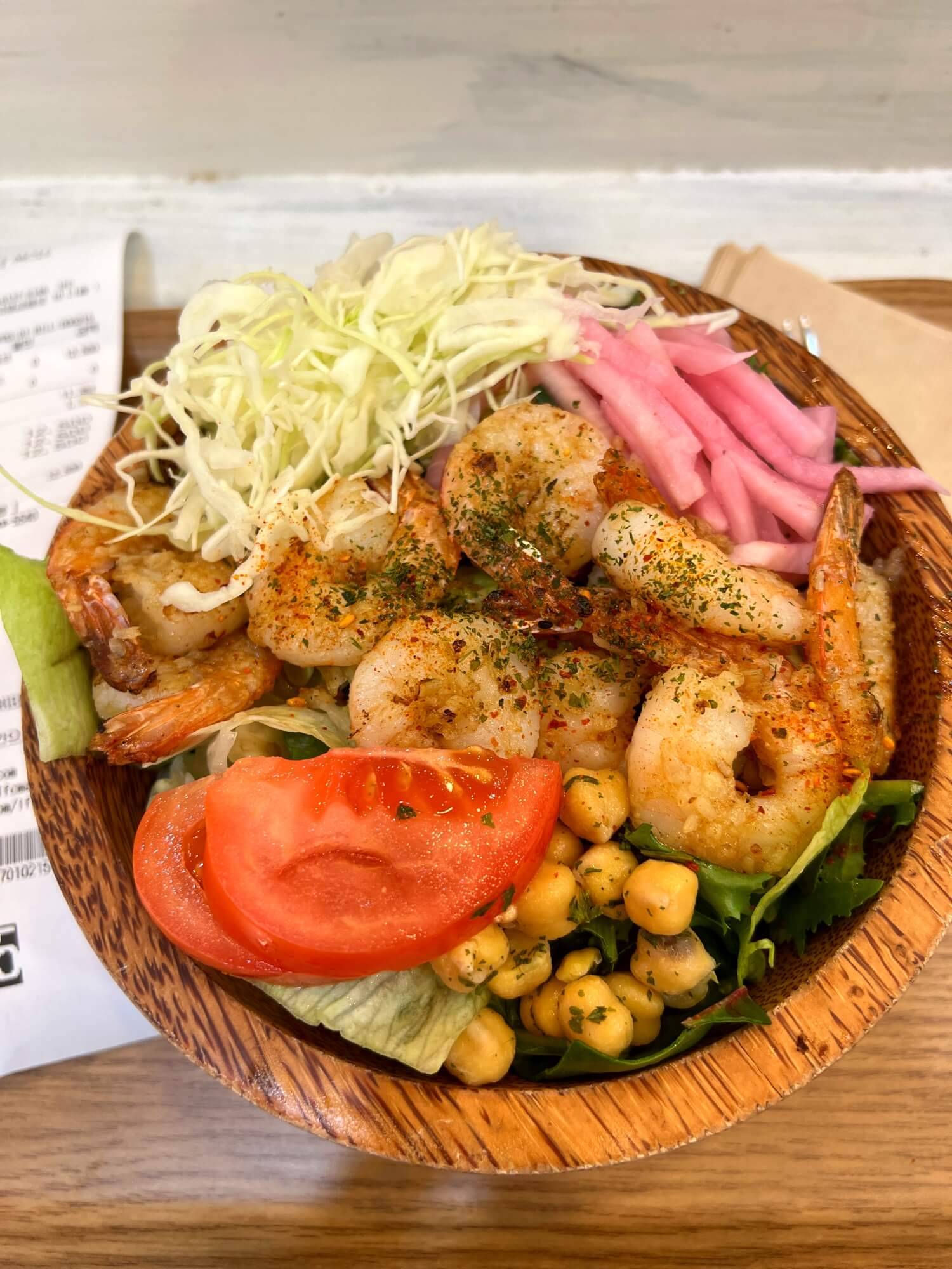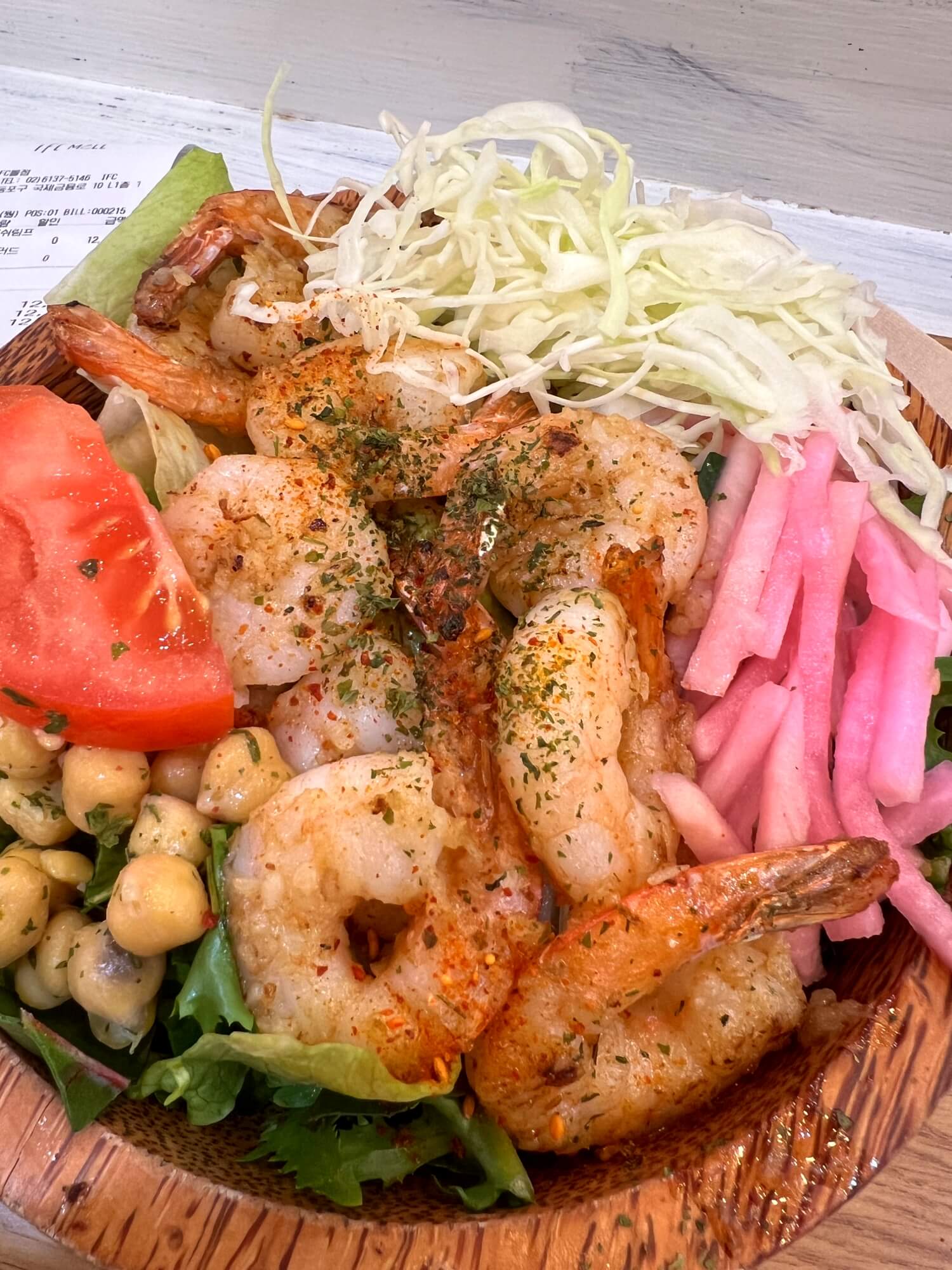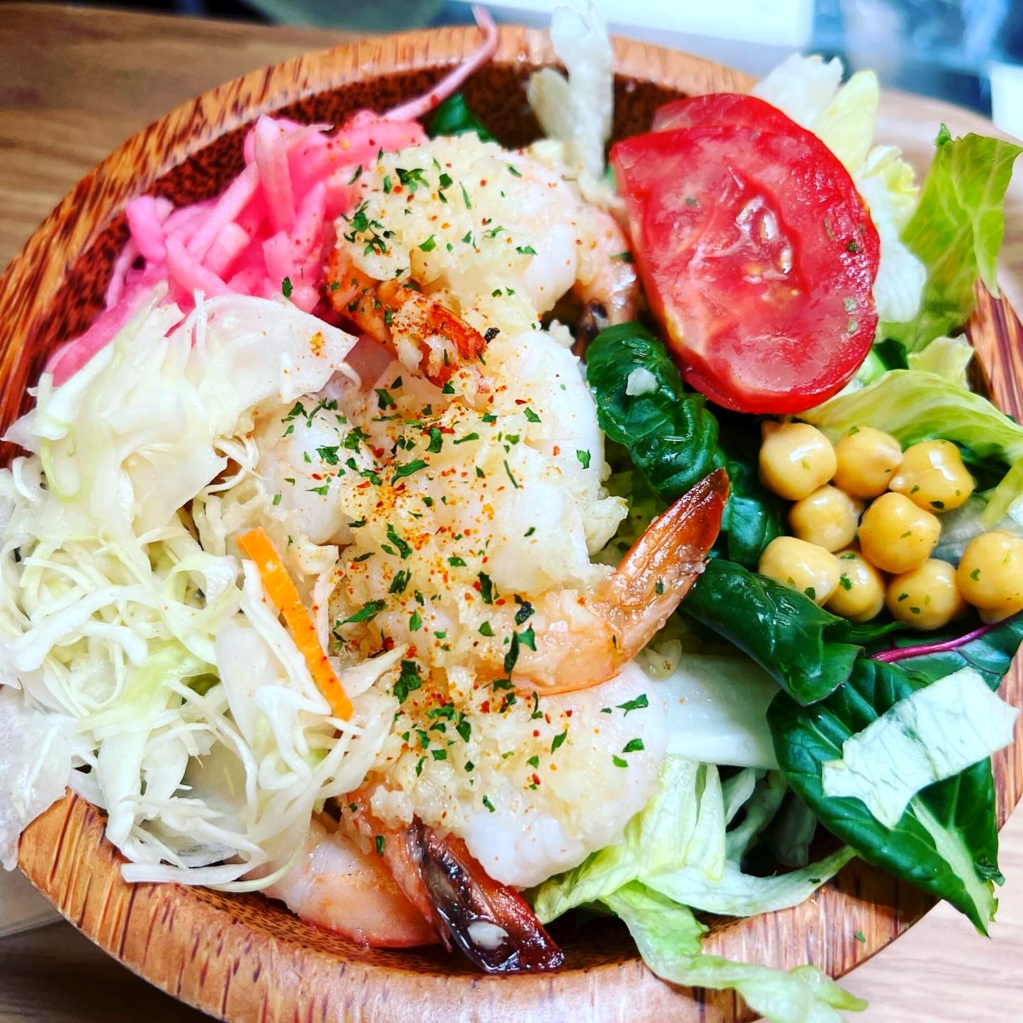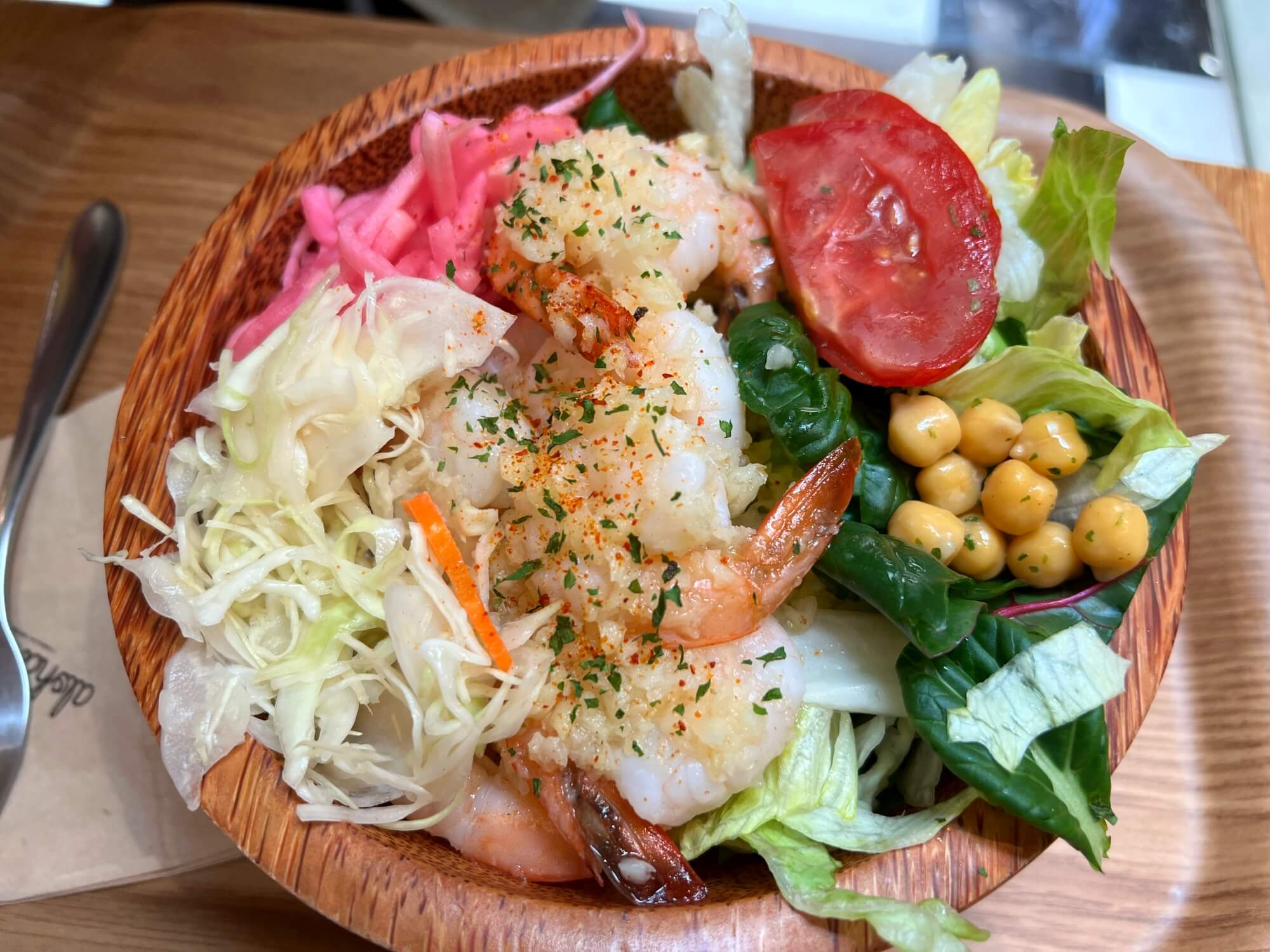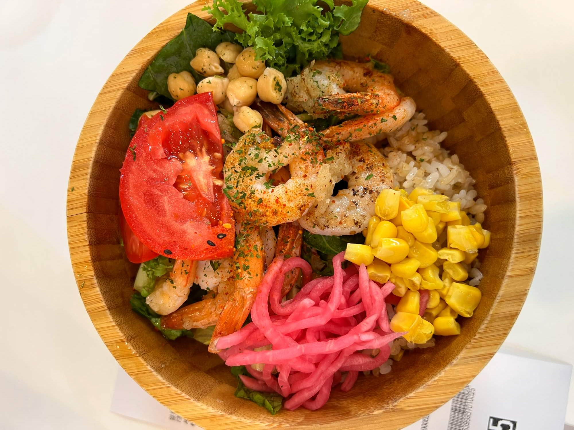 제가 주로 먹는 샐러드는 갈릭 쉬림프입니다. 포케를 추가하면 3,000원에 새우를 더 얹어줍니다. 저는 그냥 이정도가 딱 적당해요. 오목한 대나무 그릇에 아기자기 담아주는 데 양은 정말 많지는 않아요. 현미곤약밥이 함께 들어 있어 포만감은 충분합니다. 현미곤약밥은 선택입니다. 다른 걸로 바꿀 수 있어요.