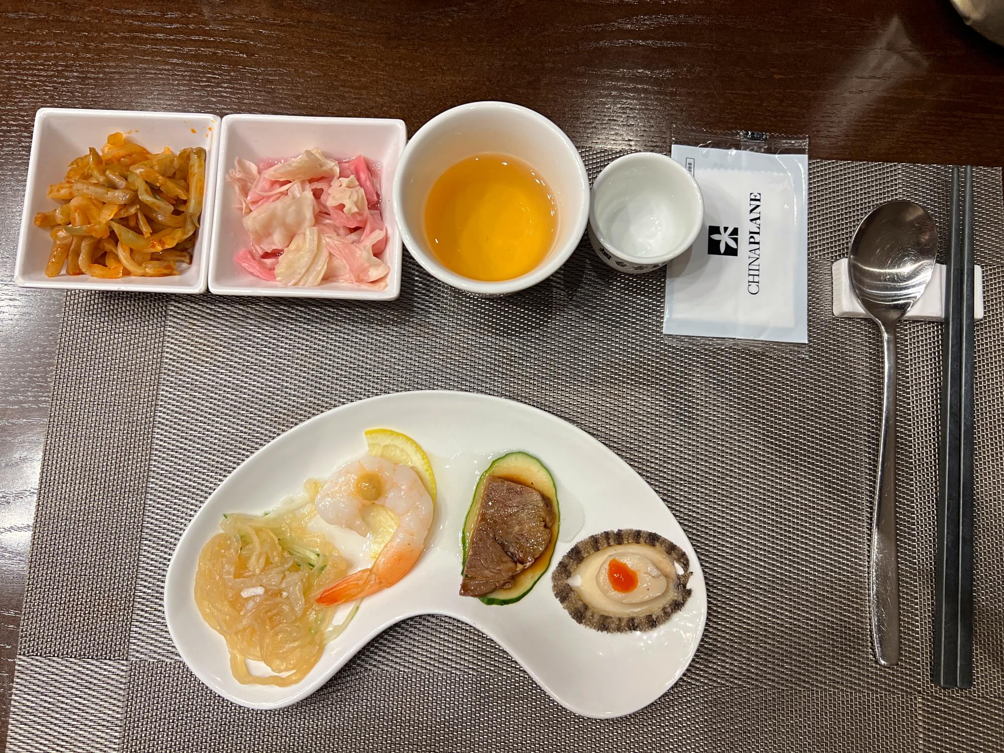 식사가 나오기 시작했습니다. 반달모양의 접시에 사품냉채가 나왔는데요, 모양도 참 예쁘죠? 돈값을 하는 비주얼이네요. 에피타이저로 먹는 사품냉채는 입맛을 돋우기에 좋은 냉채, 새우, 수육, 전복으로 시작했습니다. 맛은 더할나위 없이 좋았어요. 밑반찬으로 나온 짜사이와 양배추절임도 맛있어서 자꾸 손이가고 있었습니다.