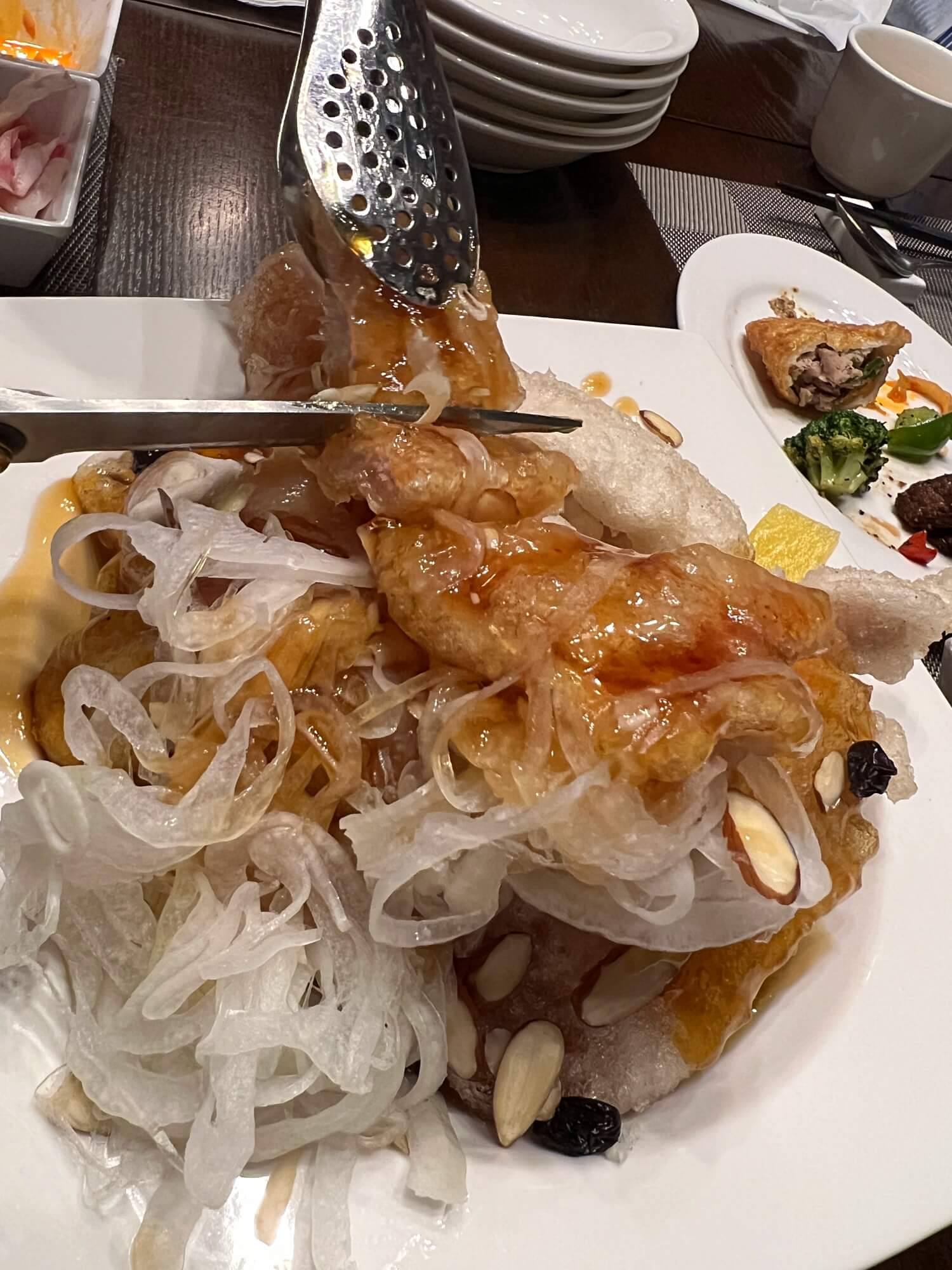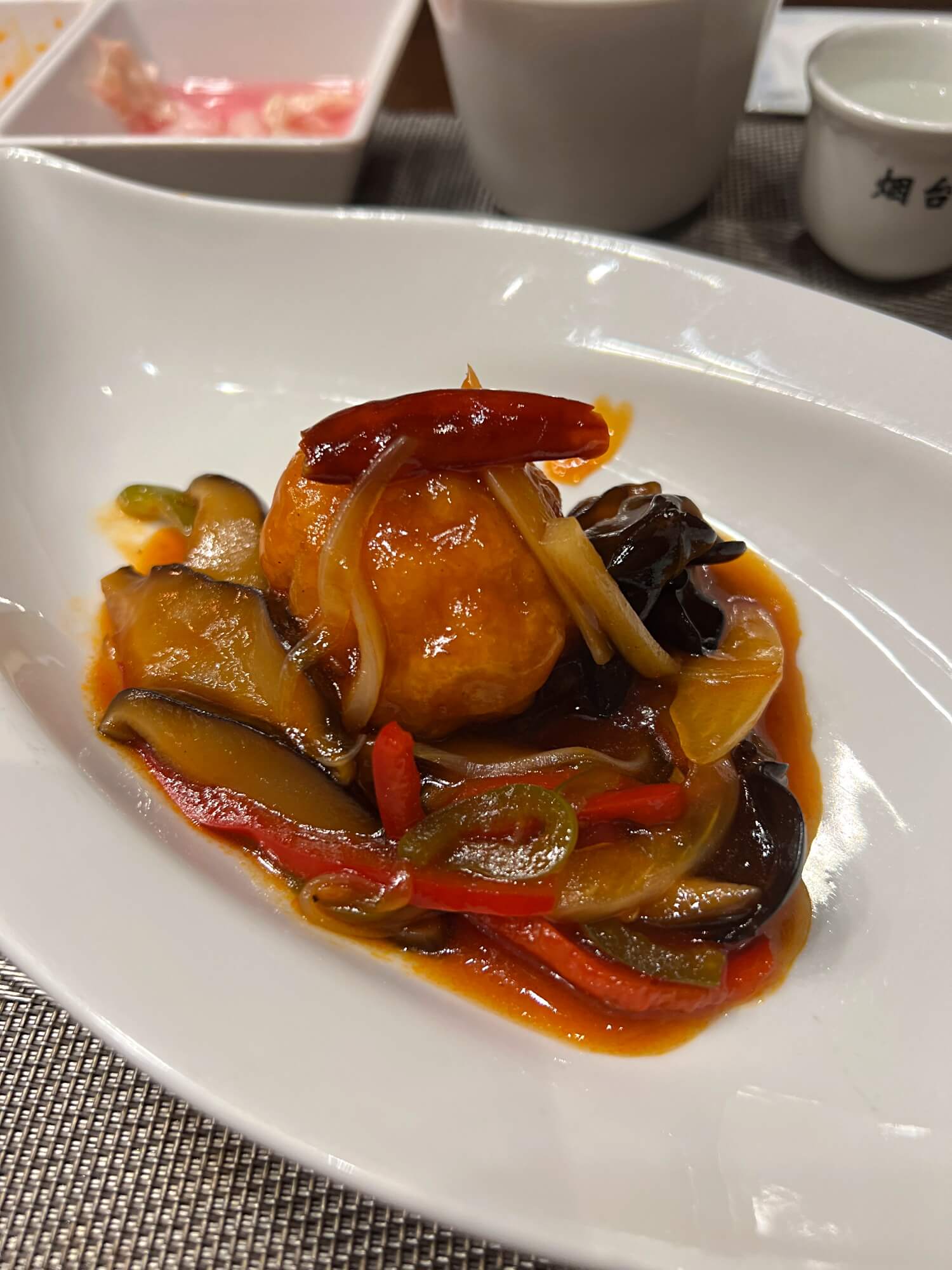 그 다음으로 나온 메뉴는 어항동고입니다. 어향동고는 표고버섯을 사용한 요리인데요, 다진새우와 표고버섯을 함께 섞어 튀긴요리랍니다. 거기에 어향소스를 곁들여 담은 요리에요. 어향소스는 생선의 향을 잡기 위해 만들어진 소스라고 합니다. 버섯과 야채 그리고 튀김 한덩이가 들어가 있어요. 새콤달콤한 맛이 특징입니다.