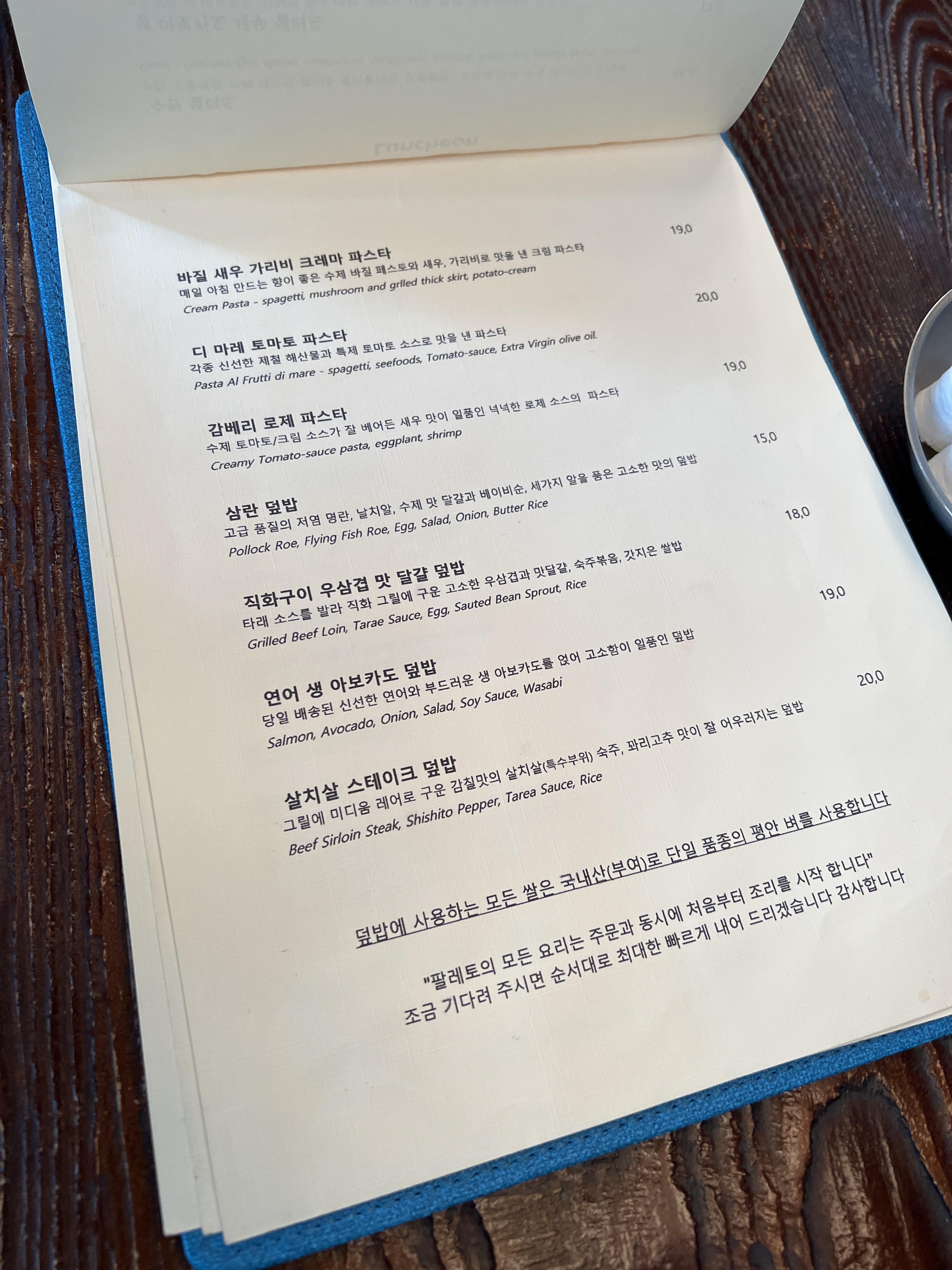 팔레토에서 가장 추천하는 메뉴는 당연히 박찬일식 닭튀김입니다. 그리고 바질페스토 파스타 강추해요! 우삼겹 덮밥도 점심 한끼로 괜찮은 요리였습니다. 가격은 17,000원. 추석 지나고 한 번 찾아가볼까 합니다. 파스타 양이 꽤 됩니다. 적게 주진 않아요. 사람마다 다르겠지만 파스타 양은 좀 많아서 여자 둘이 먹는다면 파스타 한 개와 닭튀김 하나 주문하면 좋을 것 같네요.