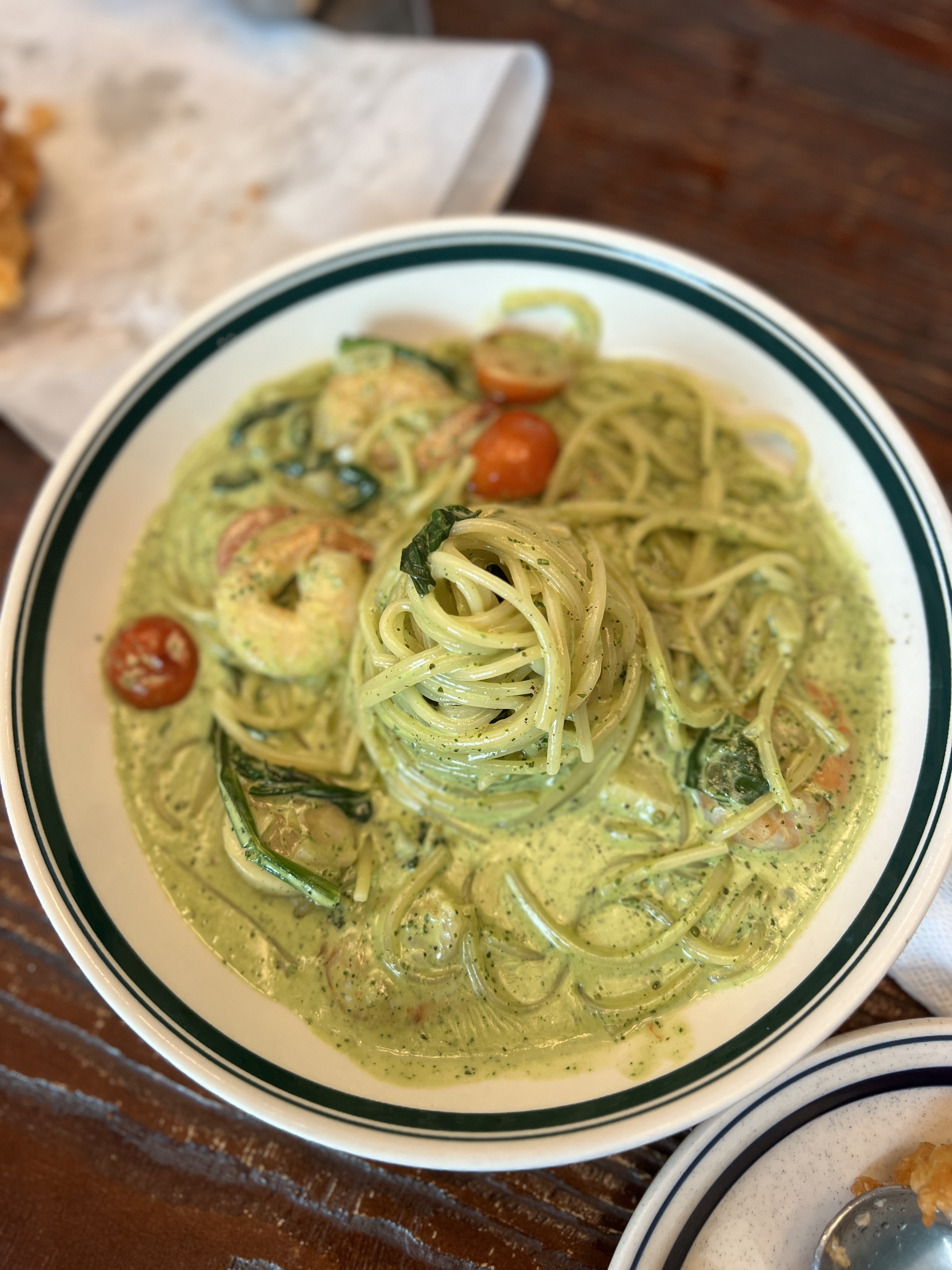 바질 새우 가리비 크레마 파스타입니다. 바질페스토가 들어가 초록빛을 띠고 있어요. 새우와 가리비가 있어 인기 있는 메뉴 중에 하나 입니다. 가격이 2만원이 넘지 않아 가격도 괜찮은 편입니다. 여의도엔 보통 2만원이 넘어가는 파스타집이 많거든요. 19,000원입니다.