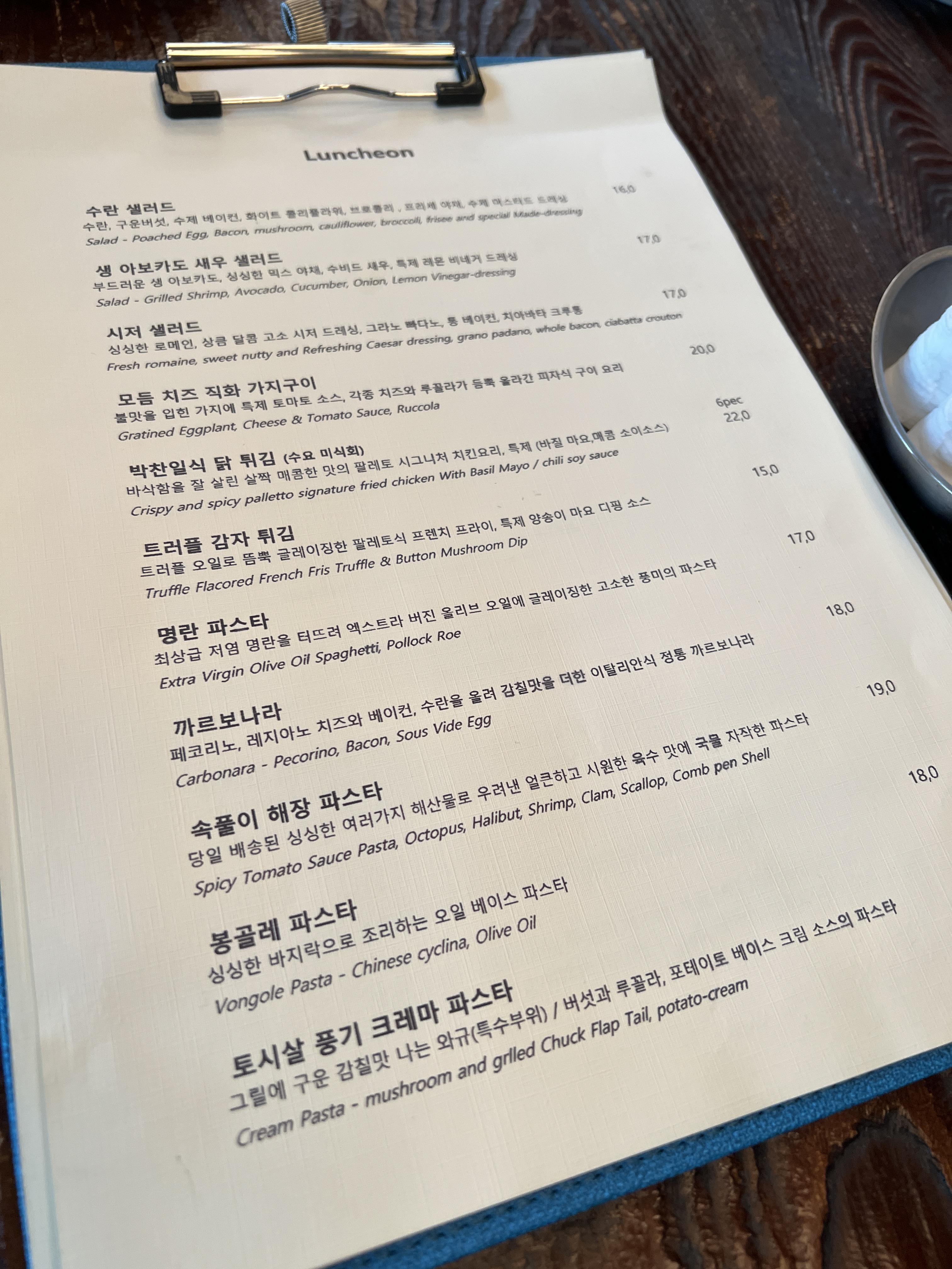먹어보고 싶은 요리들이 즐비하게 있습니다. 다양하게 먹기 위해 여러가지를 시켜보는데요, 수요미식회에 나왔다던 박찬일식 닭튀김을 빼놓을 수가 없겠죠. 이 식당에 시그니처메뉴라 할 정도로 인기가 있는 요리입니다. 가장 무난한 봉골레 파스타와 속풀이 해장 파스타, 바질 새우 가리비 크레마 파스타, 그리고 명란파스타를 주문했습니다. 파스타 종류가 많아서 파스타 좋아하는 사람이면 이 곳 파스타 추천해 봅니다. 저도 파스타를 엄청 좋아하는 편이라 파스타라면 어디든 찾아갑니다.
