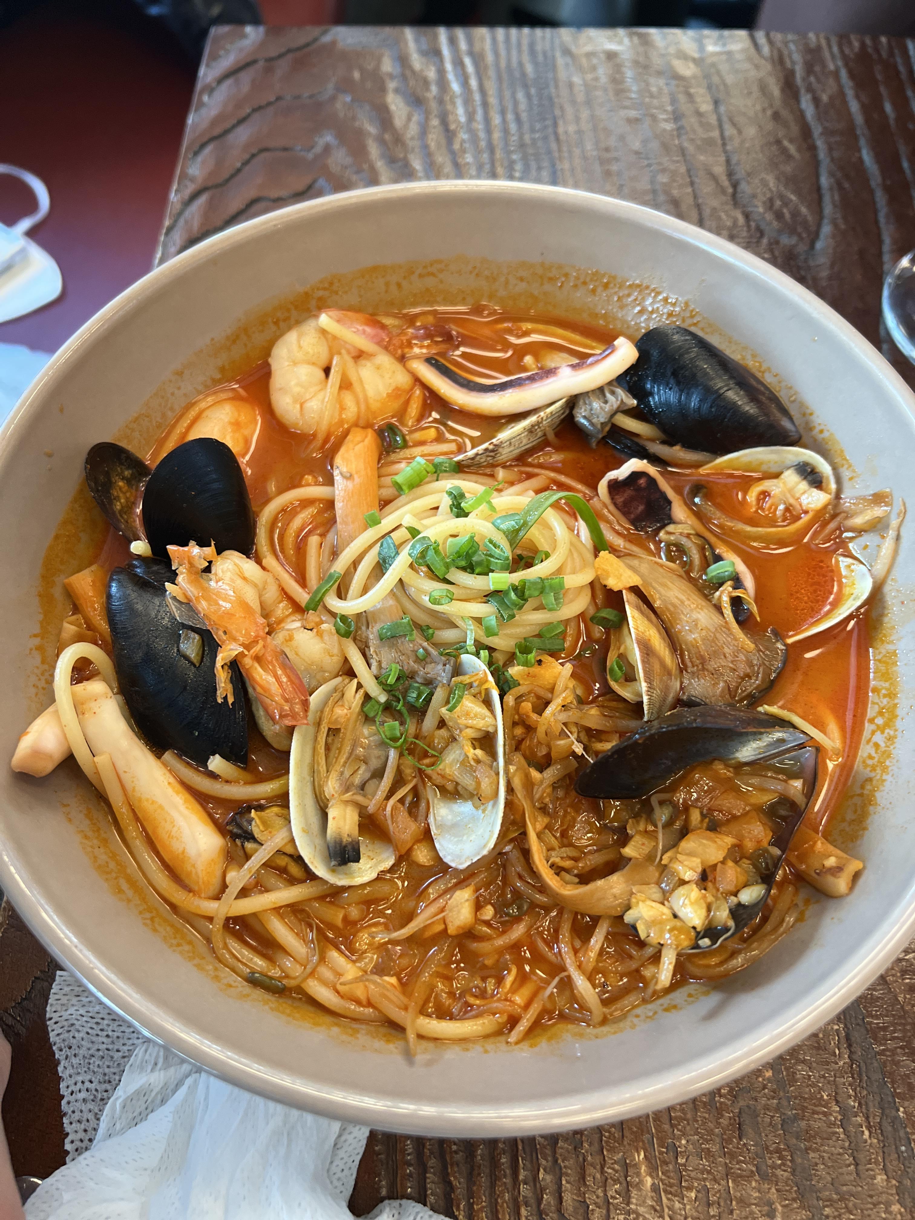 속풀이 해장 파스타입니다. 국물이 자작자작 한 것이 마치 짬뽕이 연상되네요. 짬뽕맛은 아니고 해산물로 우려낸 육수로 만든 해물향 가득한 속풀이 파스타 입니다. 홍합, 오징어, 새우, 버섯 등이 푸짐하게 들어있어 맛있었어요.