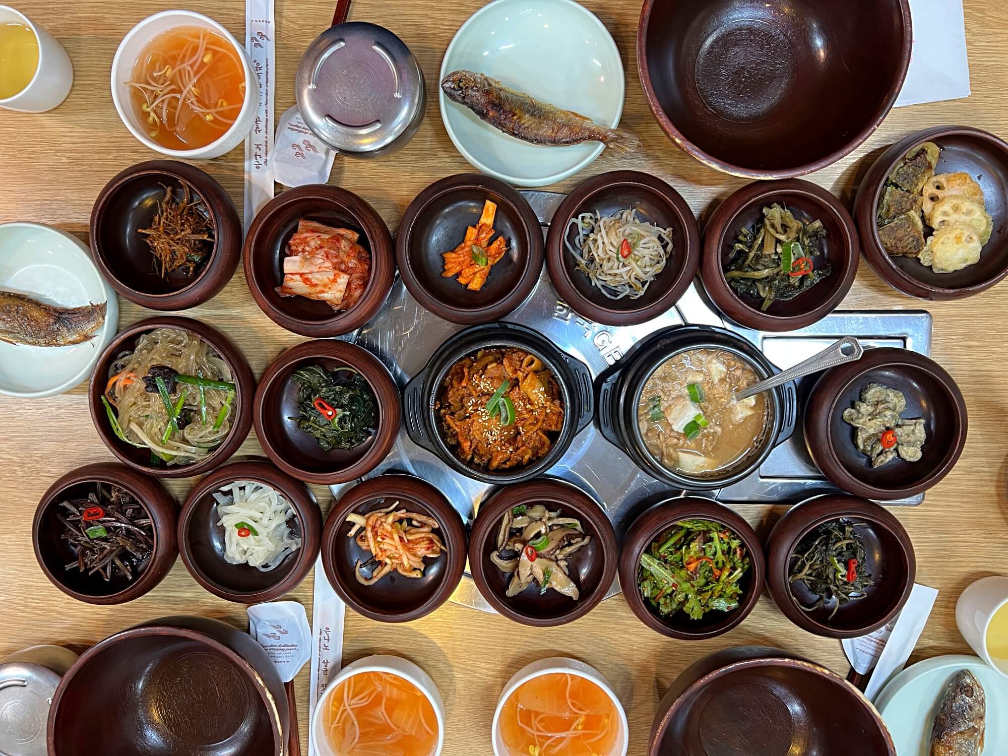 청국장, 제육볶음, 잡채, 버섯무침, 숙주나물, 취나물, 우거지, 고사리, 무우, 연근, 조기구기 등 총 19가지의 음식이 세팅됩니다. 어마어마하지 않나요. 반찬의 양은 정말 작아 보이지만 이 상차림이 3인분인데 이것도 남는 다는 사실.