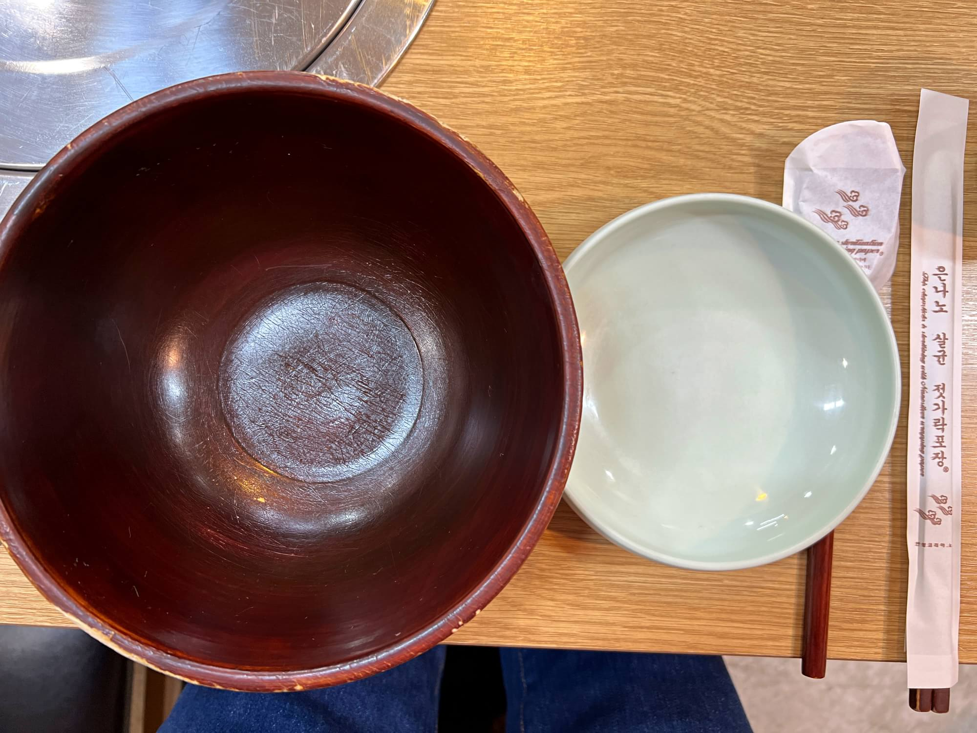 빈 그릇부터 세팅되는 식탁 위에는 나무로 된 큰 사발이 놓입니다. 절에서 절밥 먹는 기분이랄까요? 무엇을 담아 먹어도 건강할 것 같은 느낌입니다.