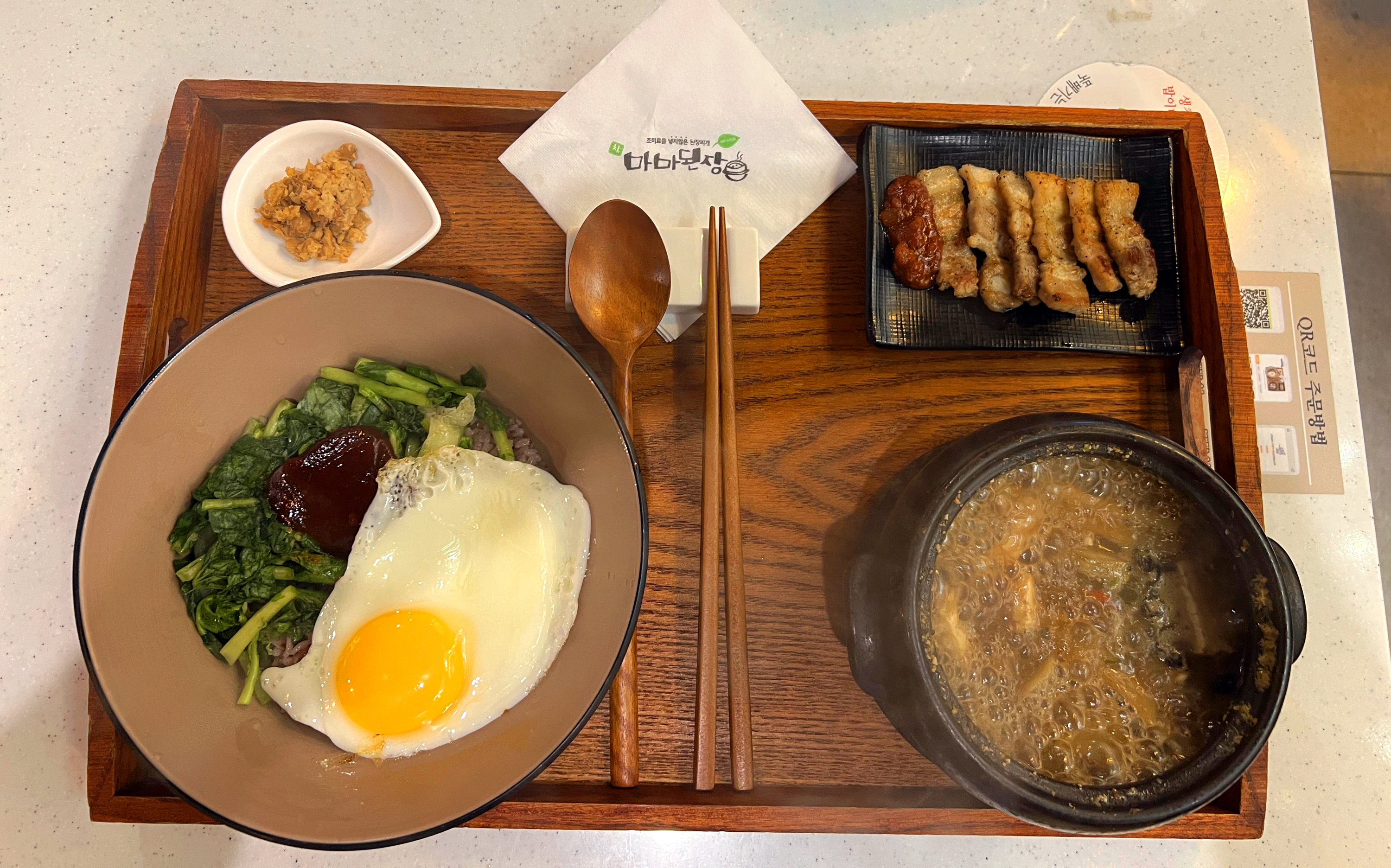 군더더기 하나 없는 아주 깔끔한 한상입니다. 기본된장찌개 메뉴인데요. 우렁과 바지락, 우삼겹이 들어가 있습니다. 밥은 열무비빔밥으로 제공되고 열무와 계란이 있어 따로 반찬이 필요없을듯한데 삼겹살구이까지 내어주네요! 혼자 먹기 딱 좋은 맛깔나는 상차림이었습니다. 마마된장의 주문방법은 테이블키오스크도 아닌 QR코드 주문방식이었습니다. QR코드를 찍으면 메뉴선택이 나오는데 그곳에서 주문하면 됩니다.
