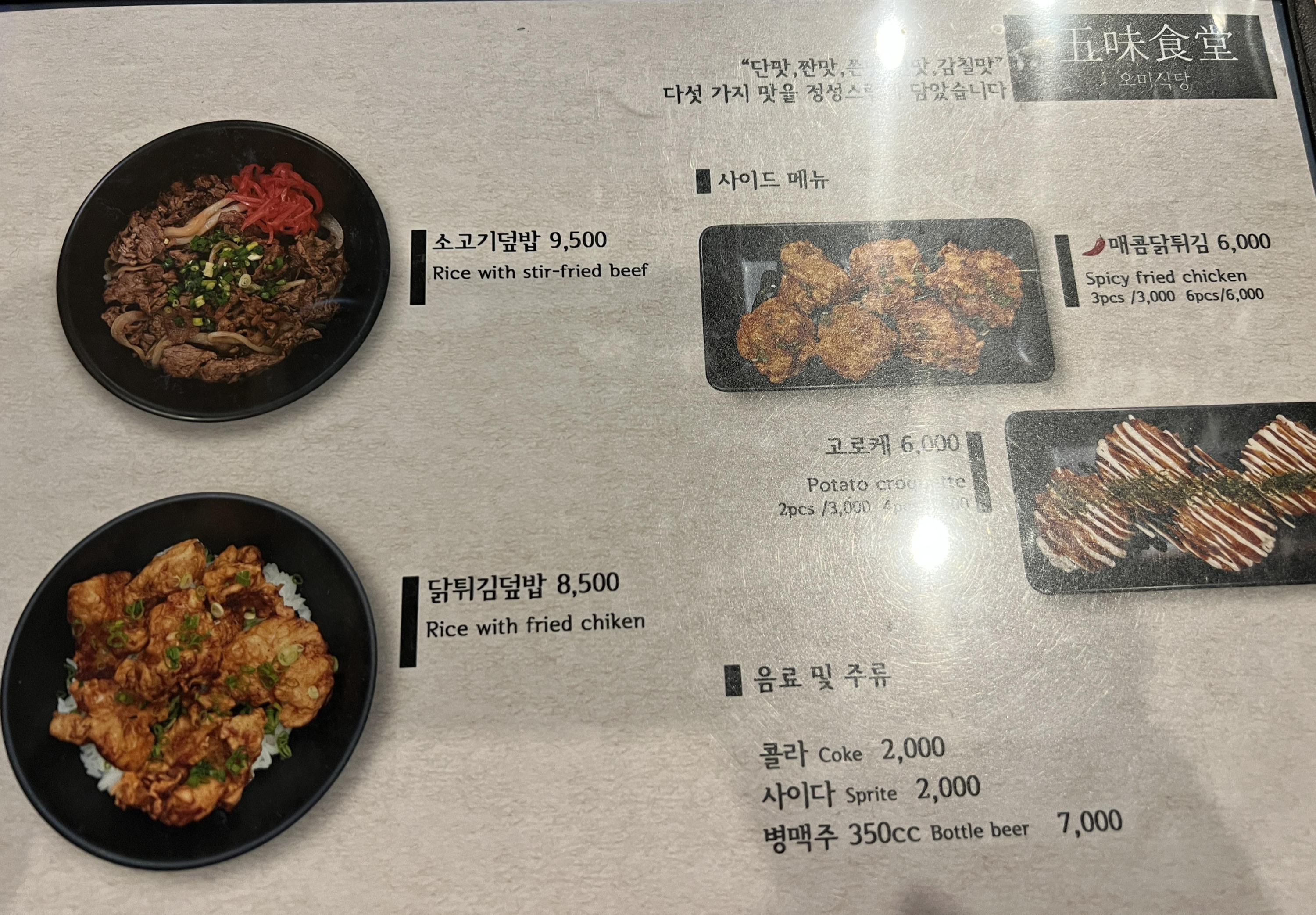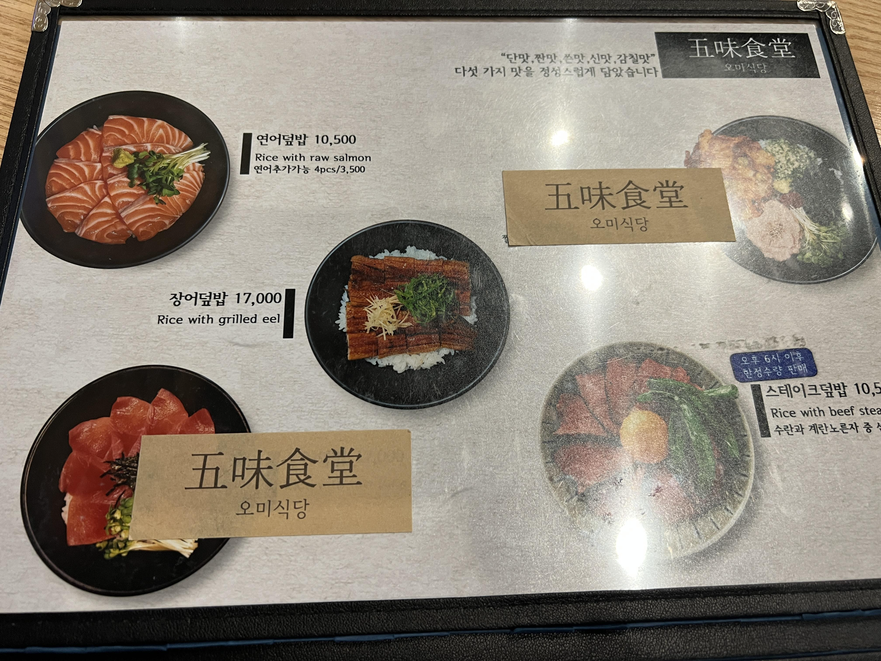 L3층에 깔끔하게 자리한 오미식당은 저녁에는 사람이 붐비지 않아 좋았습니다. 점심에는 물론 사람이 많죠. 어딜가나 많이 있습니다. 오미식당의 풀이는 단맛, 짠만, 신맛, 쓴맛, 감칠맛의 다섯가지 맛이라고 하네요. 장어덮밥과 닭튀김덮밥도 맛있어 보였습니다.