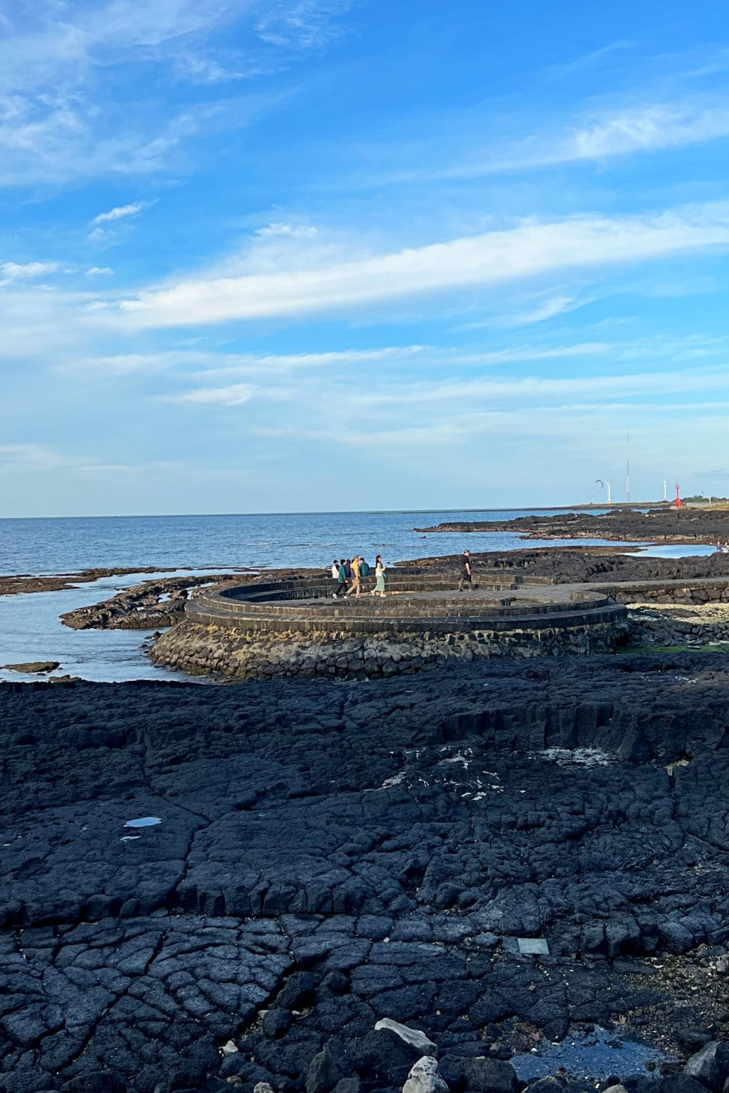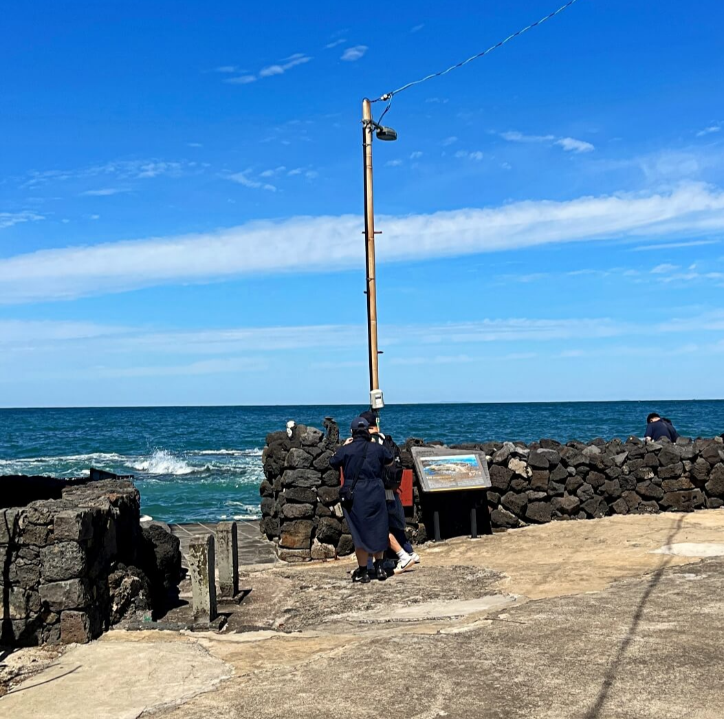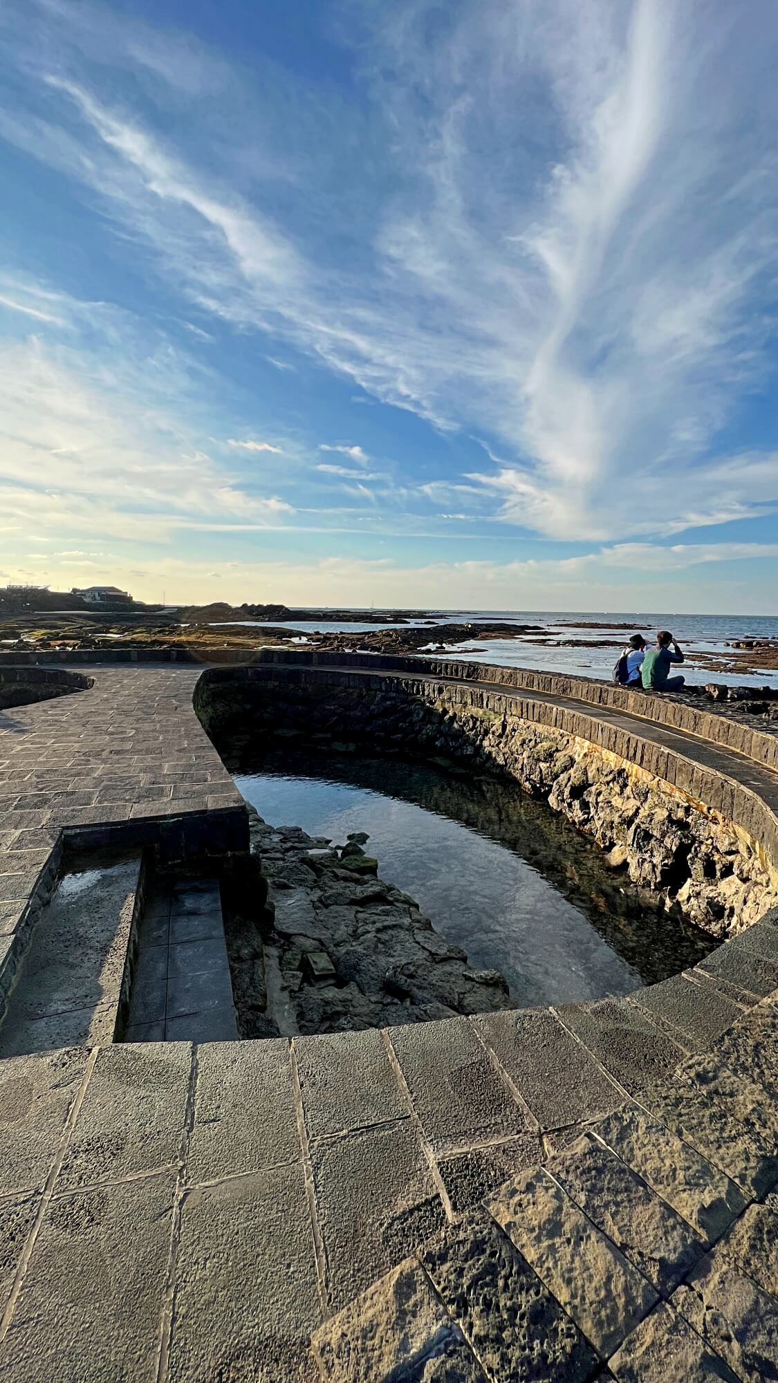 가족과 함께 온 부부가 앉아서 쉬는 모습이 보기 좋았습니다. 저도 여유있게 저렇게 앉아서 바다를 바라볼 수 있었다면 얼마나 좋았을까요? 언제든지 매일 와서 볼 수 있다는 생각에 사진만 찍고 휭하니 떠나게 됩니다. 이곳 청굴물은 용천수가 나오는 곳으로 가장 시원한 물을 느낄 수 있다는데요. 예전에 한번 담궈봤을 때 정말 차갑다고 느껴졌습니다.