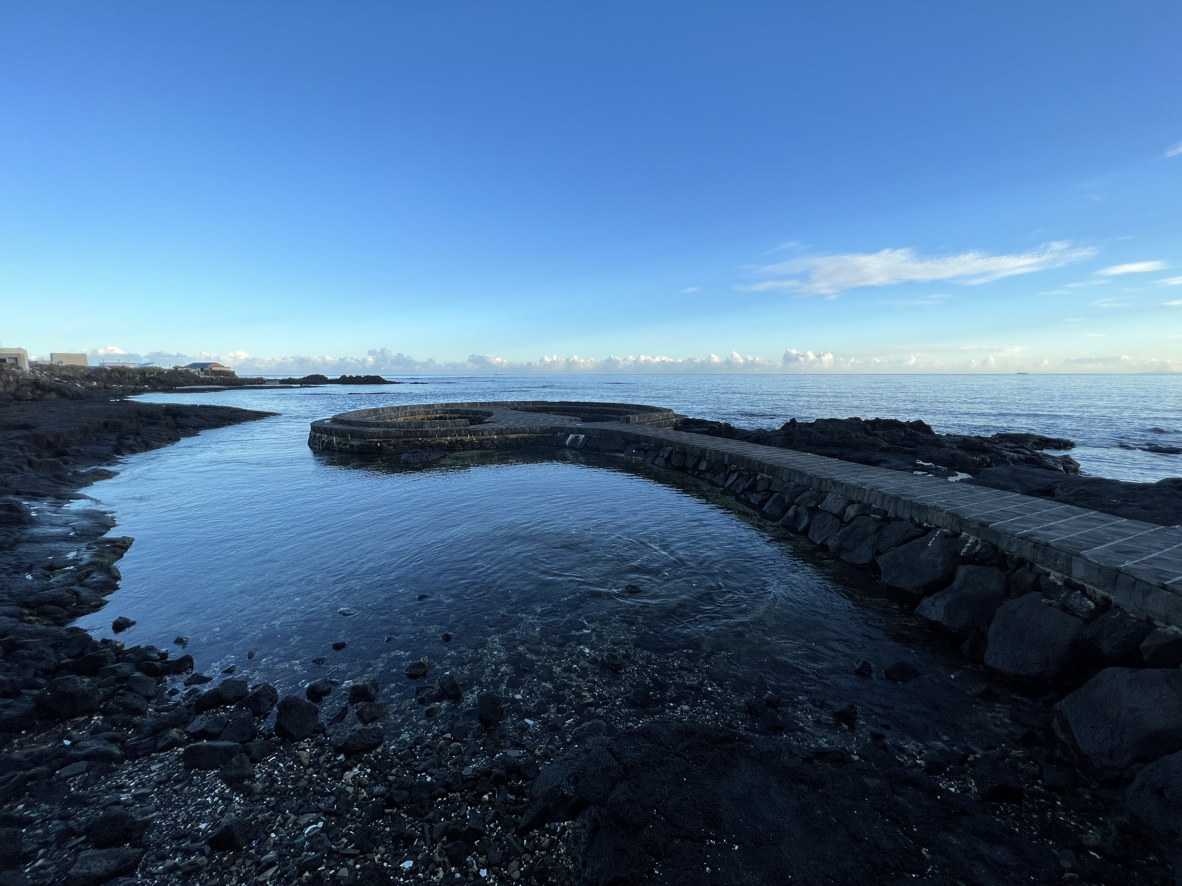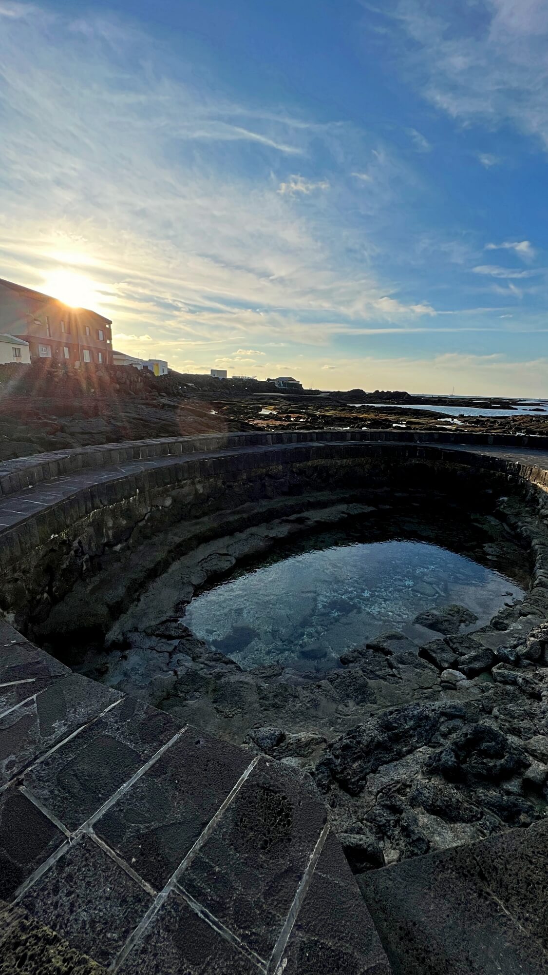 해가 지는 오후 햇살이 막 건물 뒤로 넘어가려던 순간이었습니다. 청굴물 안쪽으로는 용천수가 흘러나와 간조때에도 물이 항상 고여있습니다. 내려가서 차가운 물을 느껴보셔도 좋아요.