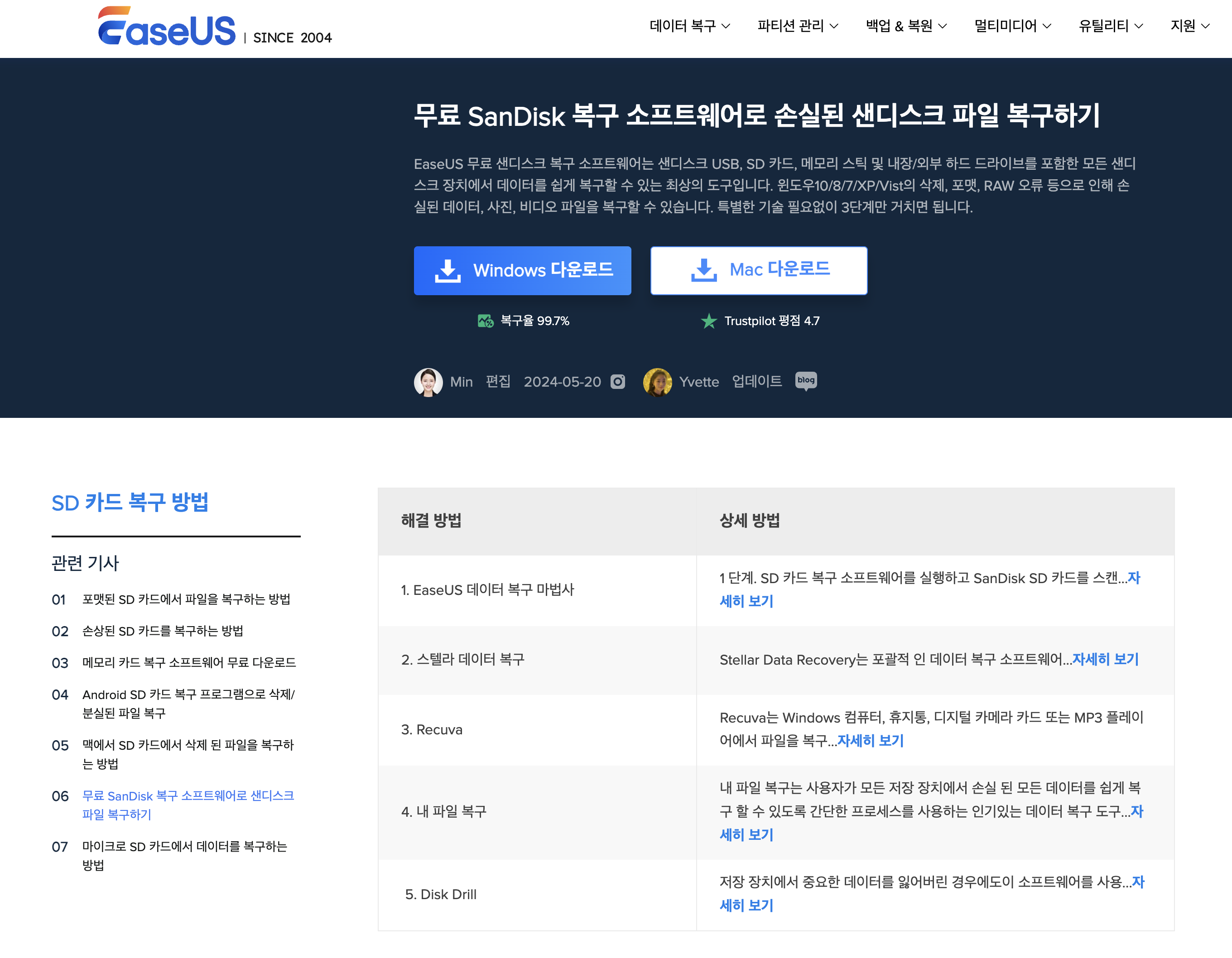 하지만 갑작스럽게 외장하드에 문제가 생긴다면 너무 당황스럽습니다. 제가 요며칠 그랬거든요. 처음에는 왜 안되지? 계속 끙끙 앓기만 했어요. 검색으로 찾아봤으면 더 빠르게 해결했을 텐데 하루를 그렇게 보내고 다음날에 되서야 검색을 시작했습니다. 외장하드 복구, Sandisk 복구, 메모리 복구 등 다양하게 찾아보며 검색을 시작했습니다. 제가 가지고 있던 외장하드는 샌디스크 Potable SSD 2TB입니다. 아무래도 관련 검색어로 찾는 게 나을 듯하여 Sandisk 복구로 검색했습니다. ‘무료 SanDisk 복구 소프트웨어로 손실된 샌디스크 파일 복구하기’라는 제목으로 된 글을 찾았습니다. 아래와 같은 내용이 첫 상단에 뜨면서 뭔가 희망을 가지게 됐습니다.