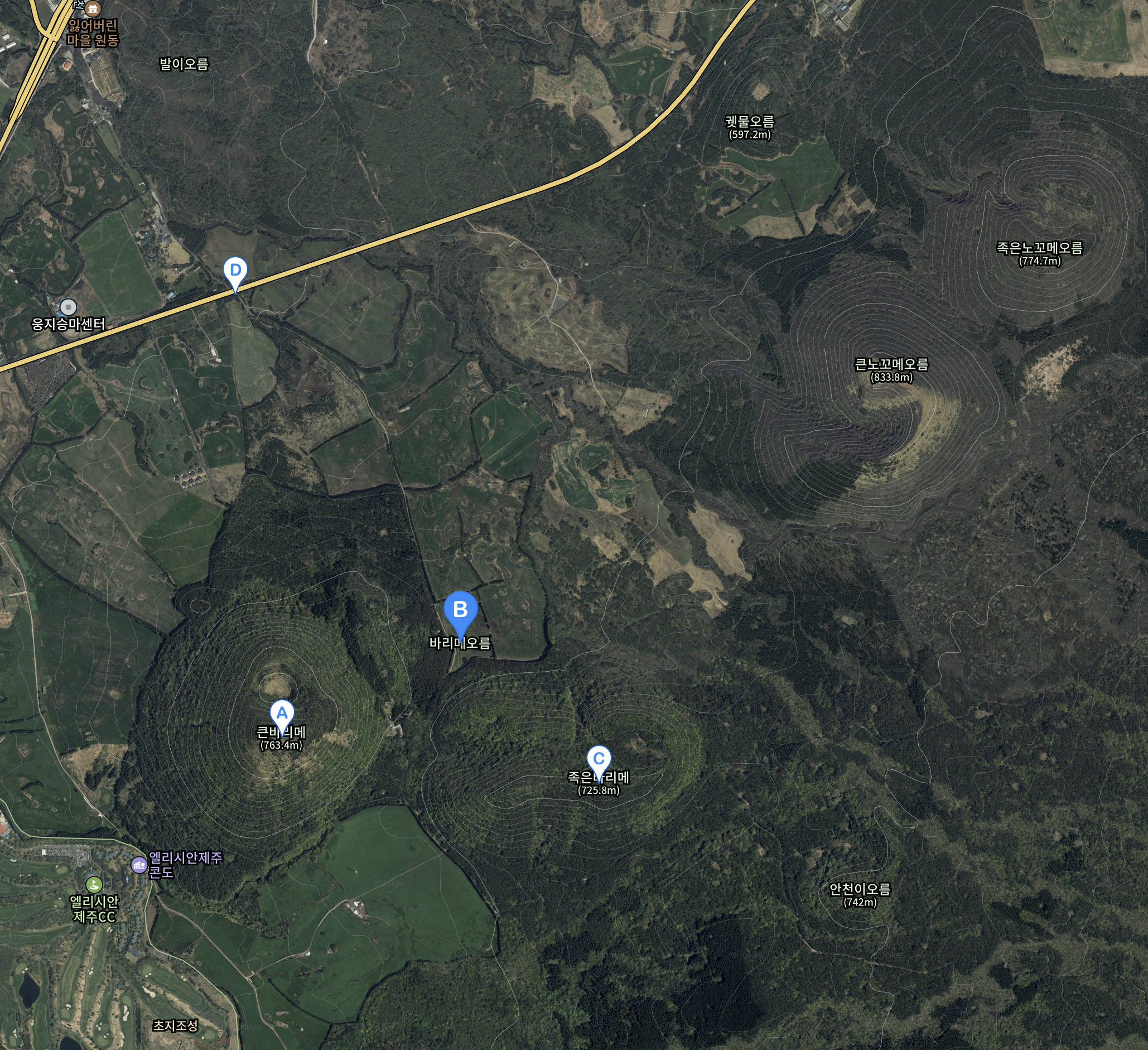지도에서 D가 바리메오름 입구입니다. B가 있는 바리메오름까지 쭉 오시면 됩니다. 좁은 길이긴 하지만 위험하지 않고 포장도로로 잘 되있습니다.