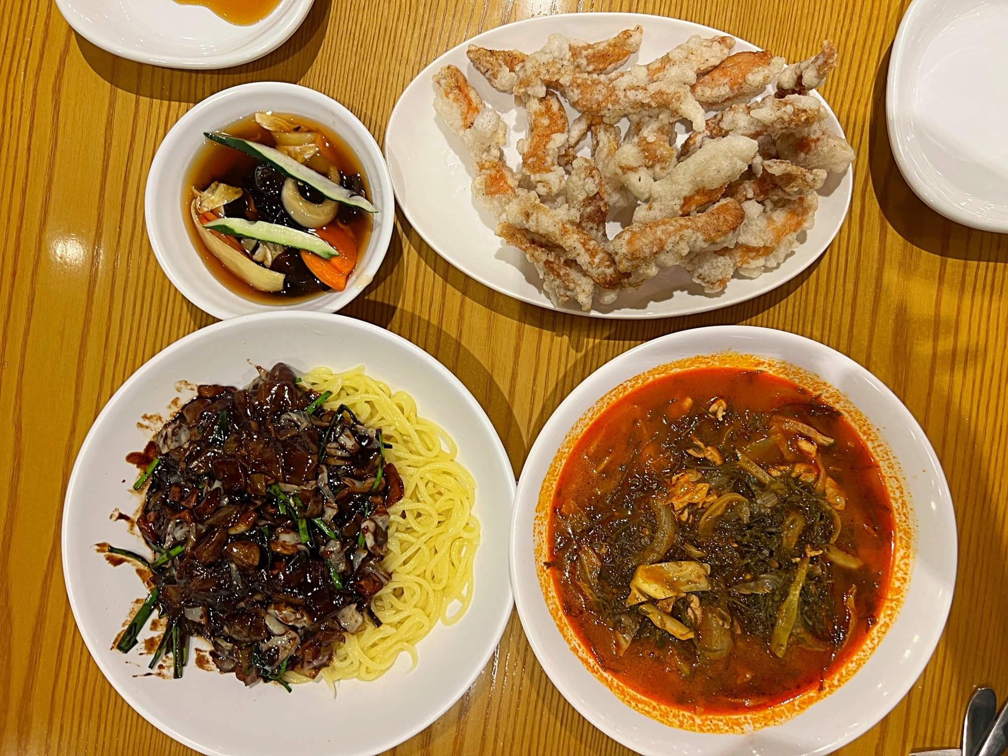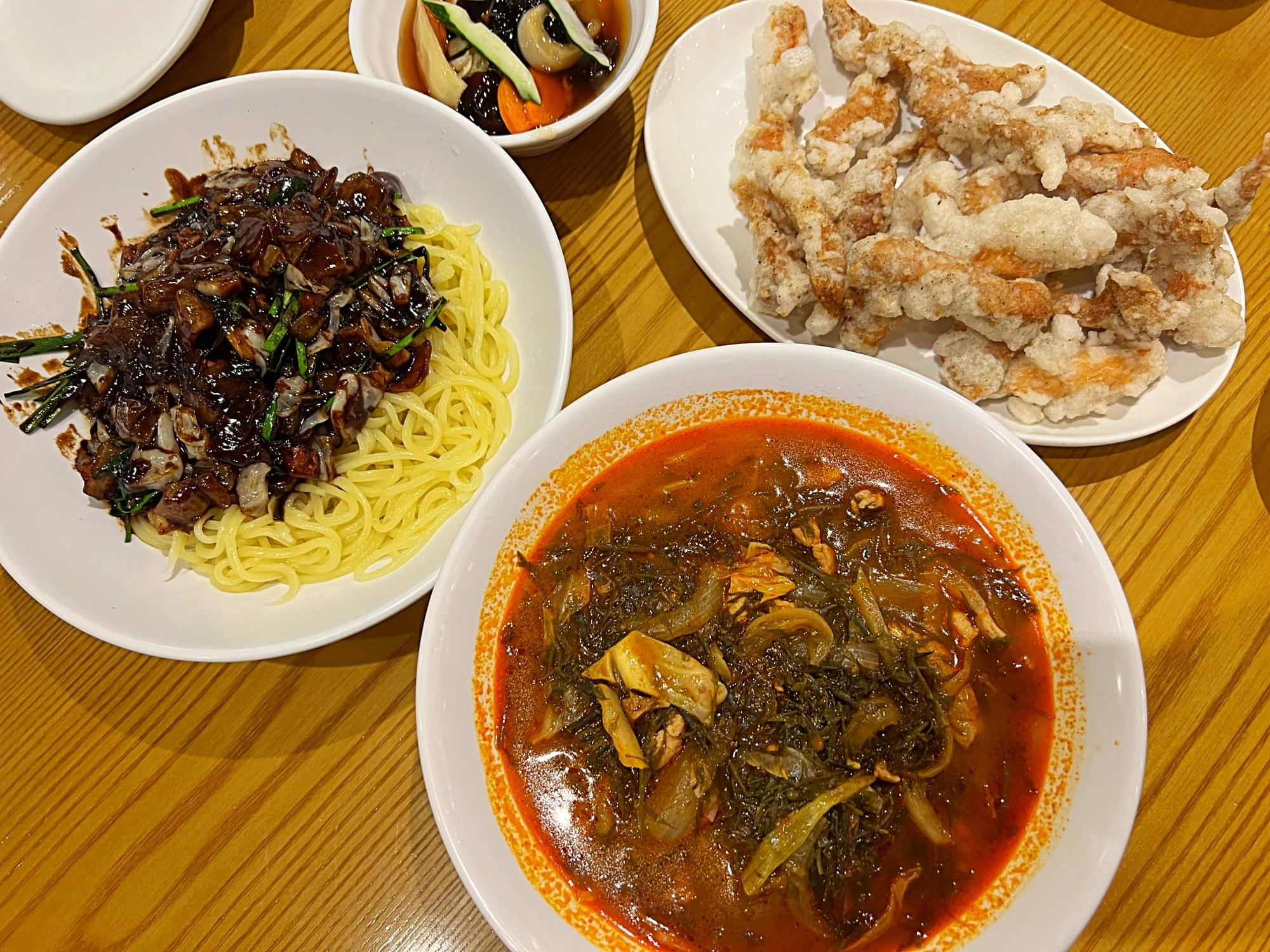 드디어 주문한 식사가 나왔습니다. 남편은 짜장면, 저는 몸짬뽕, 그리고 메인 탕수육입니다. 저는 찍먹이라 탕수육에 소스가 뿌려져 나오는 걸 별로 좋아하지 않습니다. 전혀 안찍어 먹고 온전히 튀김 그자체 맛으로만 먹는 편입니다.