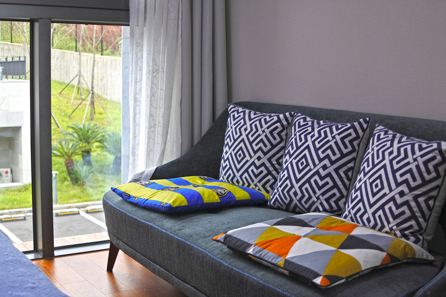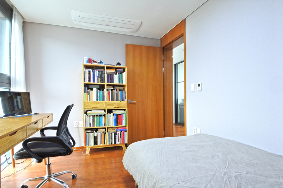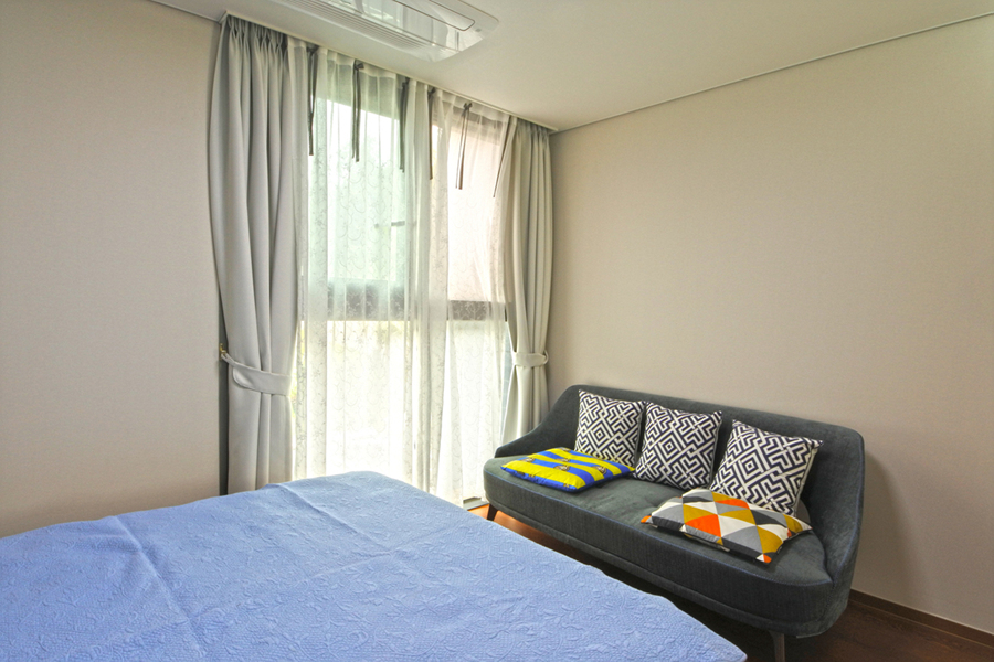 킹사이즈 침대와 3인쇼파를 놓고도 공간이 넓습니다. 창 밖으로는 1,2동의 모습이 보입니다.