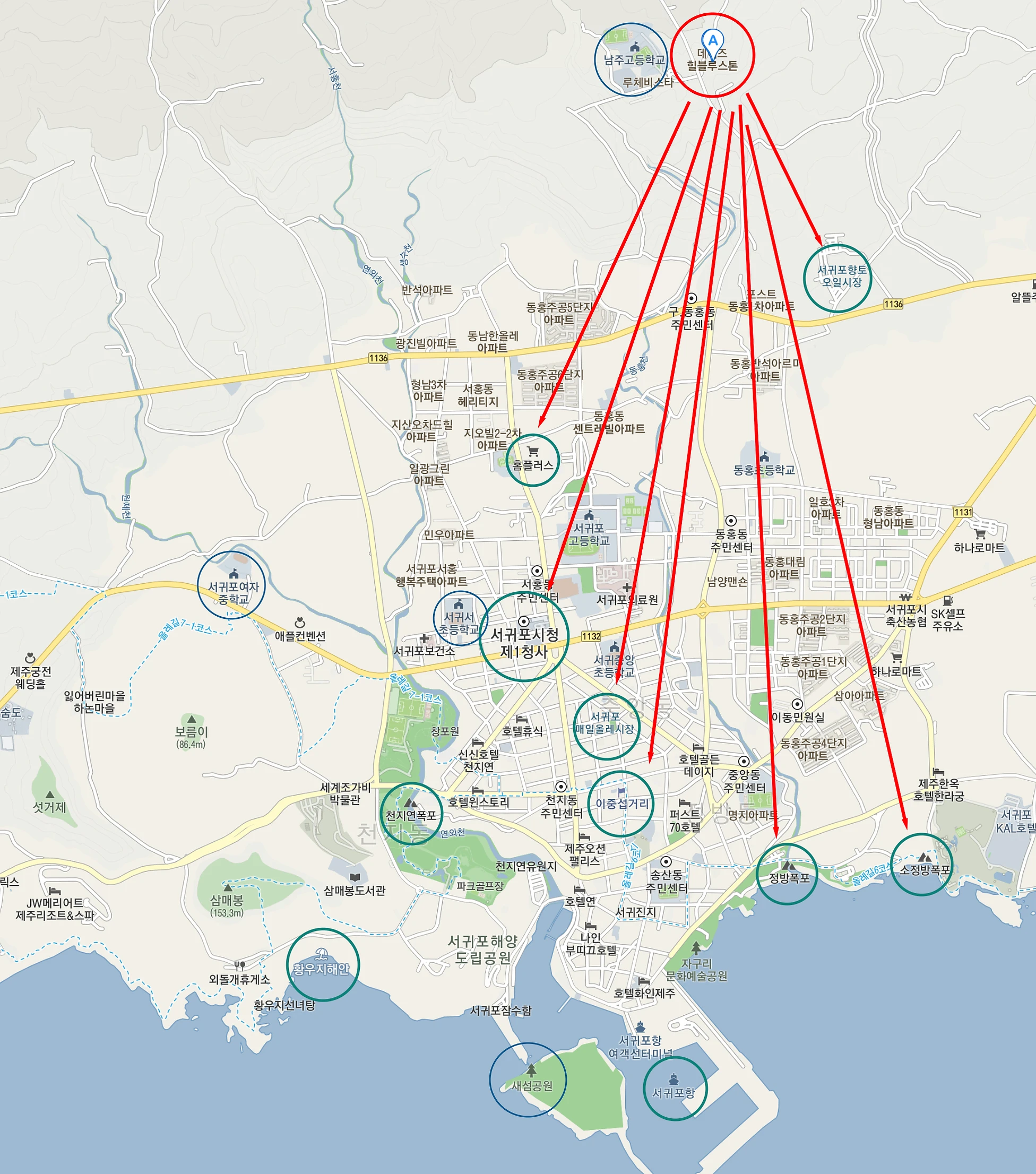 홈플러스 5분거리, 서귀포시내 차로 10분이내 모두 가능합니다. 관광지 많아 돌아 볼 곳도 많은 곳입니다. 올레길도 예쁘답니다.
