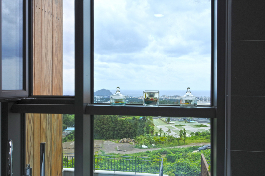 비오는 날 1층 거실에서 바라본 서귀포 바다 입니다. 앉아만 있어도 힐링이 되는 아름다운 전망이에요.