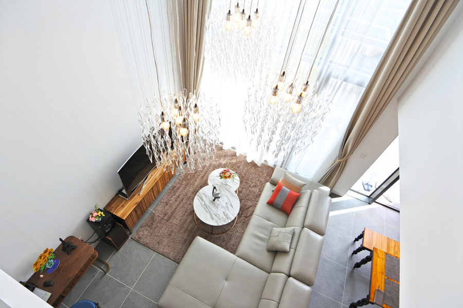 2층에서 내려다 본 1층 거실의 모습입니다. 샹들리에가 예쁘게 걸려 있습니다.