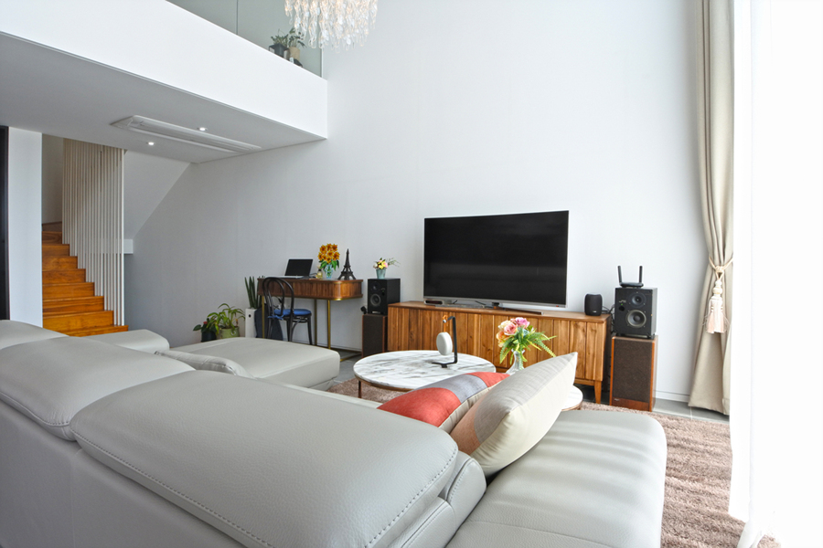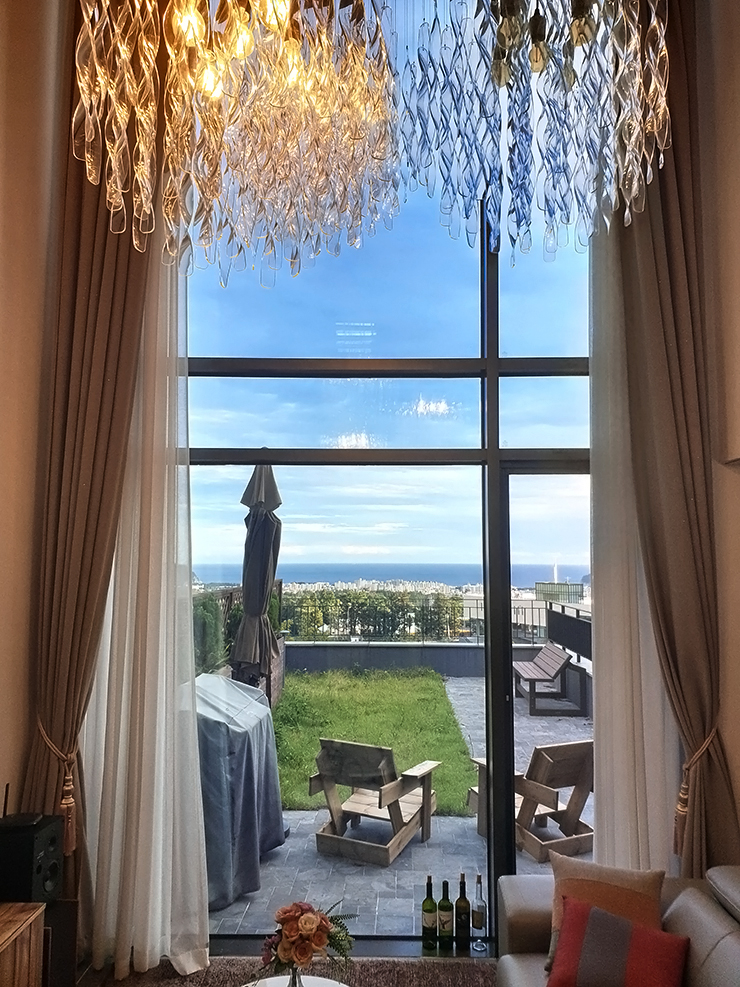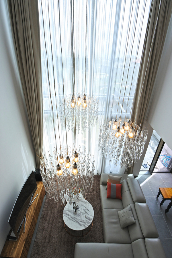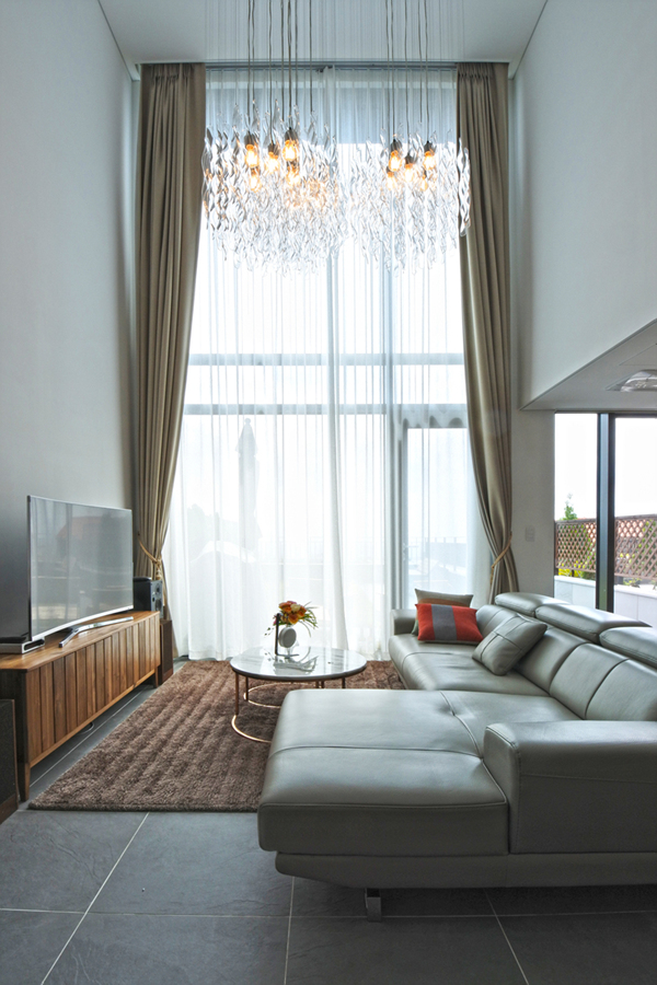 1층은 거실과 높은 층고로 이루어져 있습니다. 커텐도 전동커턴을 달아 리모컨으로 움직여야 합니다. 1백만원 가량 비용들여서 설치한 겁니다. 이 타운하우스는 옵션이 하나도 없는 집입니다. 입주할때 에어컨 6대 값도 따로 지불하고 들어갔어요.