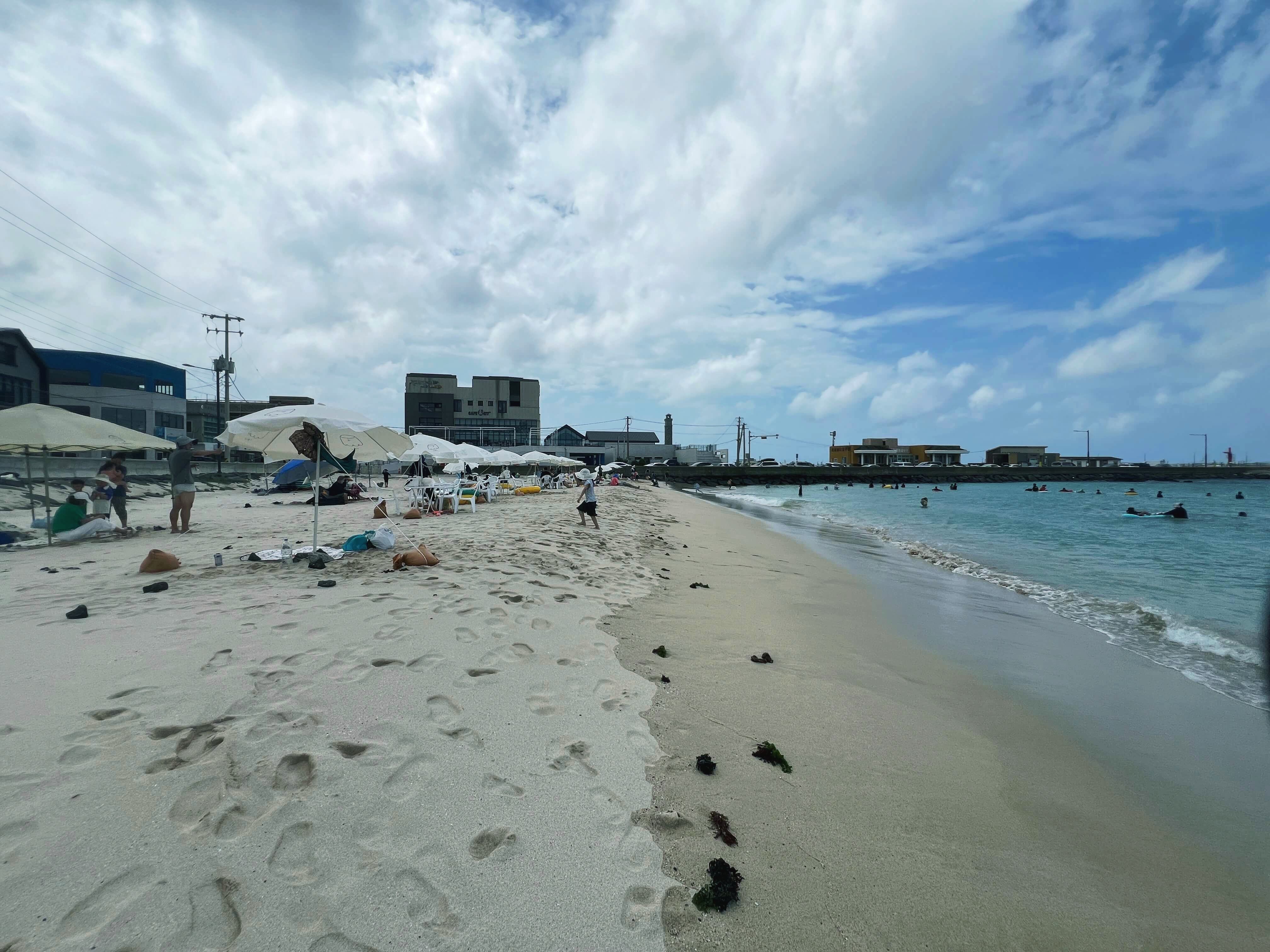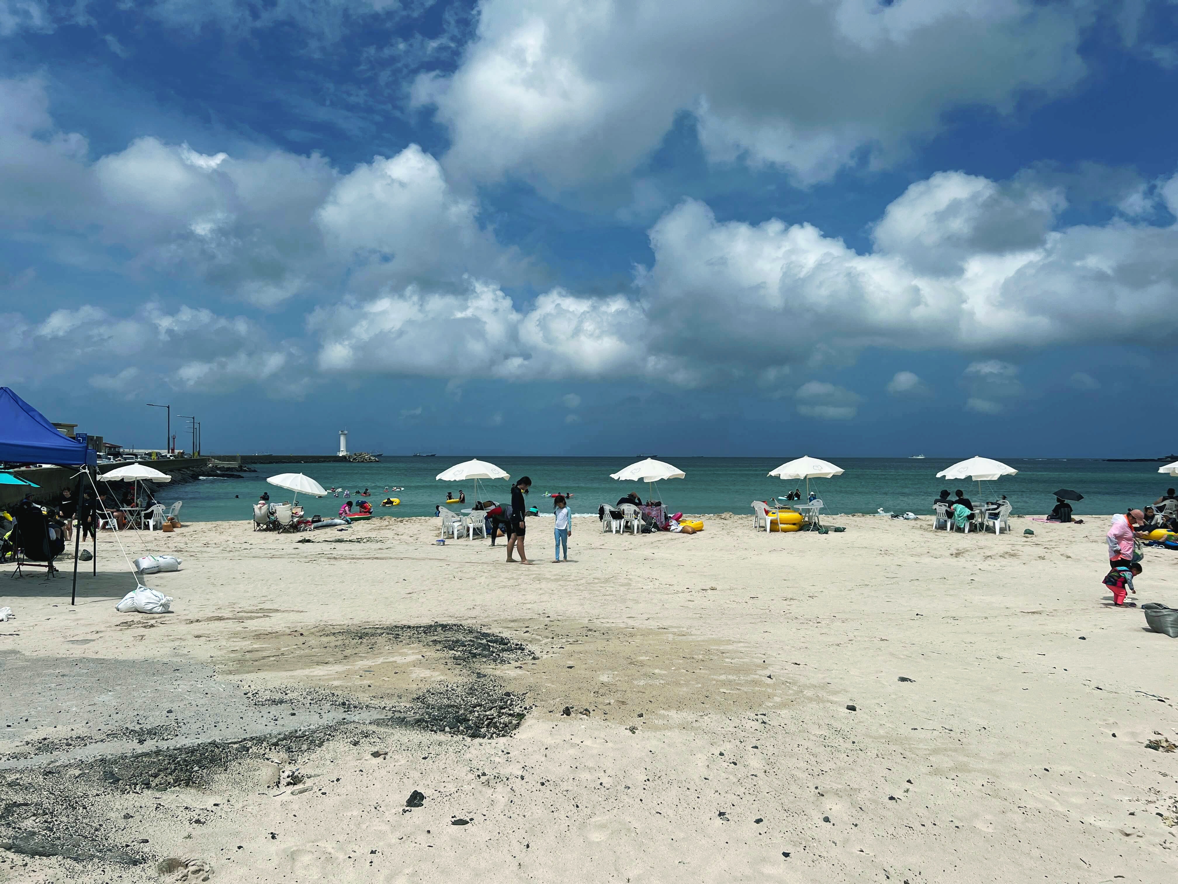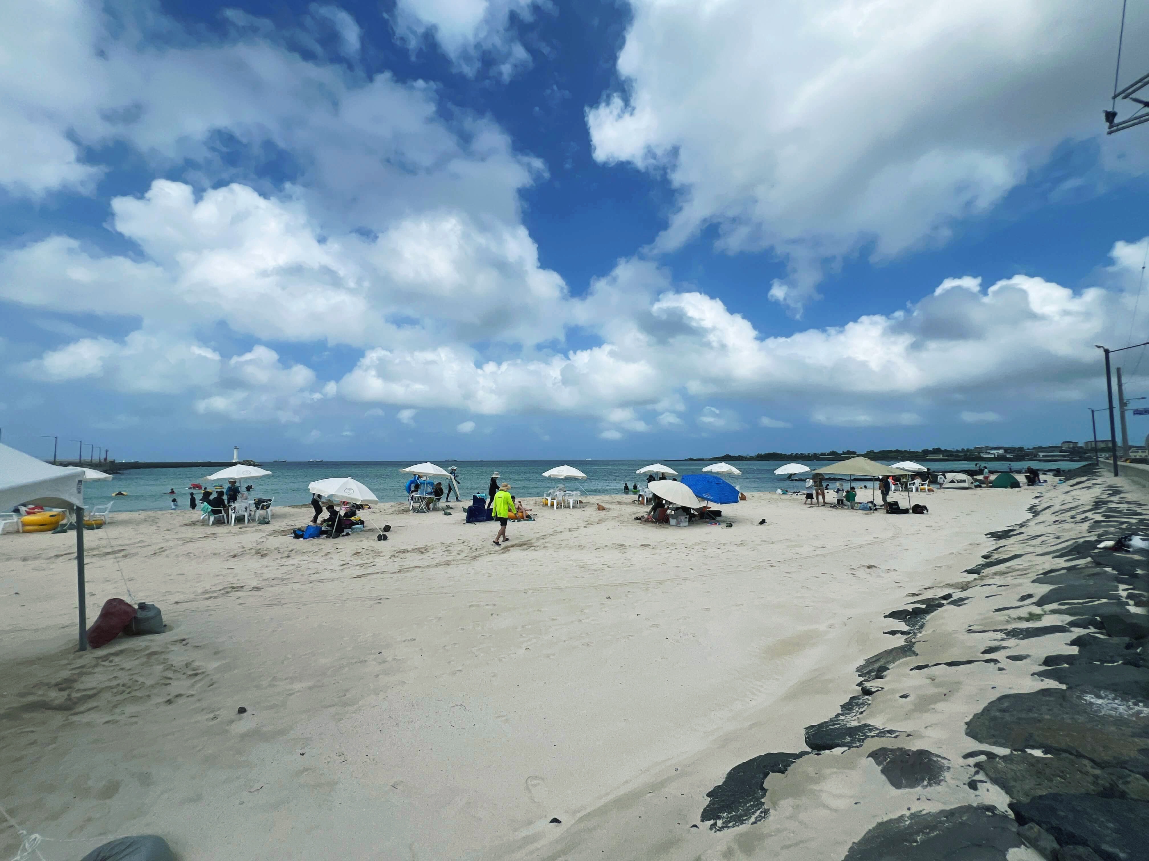 제가 찾아갔던 지난 금요일의 모습입니다. 물이 만조가까이 차오르던 시간이었음에도 모래사장이 잠기지 않는걸 보니 많이 모래를 많이 쌓아 올린 듯 합니다. 빨강 파랑이 아닌 흰색 파라솔이 설치 되 있으니 더욱 해변이 돋보였습니다. 파라솔에는 우무의 로고가 새겨져 있는 걸 보니 협찬 받은 모양입니다. 해변은 세화리 연합청년회에서 관리하는 것 같아 보였습니다.