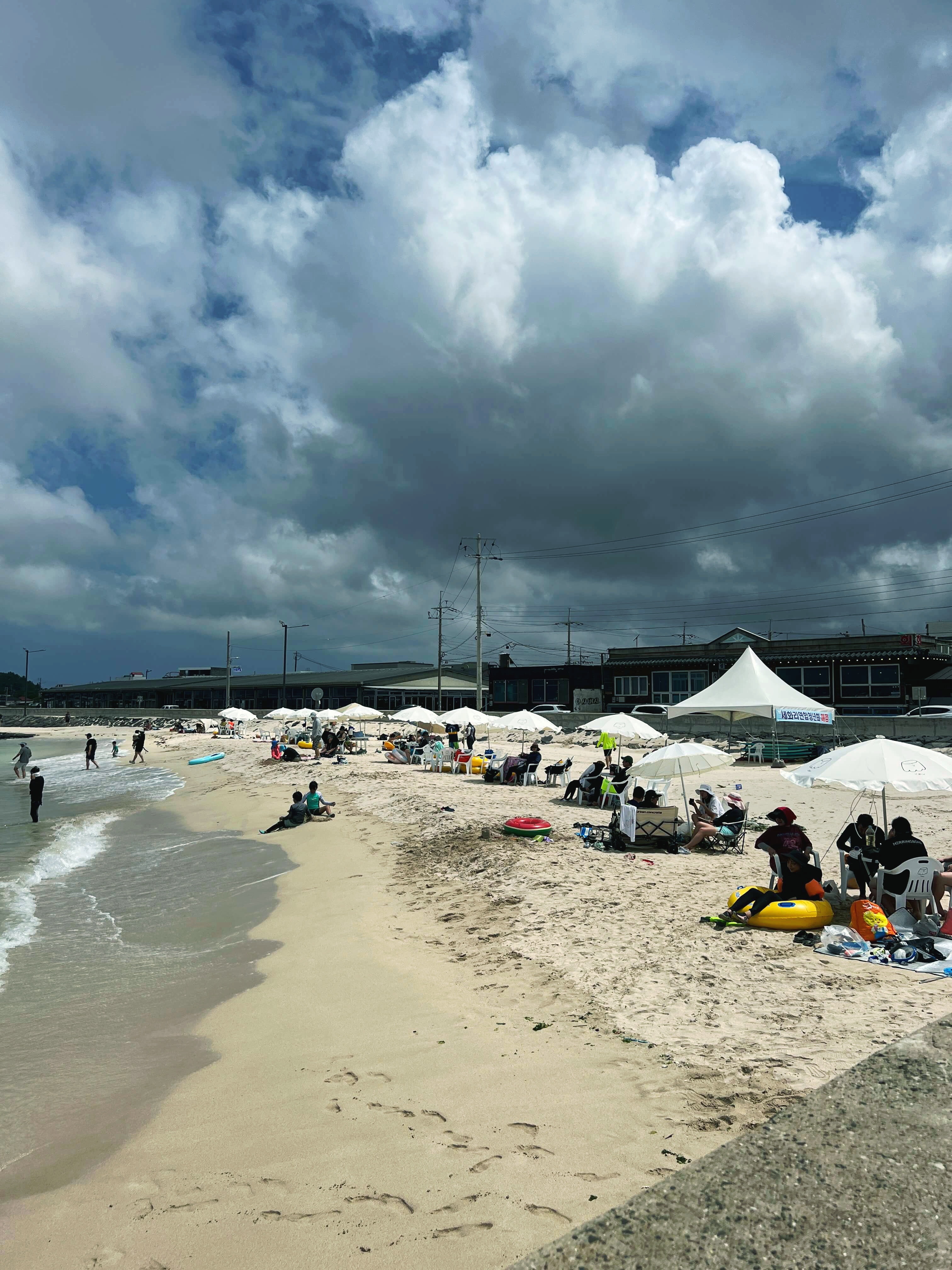 테트라포트로 설치되있던 곳인데 2년 전 재정비 사업 이후 돌담으로 예쁘게 정비 되면서 해변도 더 예쁘게 변했네요. 조수간만의 차이에 따라 물높이가 완전 달라지던 이곳은 만조때는 거의 모래해변이 없을 정도 였습니다. 정비 후 모래를 좀 쌓아 올린 것 같아요. 이렇게 파라솔을 치고 물놀이할 수 있을 만큼의 해변이 생겼으니 말이에요!