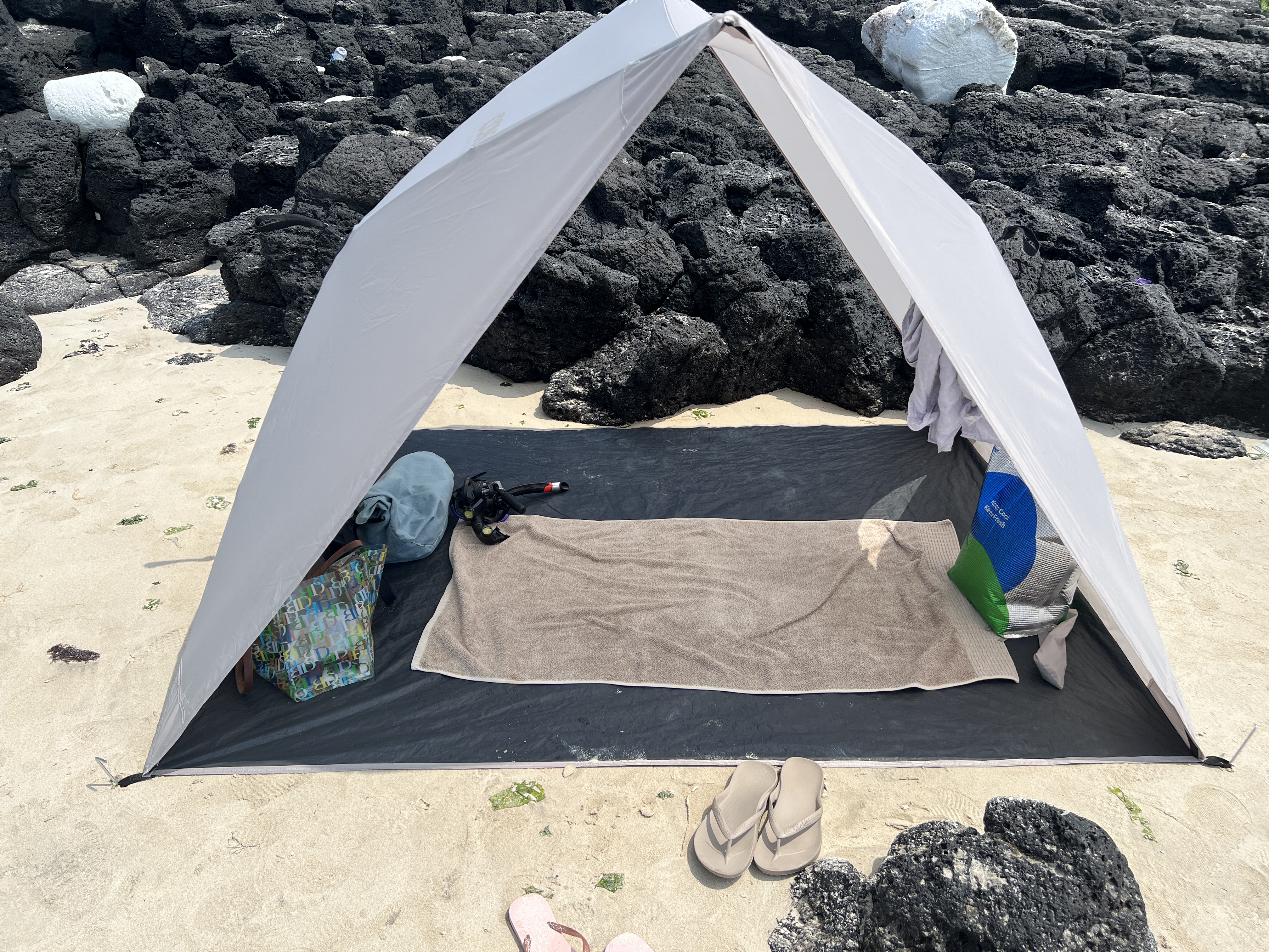 저희가 자리한 곳은 바다바 바로 보이는 물빠지 바위 앞쪽이었습니다. 자리를 잘 맡았지요. 낮시간동안 즐기며 오기엔 안성맞춤인 자리였습니다. 우산처럼 펼쳤다 접었다 할 수 있어 편리한 그늘막입니다. 저혼자서도 1분만에 펼칠 수 있어 간편하고 접는 것도 쉽습니다. 작년까지는 파라솔을 가지고 다녔었는데 햇빛의 방향에 따라 자리를 옮겨야 하는 불편함이 있었어요. 깊게 파라솔을 박지 않으면 바람에 쉽게 뽑혀서 애먹기도 했는데 이 그늘막텐트는 팩 4개만 박으면 되니 아주 편리하네요. 남편이 가성비 짱이라며 인터넷서 6만원대 구매한 제품이라고 합니다. 2인이 사용하기에 딱 좋습니다.