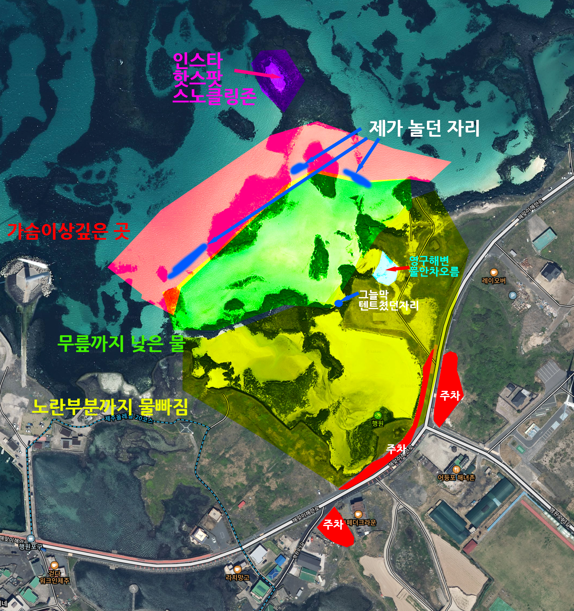지도에서 핫스팟이로 되있는 부분은 최근 인스타에서 드론으로 찍은 영상을 보고 발견한 곳입니다. 집에와서 찾아 본 후라 가보지는 못했어요. 다음에 한 번 가보려구요. 스노클링하기에도 좋고 영상을 보면 바위에 사람들이 앉아서 쉬는 모습도 보입니다. 물이 최대한 빠졌을 때 갈 수 있을 듯해 보입니다.