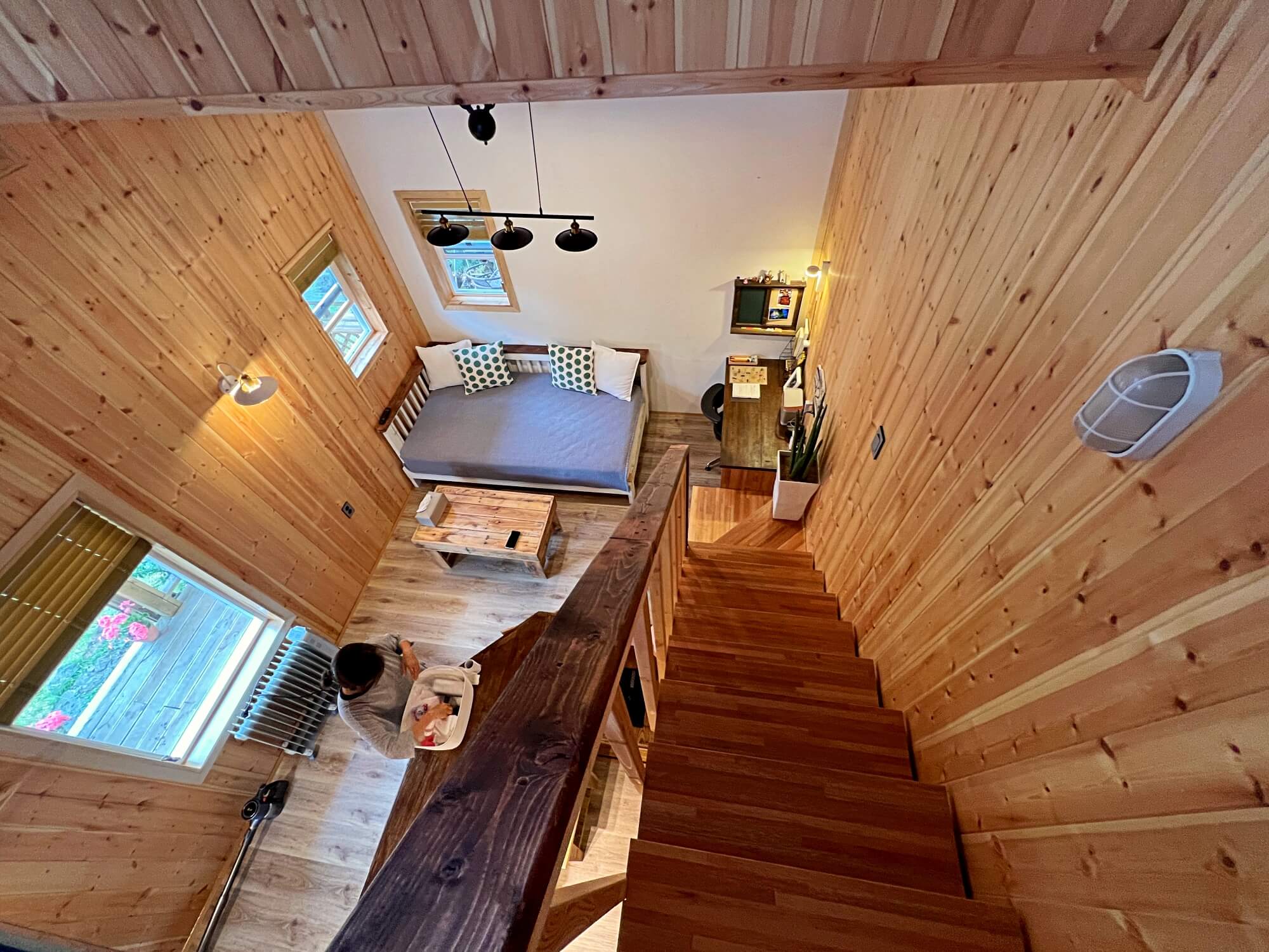 독특한 구조의 복층 공간으로 침실이 2층공간에 있고 3층까지 되있는 복층입니다.