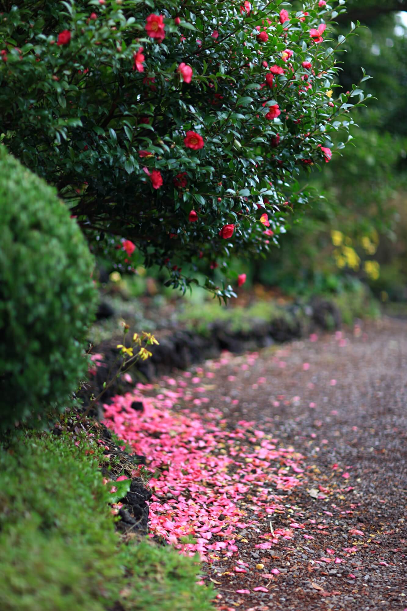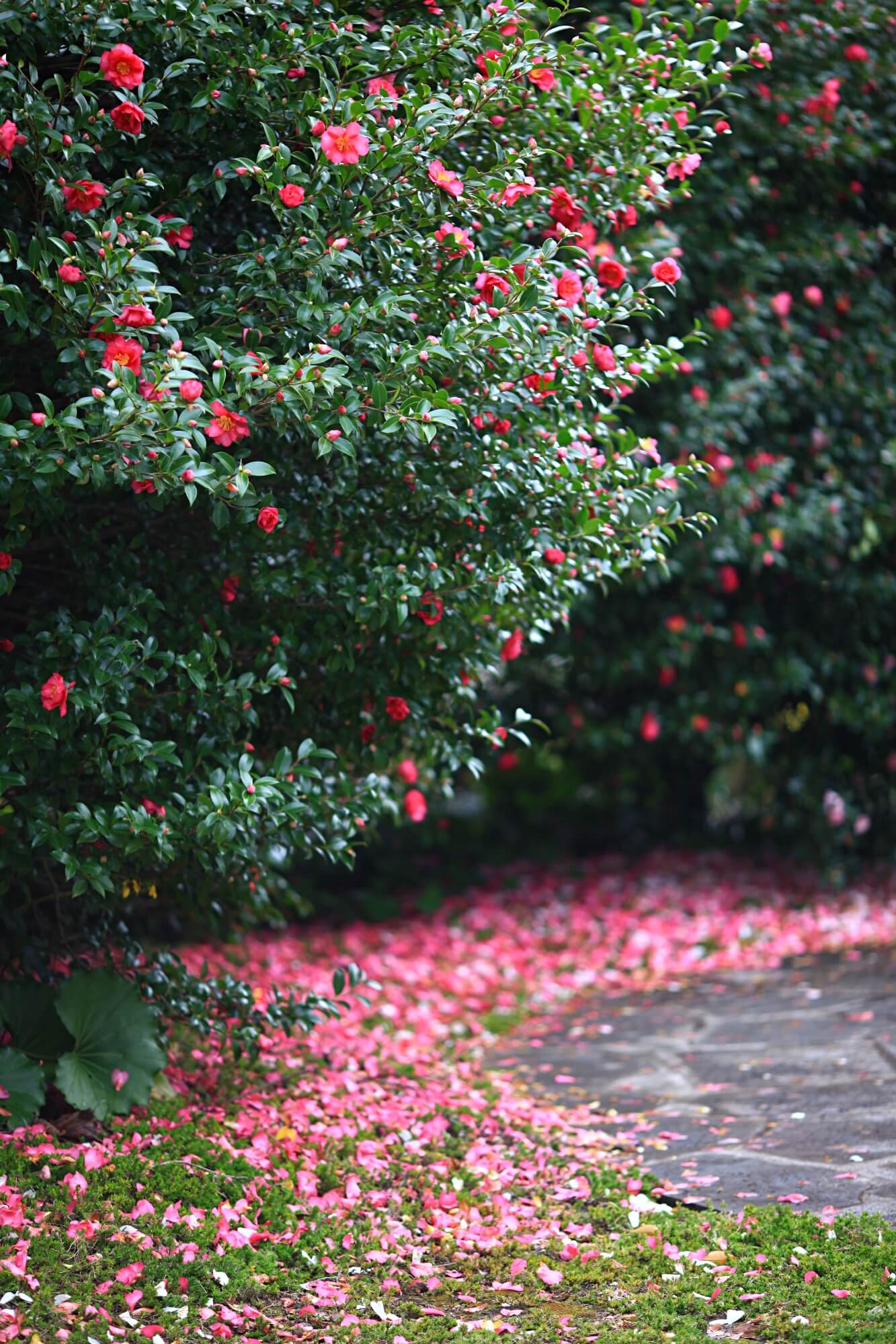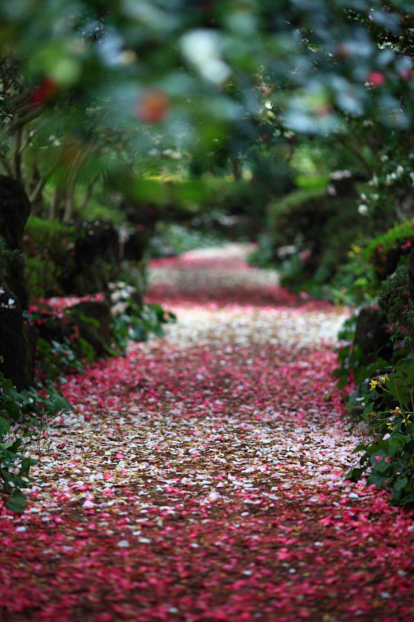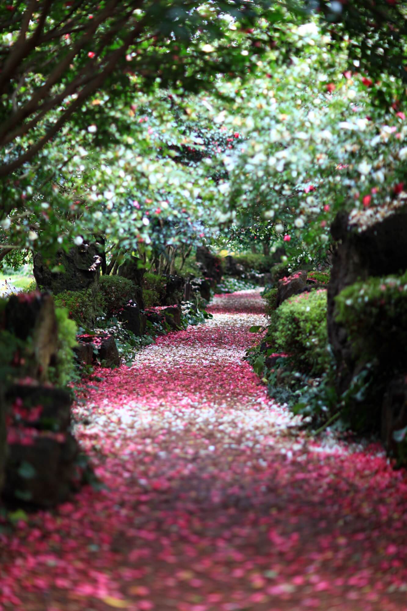 하얀동백과 빨간동백이 어우러진 동백터널입니다. 거센 바람에 순식간에 떨어진 꽃잎들이에요. 이른시간에 찾아갔어서 사람도 없었고 아무도 밟지 않은 예쁜 길을 바라볼 수 있었습니다. 꽃망울이 아직 덜 터진 것들이 많아 이미 활짝 핀 꽃들은 모두 떨어져버린 것 같아요. 동백나무에 꽃이 워낙 많은 송이를 이루기 때문에 바람에 떨어져도 또 피고 지고 겨울 내내 예쁜 모습을 선사해주는 아름다운 꽃입니다.