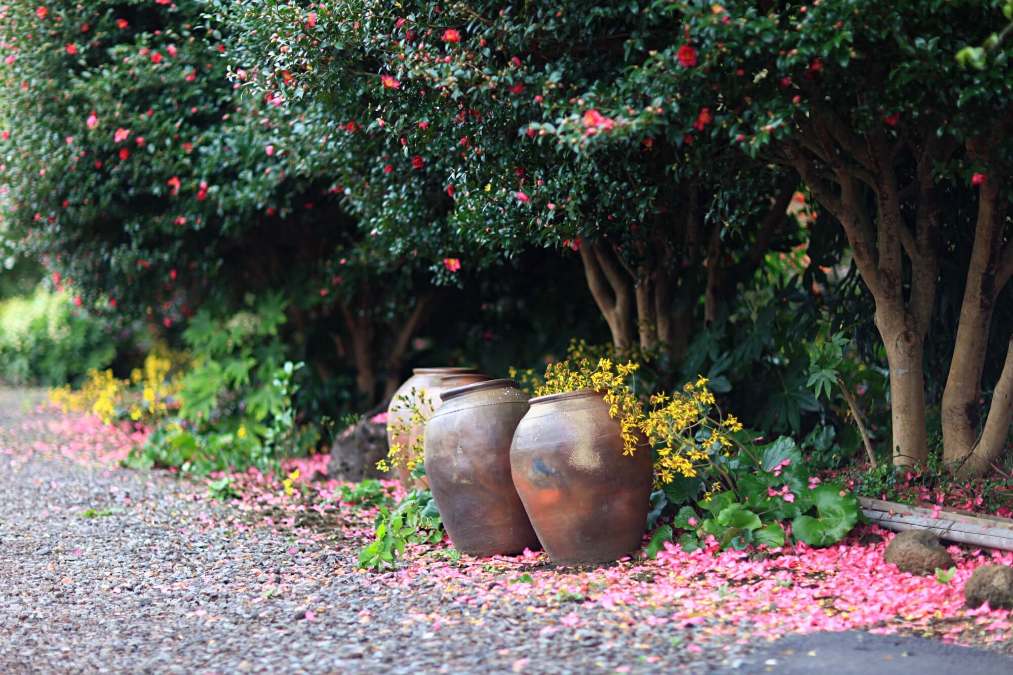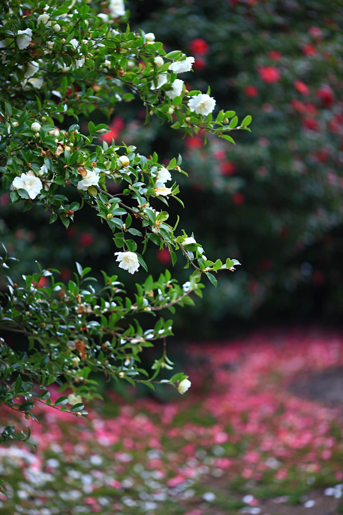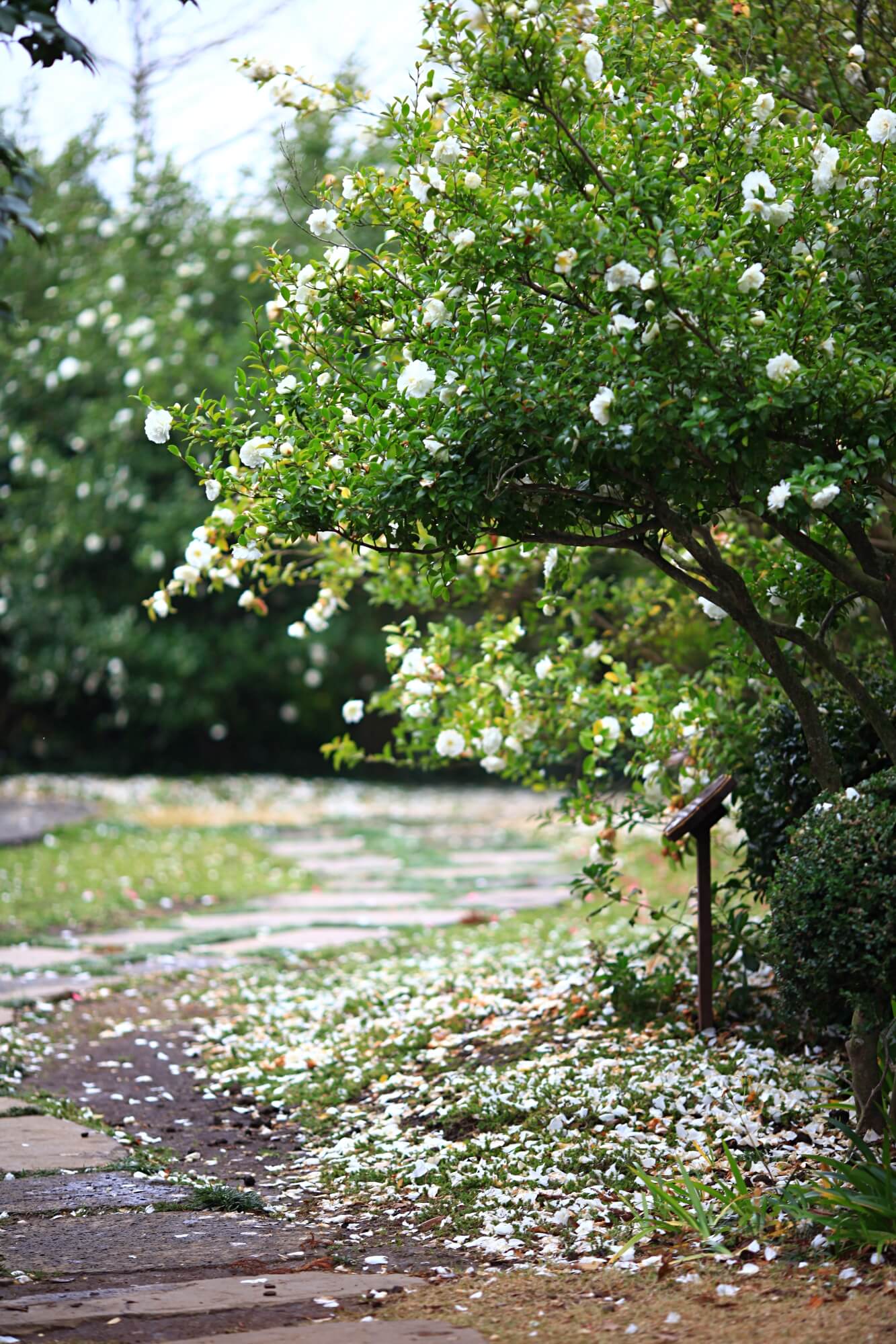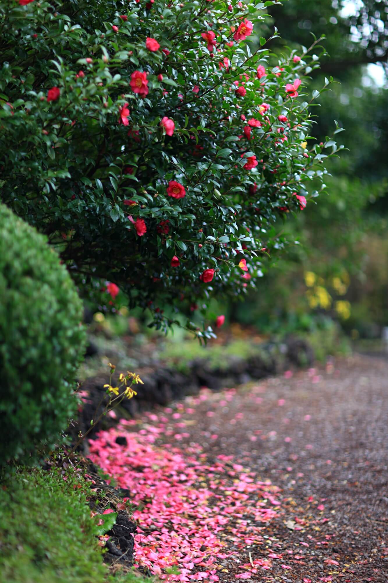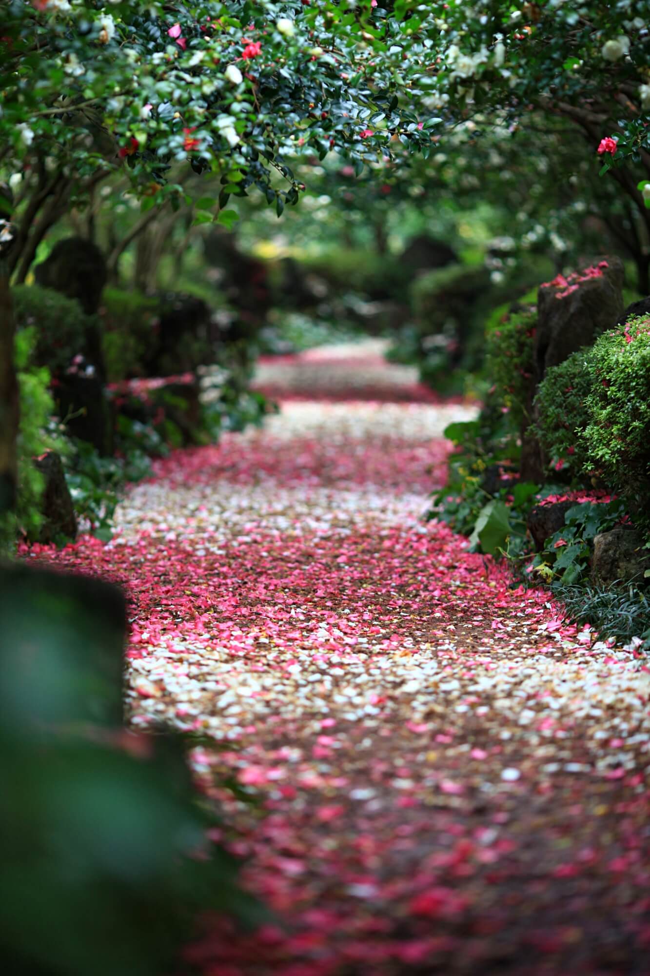 하얀동백과 빨간동백이 어우러진 동백터널입니다. 거센 바람에 순식간에 떨어진 꽃잎들이에요. 이른시간에 찾아갔어서 사람도 없었고 아무도 밟지 않은 예쁜 길을 바라볼 수 있었습니다. 꽃망울이 아직 덜 터진 것들이 많아 이미 활짝 핀 꽃들은 모두 떨어져버린 것 같아요. 동백나무에 꽃이 워낙 많은 송이를 이루기 때문에 바람에 떨어져도 또 피고 지고 겨울 내내 예쁜 모습을 선사해주는 아름다운 꽃입니다.