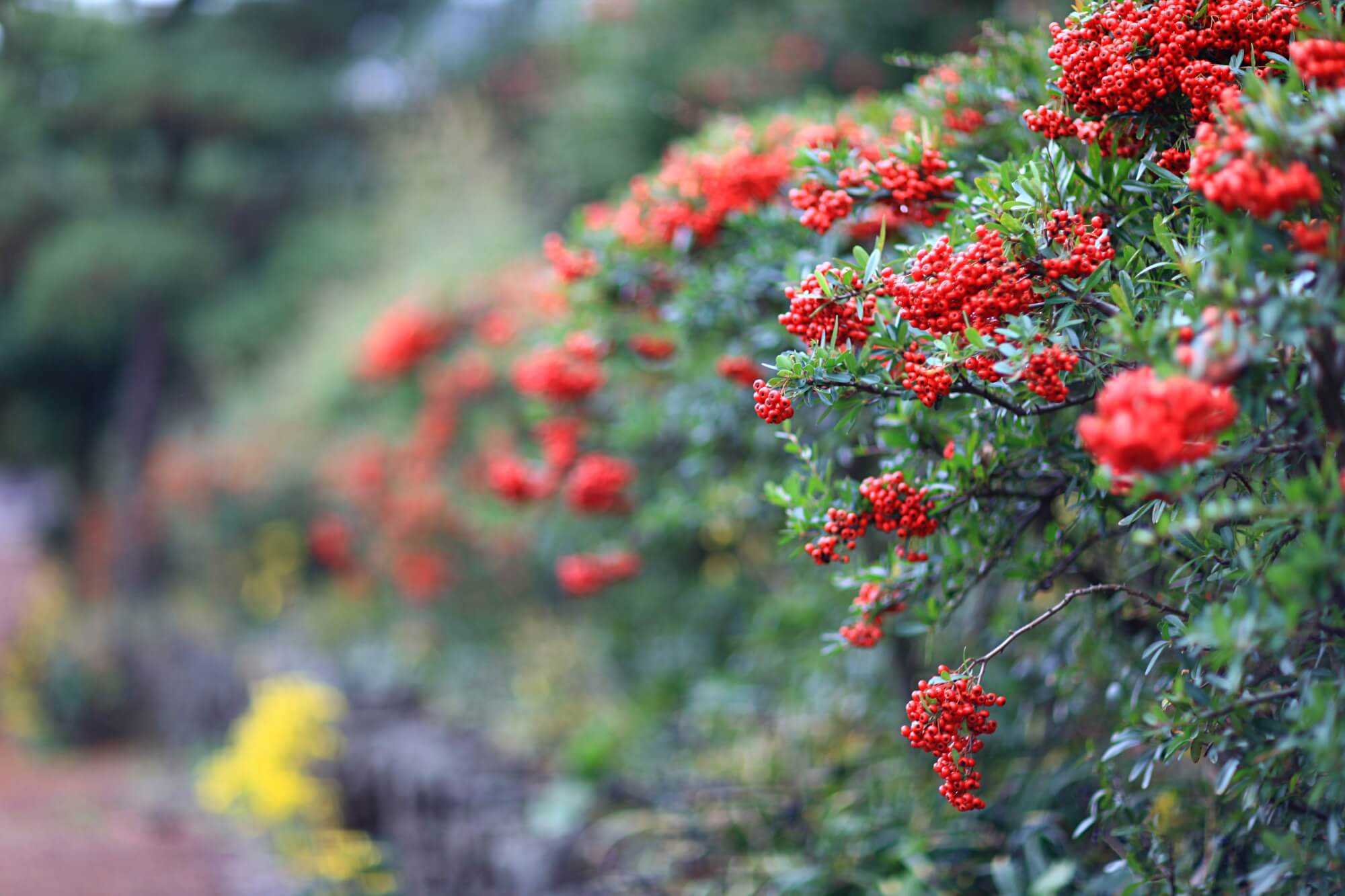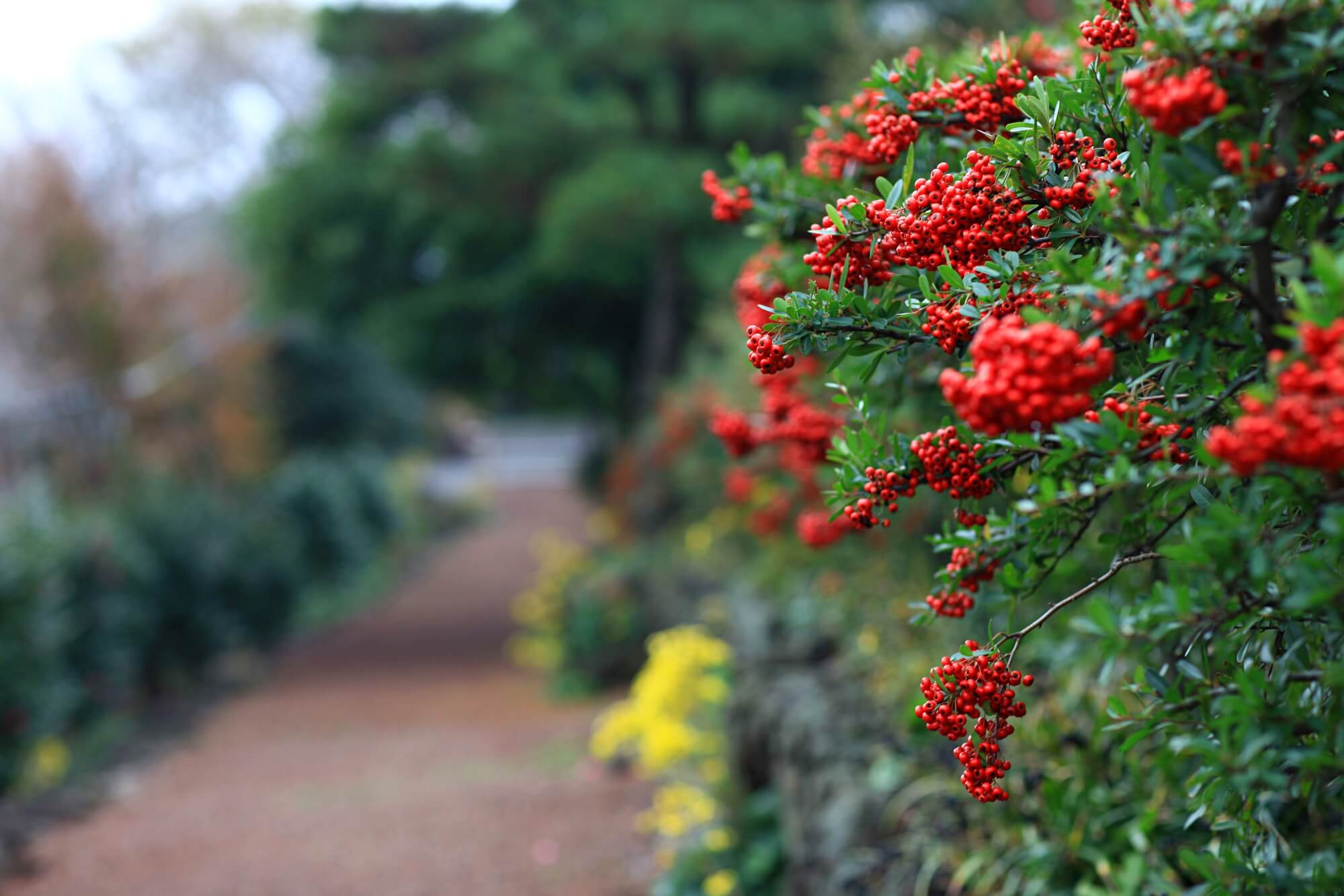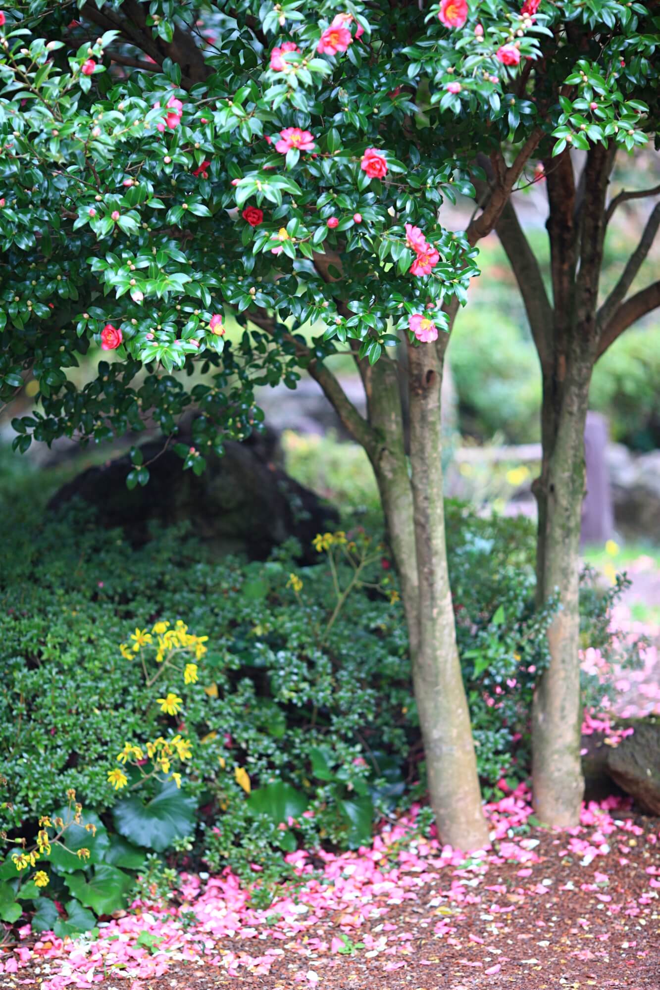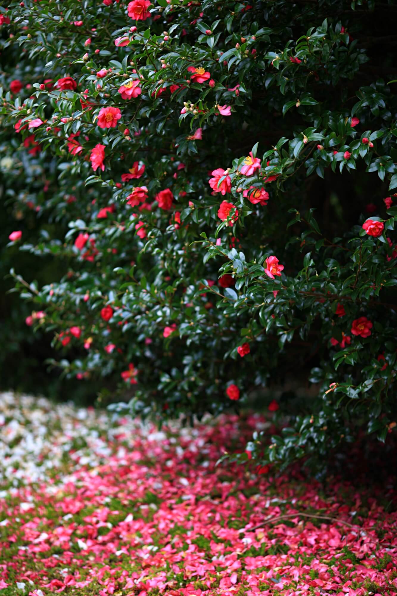 하얀동백과 빨간동백이 어우러진 동백터널입니다. 거센 바람에 순식간에 떨어진 꽃잎들이에요. 이른시간에 찾아갔어서 사람도 없었고 아무도 밟지 않은 예쁜 길을 바라볼 수 있었습니다. 꽃망울이 아직 덜 터진 것들이 많아 이미 활짝 핀 꽃들은 모두 떨어져버린 것 같아요. 동백나무에 꽃이 워낙 많은 송이를 이루기 때문에 바람에 떨어져도 또 피고 지고 겨울 내내 예쁜 모습을 선사해주는 아름다운 꽃입니다.