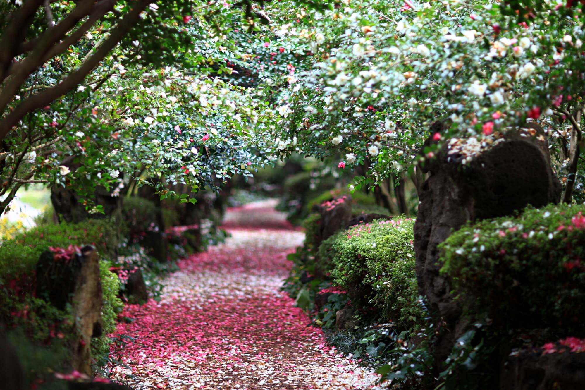 이렇게 예쁜 동백터널은 제주에서 카멜리아힐이 최고인듯 합니다. 몇년동안 동백꽃투어를 많이 다녔지만 저는 카멜리아힐을 가장 꼽는답니다. 하얀꽃과 빨간꽃의 조화가 신비롭고 동화속에 나올 법한 그림같은 풍경이에요.