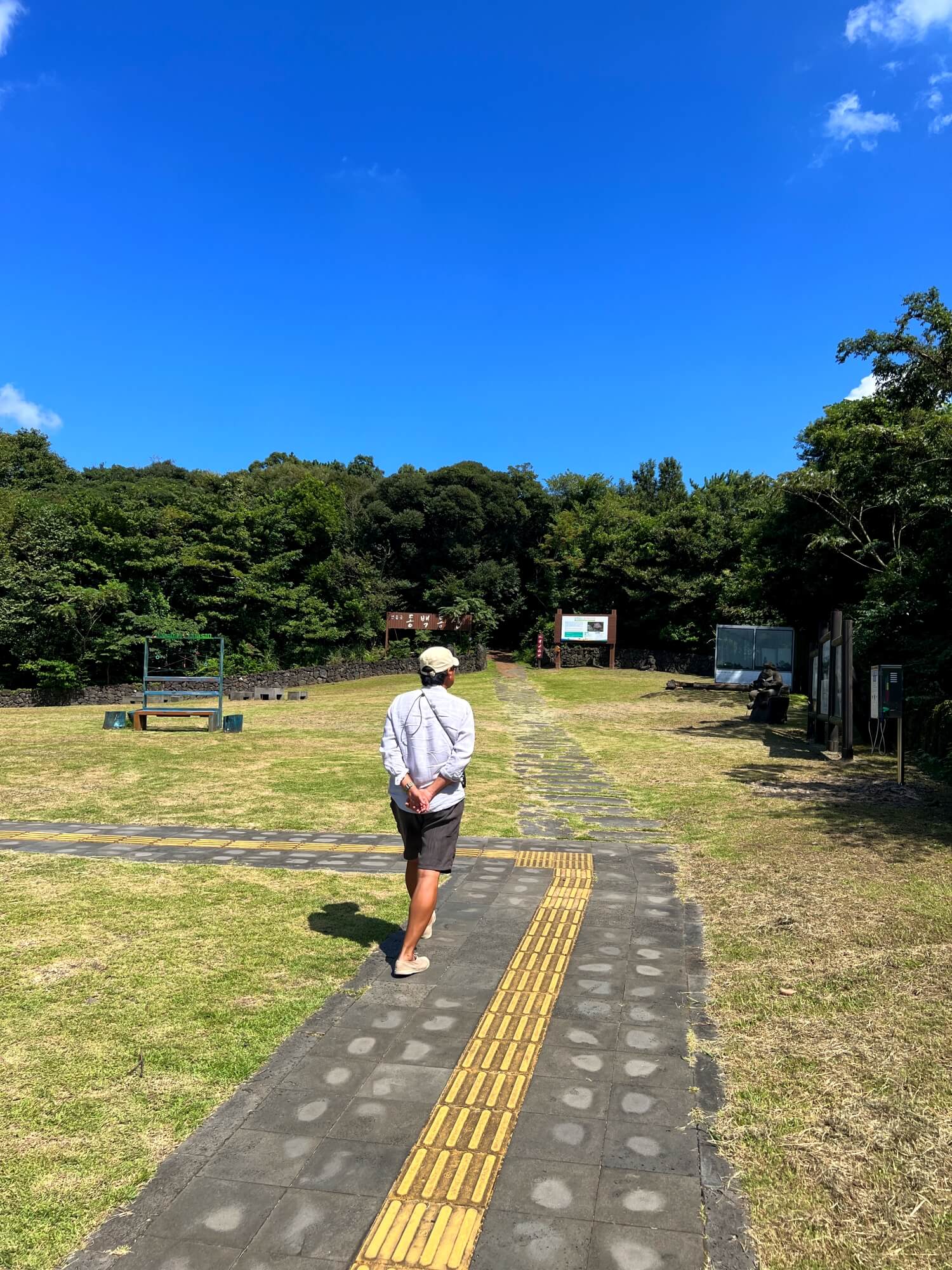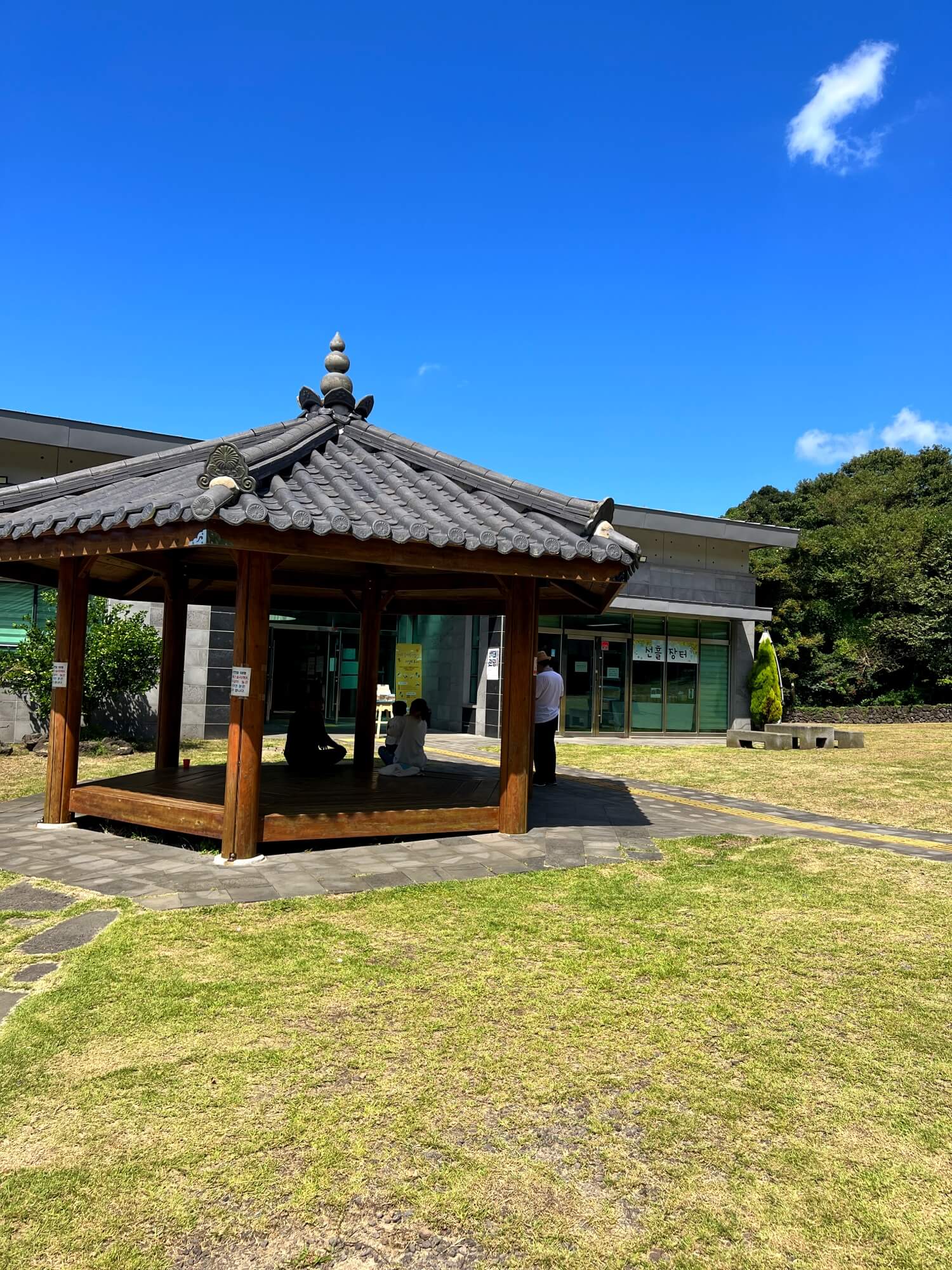 동백동산 입구에는 넓게 깔린 잔디와 정자가 있습니다. 잠시 쉬어가는 곳입니다.