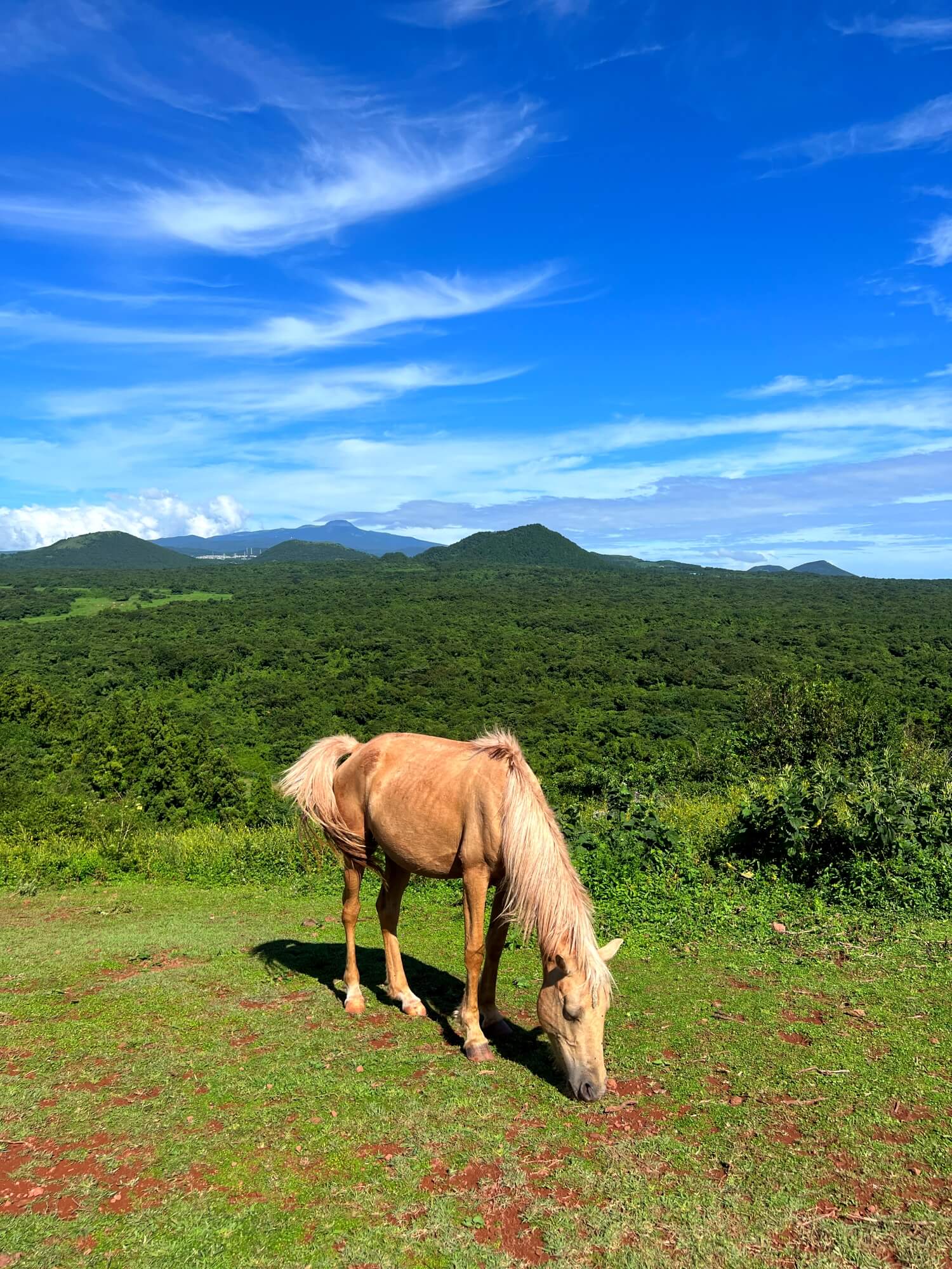 보통은 말 가까이 가는 것을 꺼려했는데 여기 말들은 정말 순하디 순했습니다. 사람과의 친화력이 생겼는지 놀라지도 않고 하던일 열심히 풀을 뜯어 먹고 있었습니다. 바닥에 1cm도 자라지 않은 풀들을 어찌다 잘 뜯어 먹던지 먹는 모습도 너무 귀여웠습니다. 낮은 오름이다보니 높은오름에서 내려다 보이는 풍경과 사뭇다르게 눈높이에 보이는 곶자왈 풍경과 주변의 모습은 정말 아름다웠습니다.