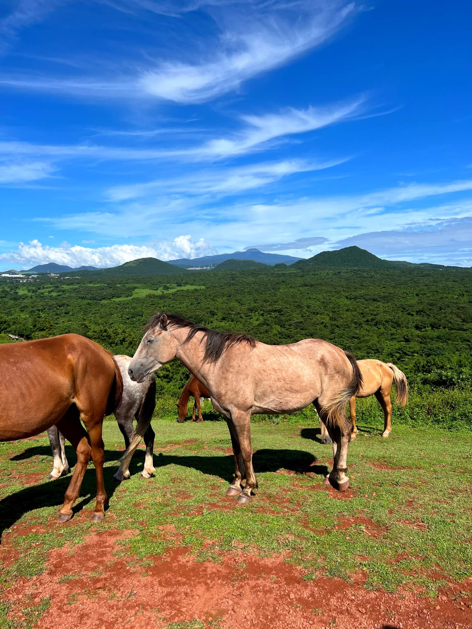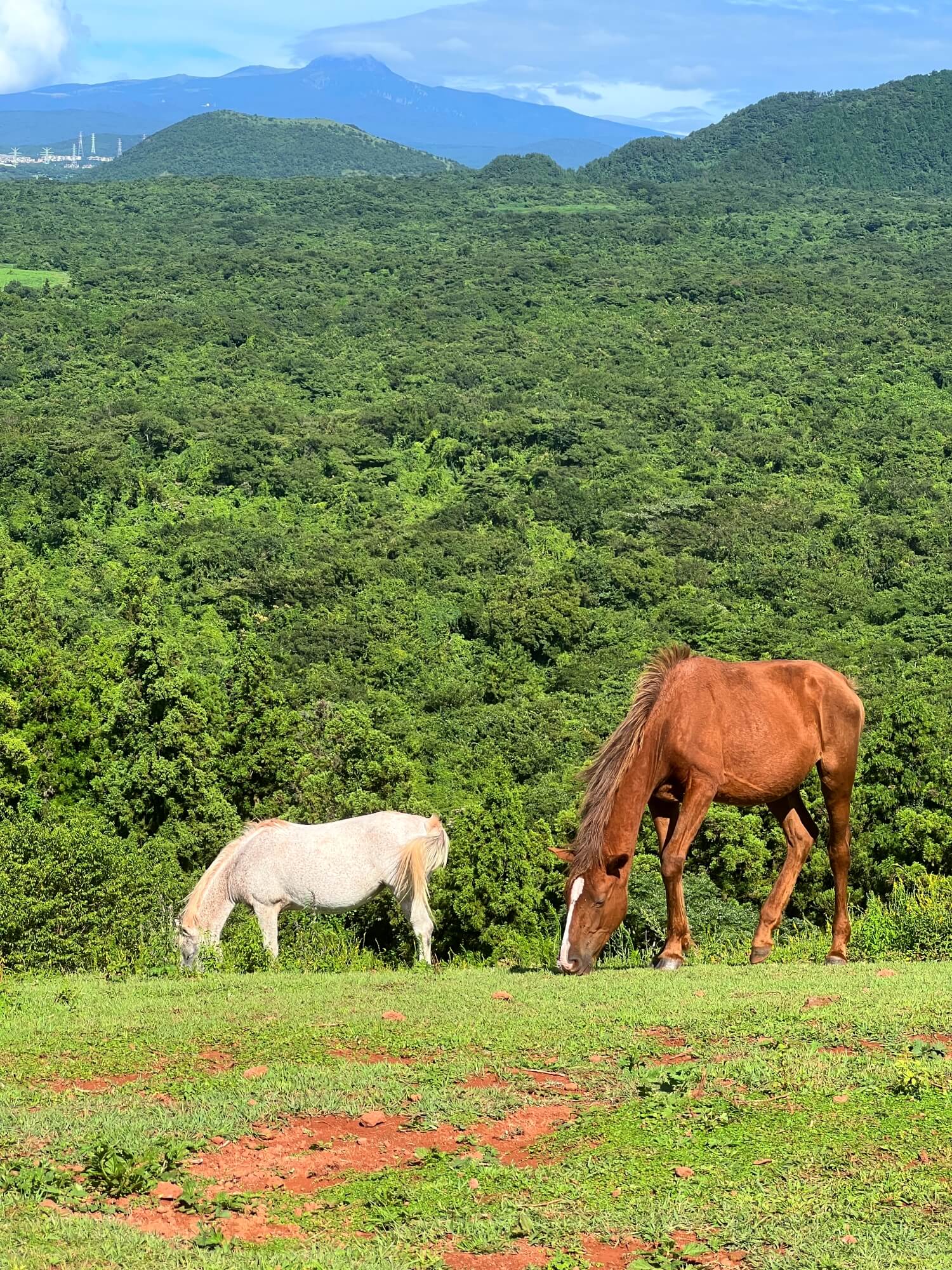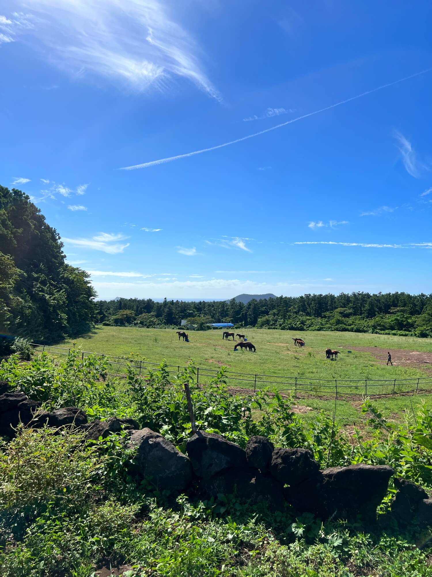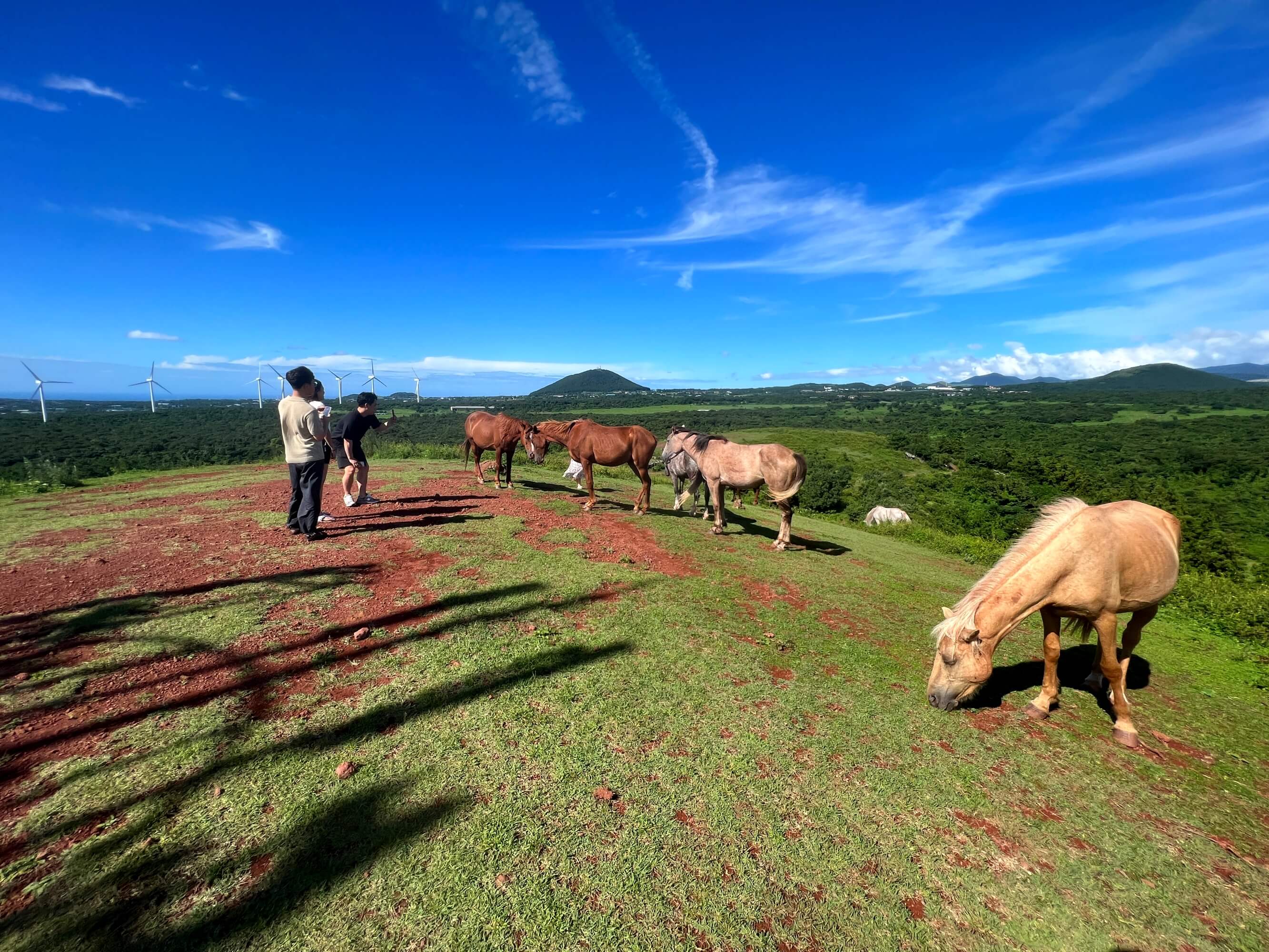 한라산이 정면으로 바라다 보이고 곶자왈로 둘러싸여 있는 주변이 정말 자연속에 들어와있는 기분이었습니다. 사람들은 말과 함께 사진찍으며 인생샷을 담기에 바빴습니다. 그런 말들은 아랑곳하지 않고 즐기는 듯 서있었어요. 말과 함께 하는 오름의 풍경은 행운이 조금 따라야 될 것 같습니다.