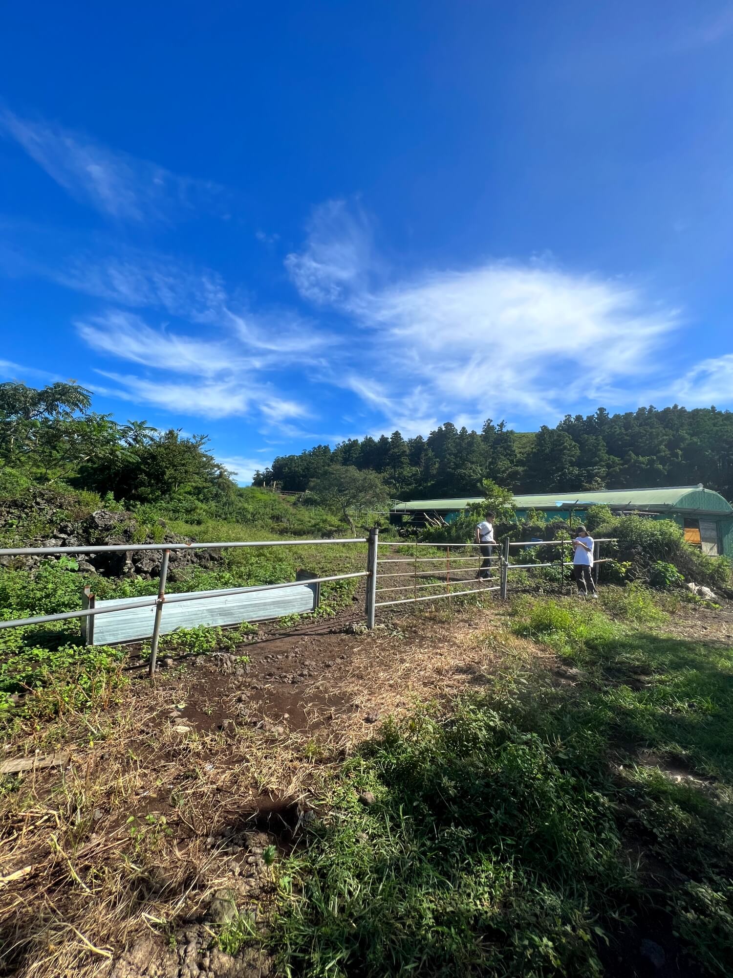 오름 올라가는 중간에 통과하는 철로된 통로가 막힌것처럼 보이지만 말들이 이동하지 못하도록 막아 놓은거라 약간 숙여서 들어가시면 됩니다. 당황하지 마시고 들어가세요! 그곳을 통과해 조금만 올라가면 저 멀리 말들이 풀을 뜯고 있는 모습이 보입니다. 항상 말을 볼 수 있는 건 아닌것 같은데 말들이 정상에서 놀고 있었어요.